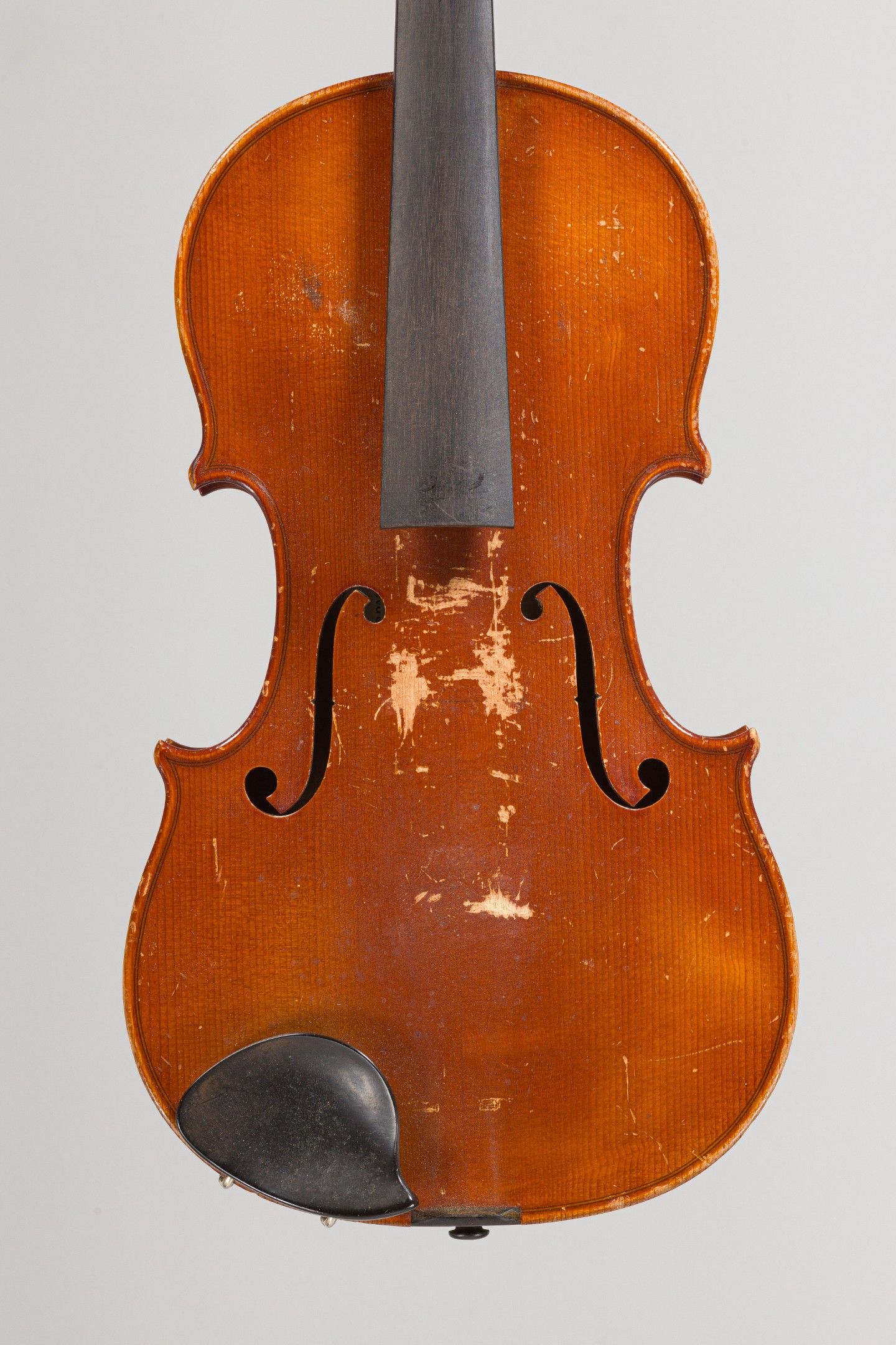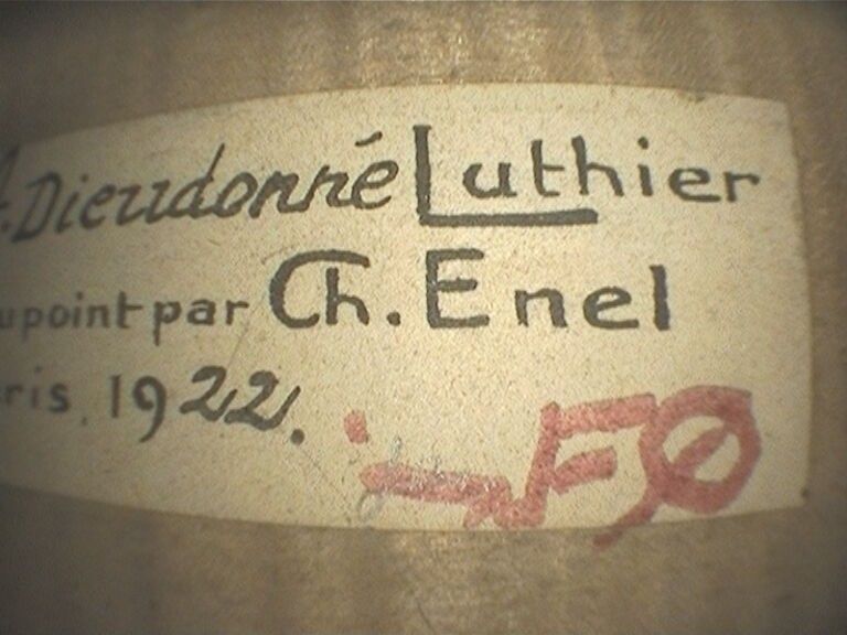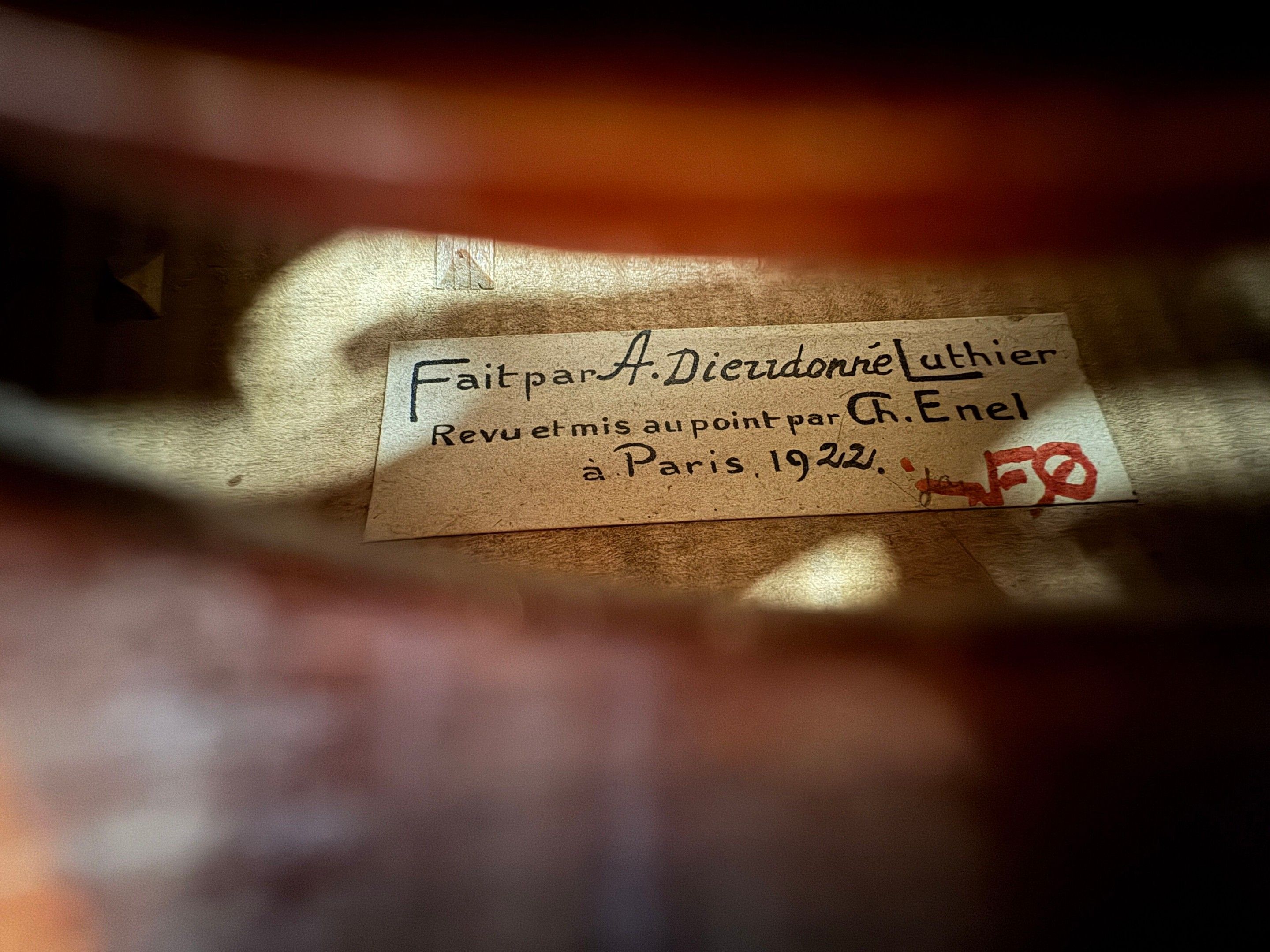 Violon d'Amédée DIEUDONNE, fait à Mirecourt vers 1920-1922, fini et vendu par Charles Enel à Paris en 1922 ; portant étiquette Fait par A. Dieudonné et étiquette Revu et mis au point par Ch. Enel. Traces d'usage sur la table. 359mm. [VREXP1] On joint une lettre de Charles Enel.