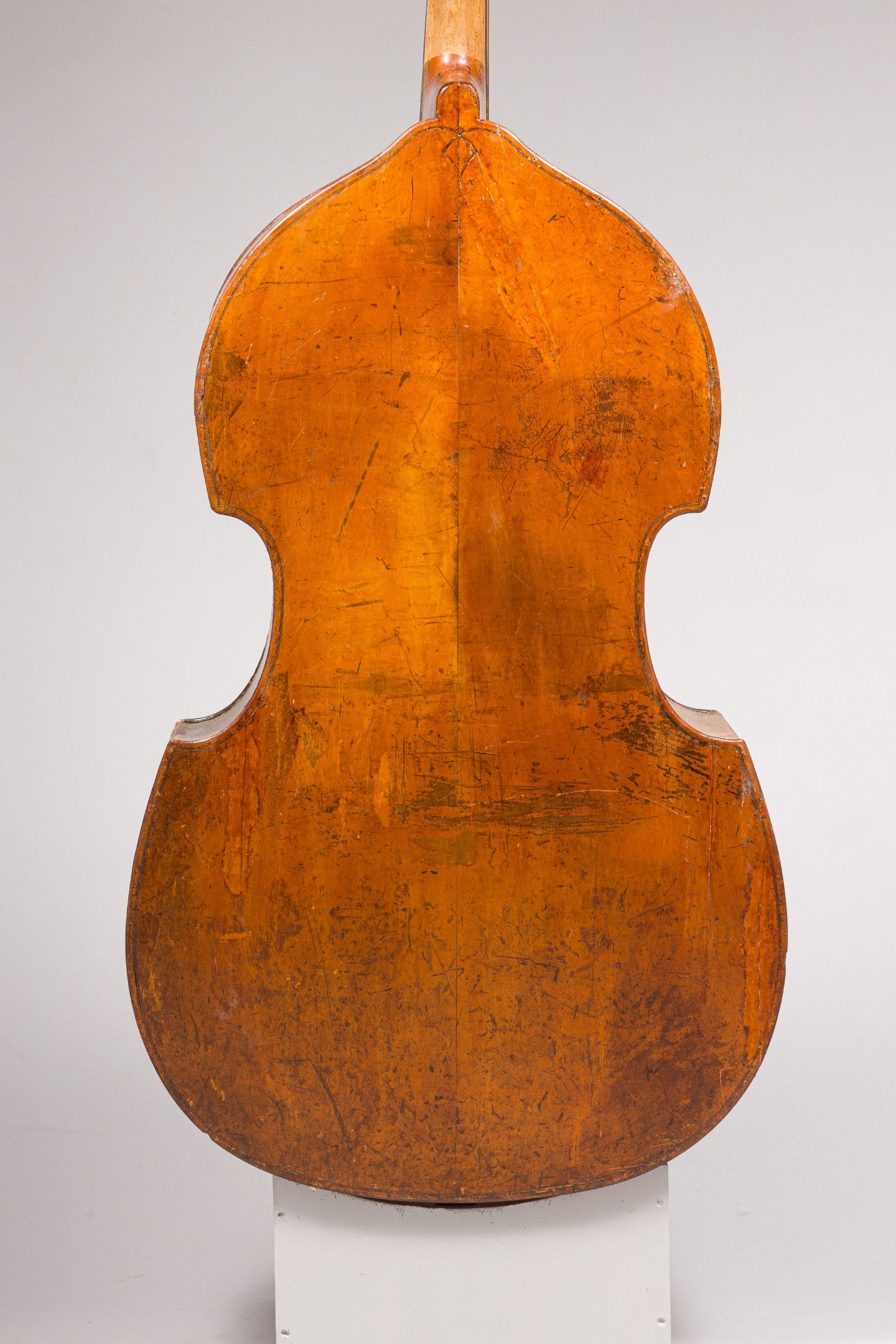 Contrebasse à quatre cordes, probablement des Pays de l'Est. Différentes cassures et restauration sur la table, le fond et les éclisses. Long totale : 950mm ; larg haute : 450mm ; larg au C : 320mm ; larg inf : 580mm ; long cordes vibrantes : 880mm [VREXP3]