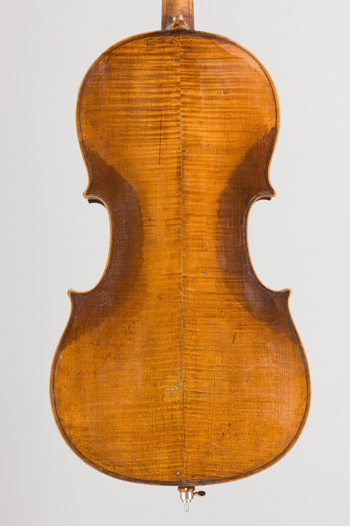 Violoncelle à cinq cordes de Jean Charles FLAMBAU fait à Mirecourt vers 1800 ; portant marque au fer Flambau l'ainé. Nombreuses restaurations, cassure de l'éclisse arrière au niveau de la pique, traces de vers sur les éclisses et le fond. 724mm. This instrument is more than 100 years old. [VREXP1]