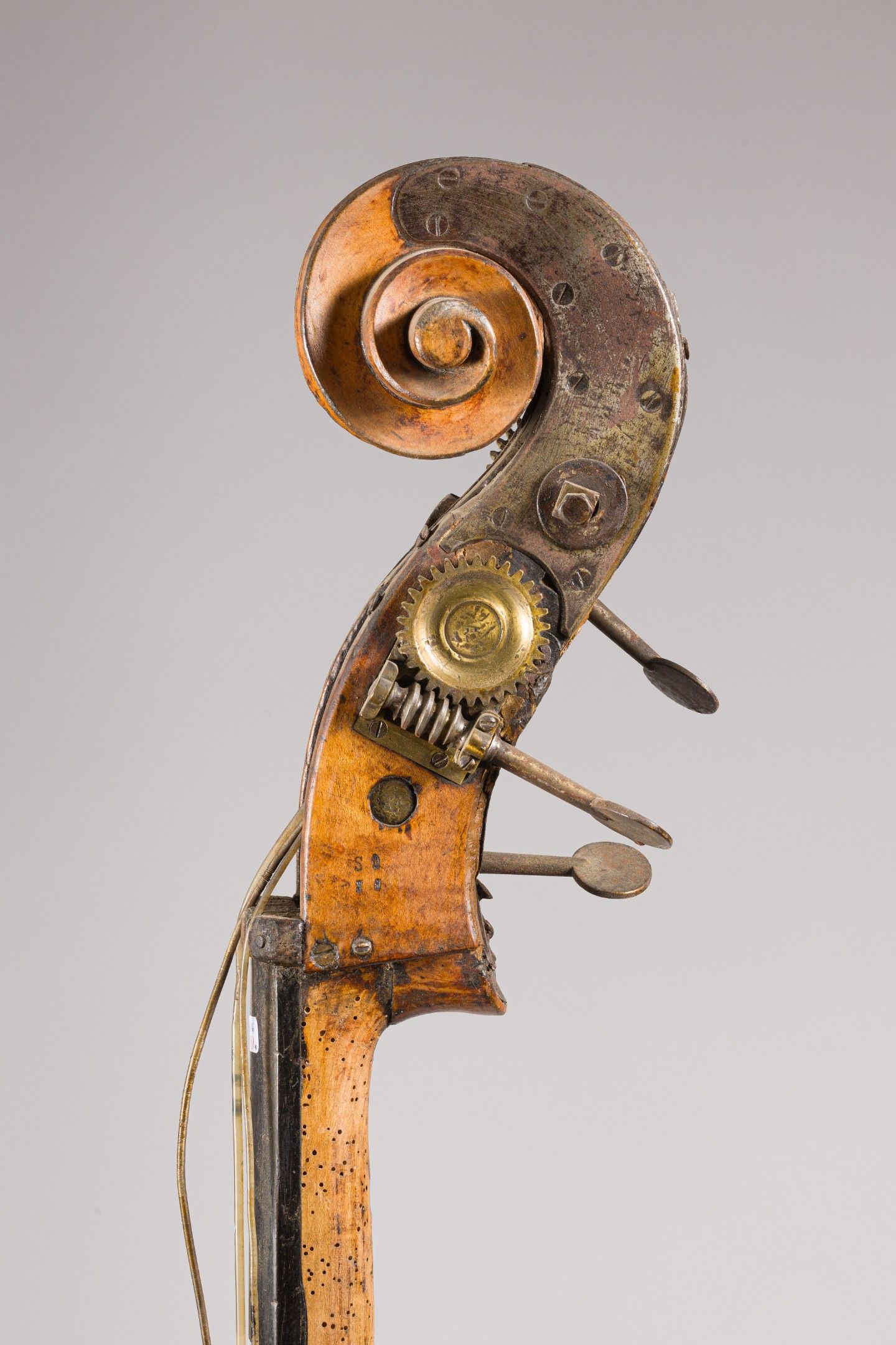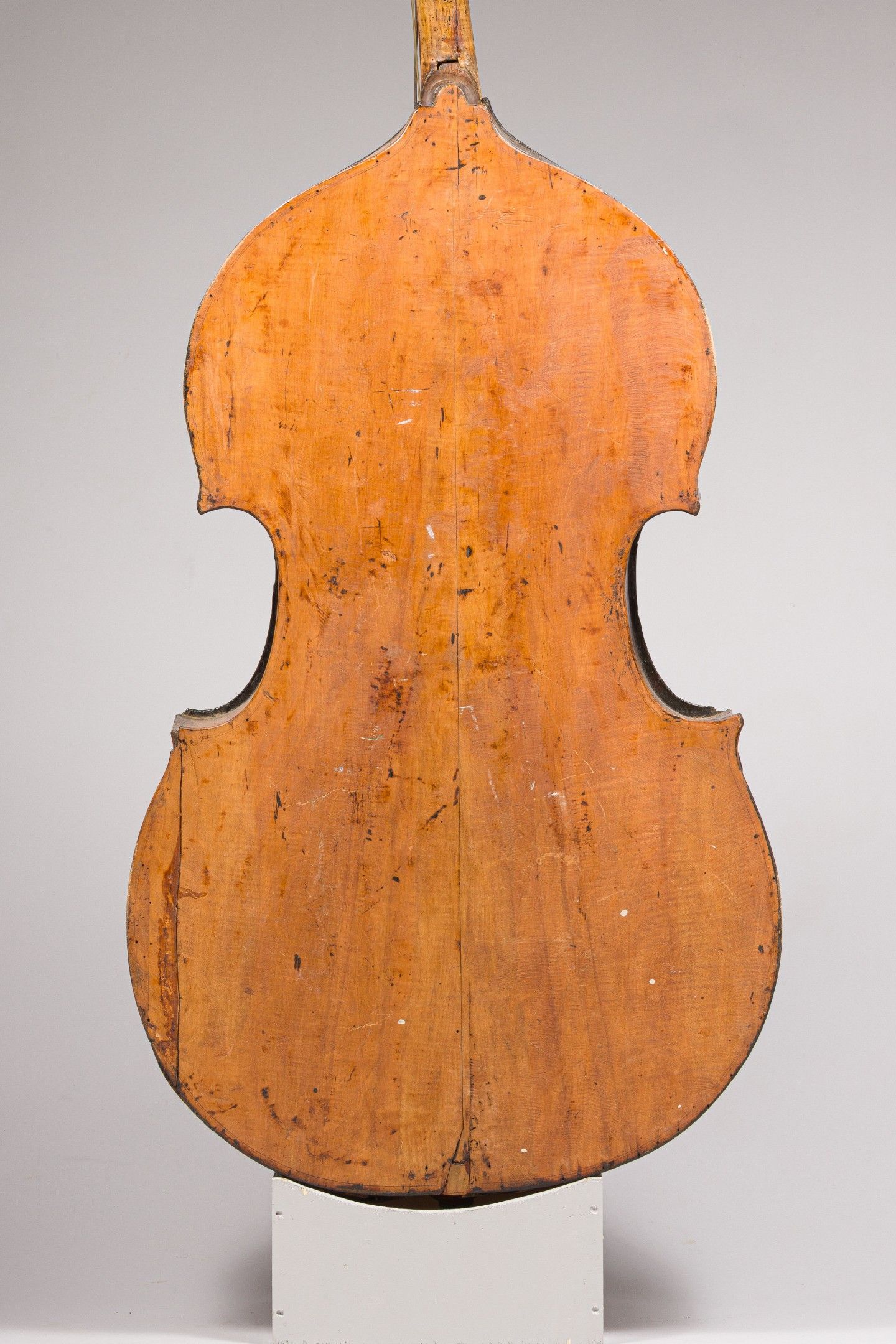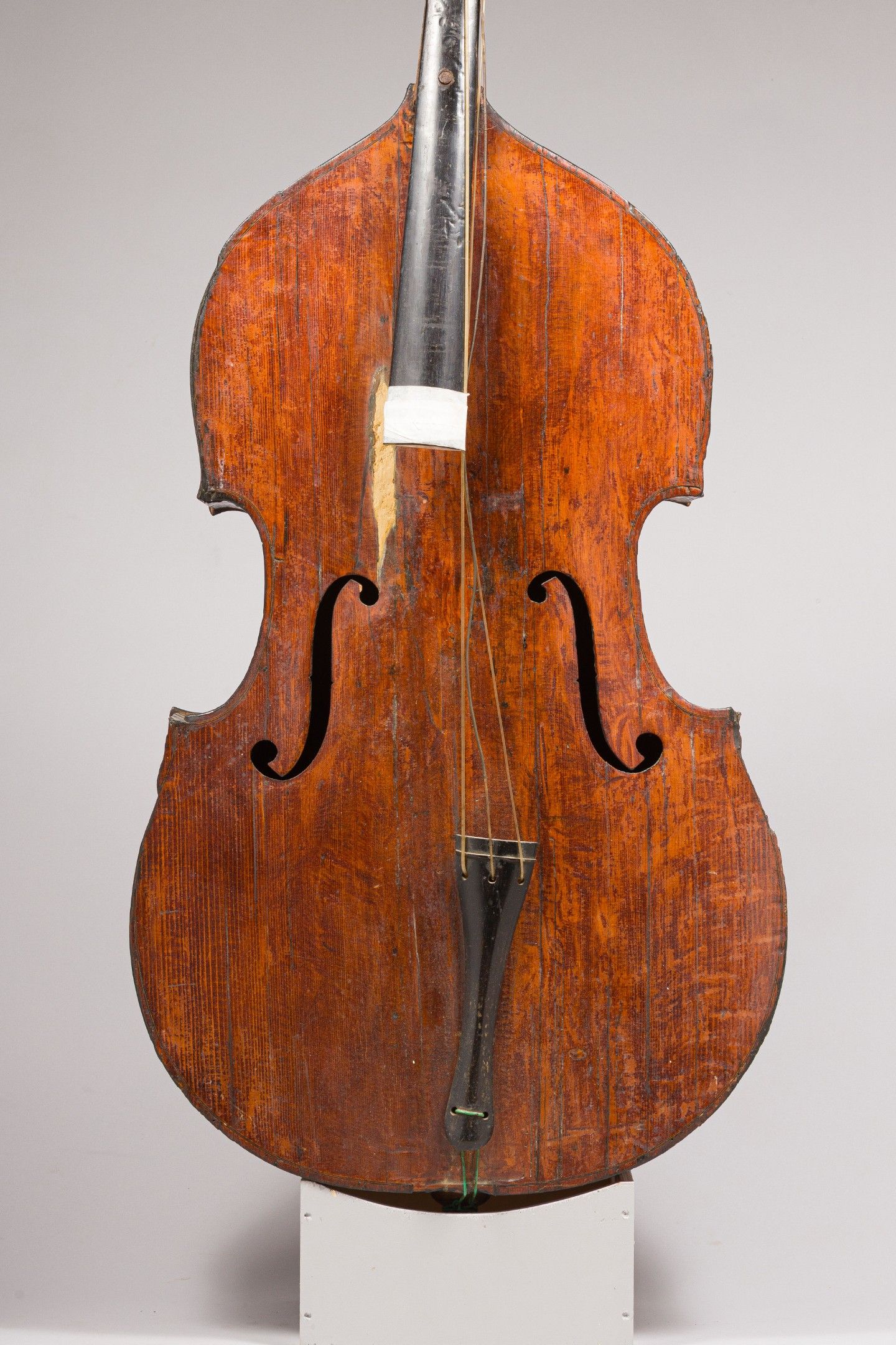 Contrebasse à quatre cordes XIXème ; portant étiquette de François SCHILL 1896. Cassures table, fond éclisses, multiples restaurations, nombreuses traces de vers. [VREXP3]
