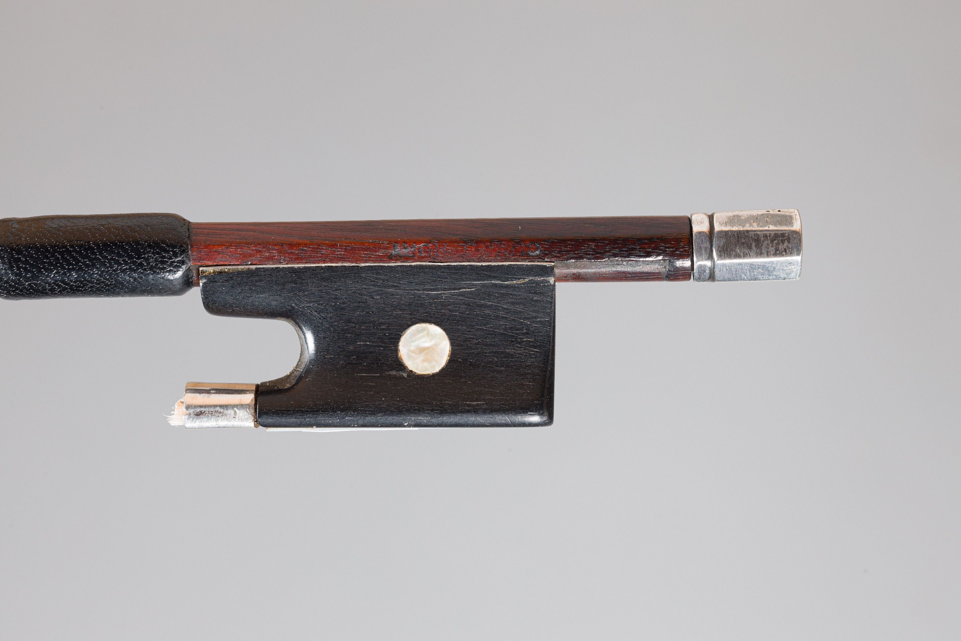 Archet de violon de Émile François OUCHARD (père), fait vers 1915-1920, signé "Cuniot-Hury", bouton postérieur, monté argent. 53g9, sans mèche. Arrachure sous baguette, petits coups et noeud baguette, fracture et éclats hausse. Assez bon état. (EBBK-BRS-5796)