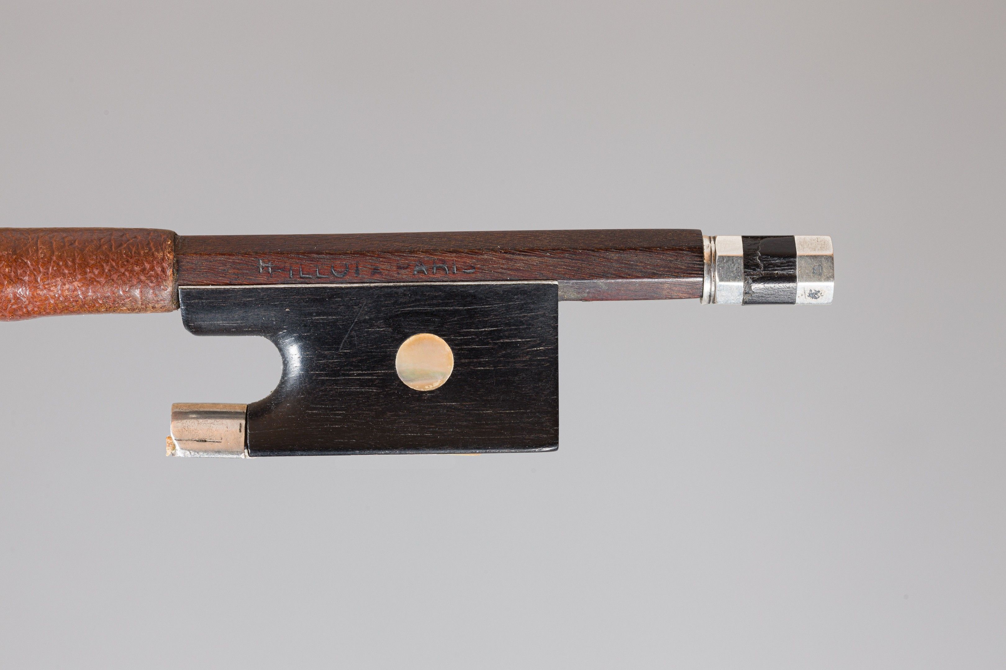 Archet de violon de Émile François OUCHARD (père), fait vers 1925 pour Julien LAVEST et signé "Pillot à Paris", monté argent. 54g8, sans mèche. Coups dessus tête, traces sciage dessous baguette, fin noeud baguette, éclat mortaise arrière baguette, fentes et éclats bouton. En bon état. (EBBD-CHA-1929)