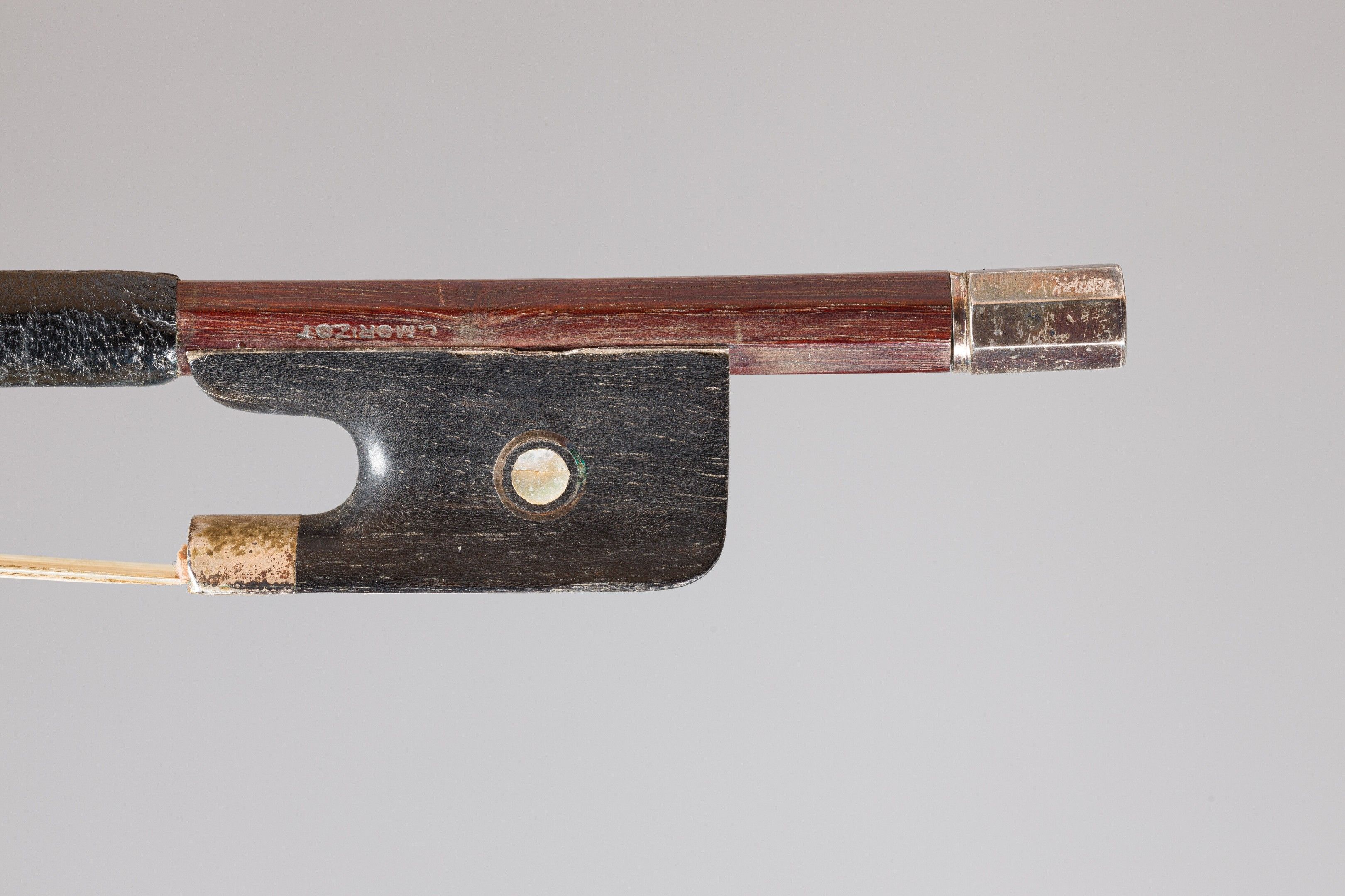 Viola bow by André Auguste MORIZOT Fils, made circa 1940, signed "L.Morizot", silver-mounted. 70g6. On the top of the head and stick knot, split and chips ebony frog, slightly deformed slide, small rear mortice chips, rear stick knot. Good condition (EAAR-CHR-5465).