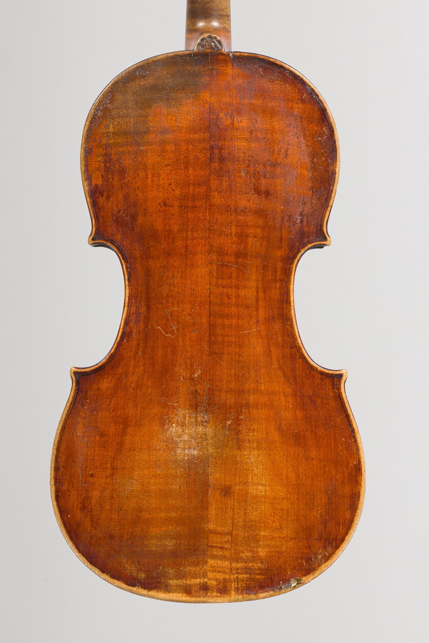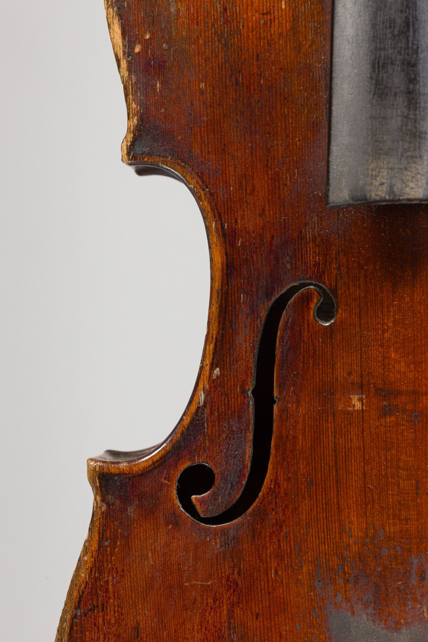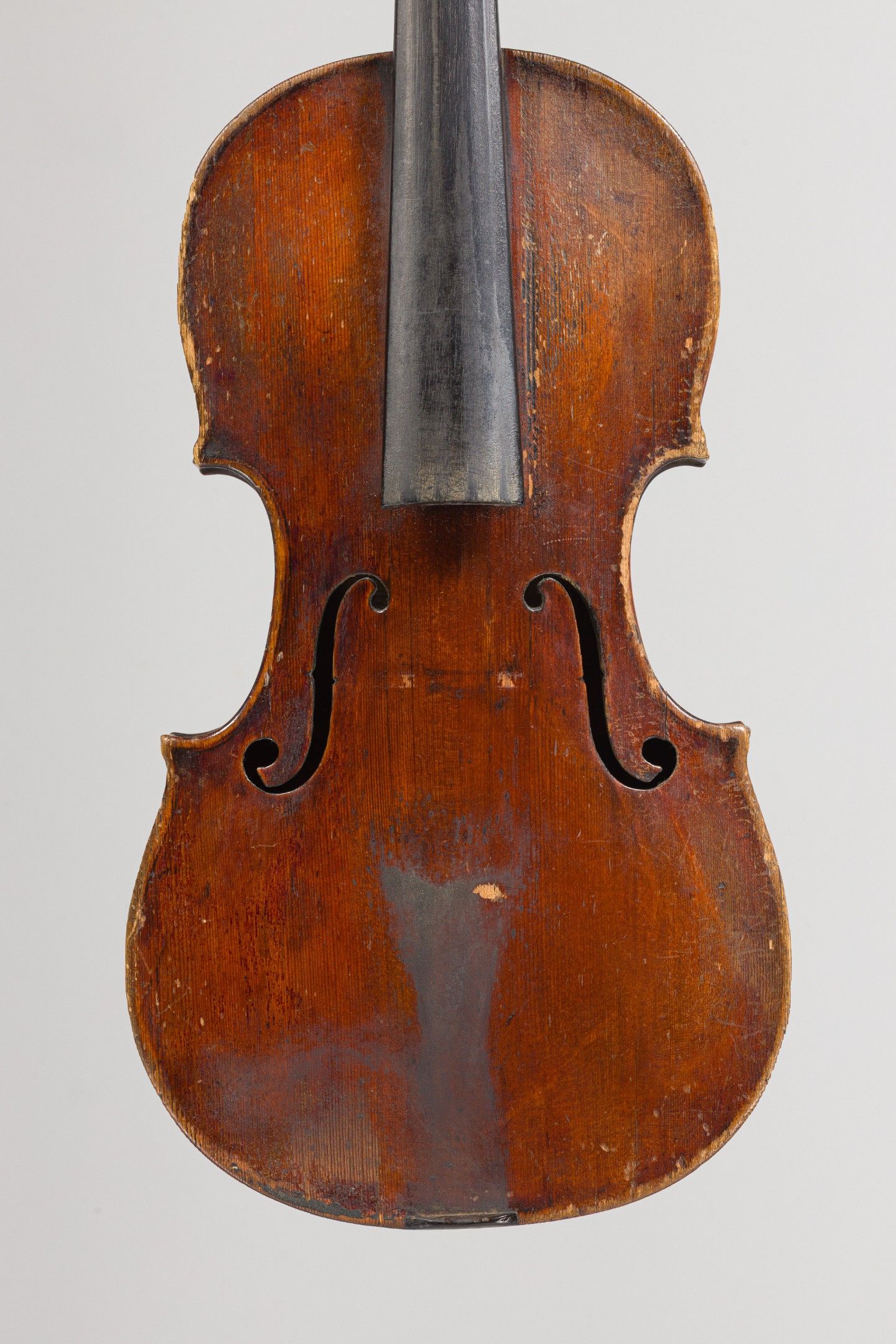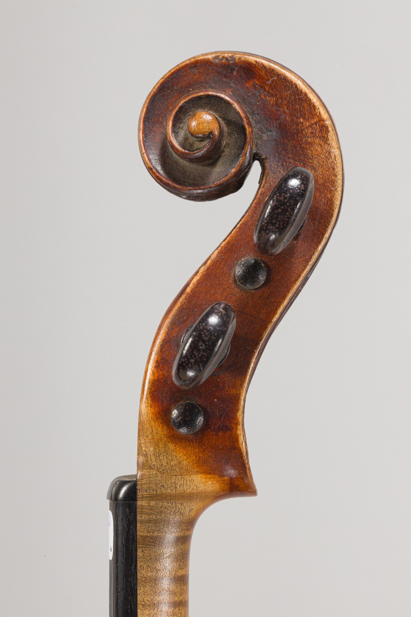 Joli violon Français province, fait vers 1750 ; portant étiquette de réparation Féyrot à Lyon. Cassures restaurées sur la table et sur la tête, cassure ouverte sur la table au niveau de l'F, trou de ver sur la tête. 354mm [VREXP3]