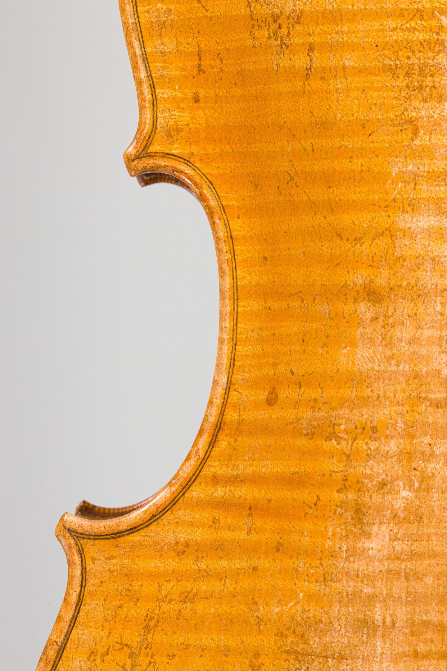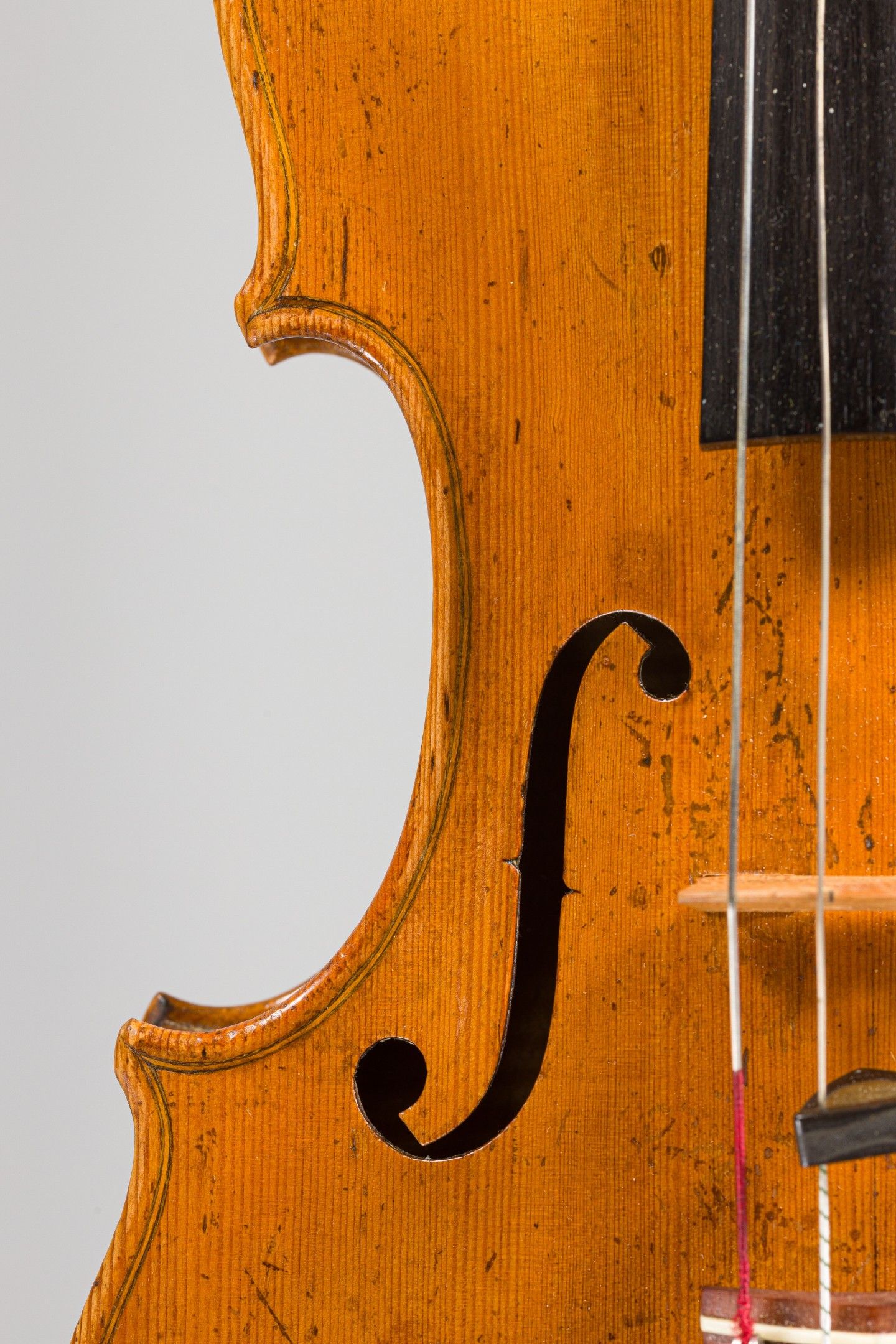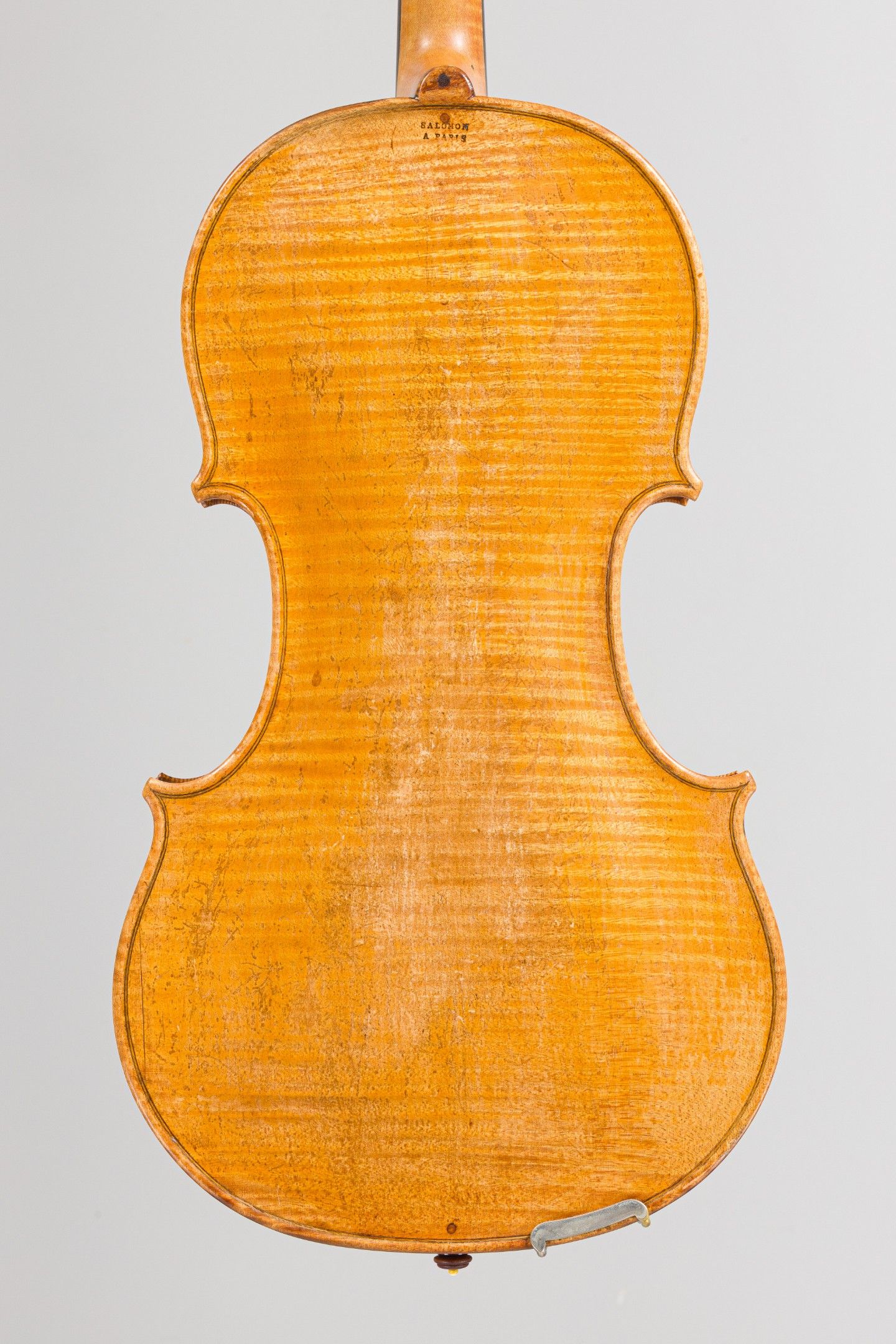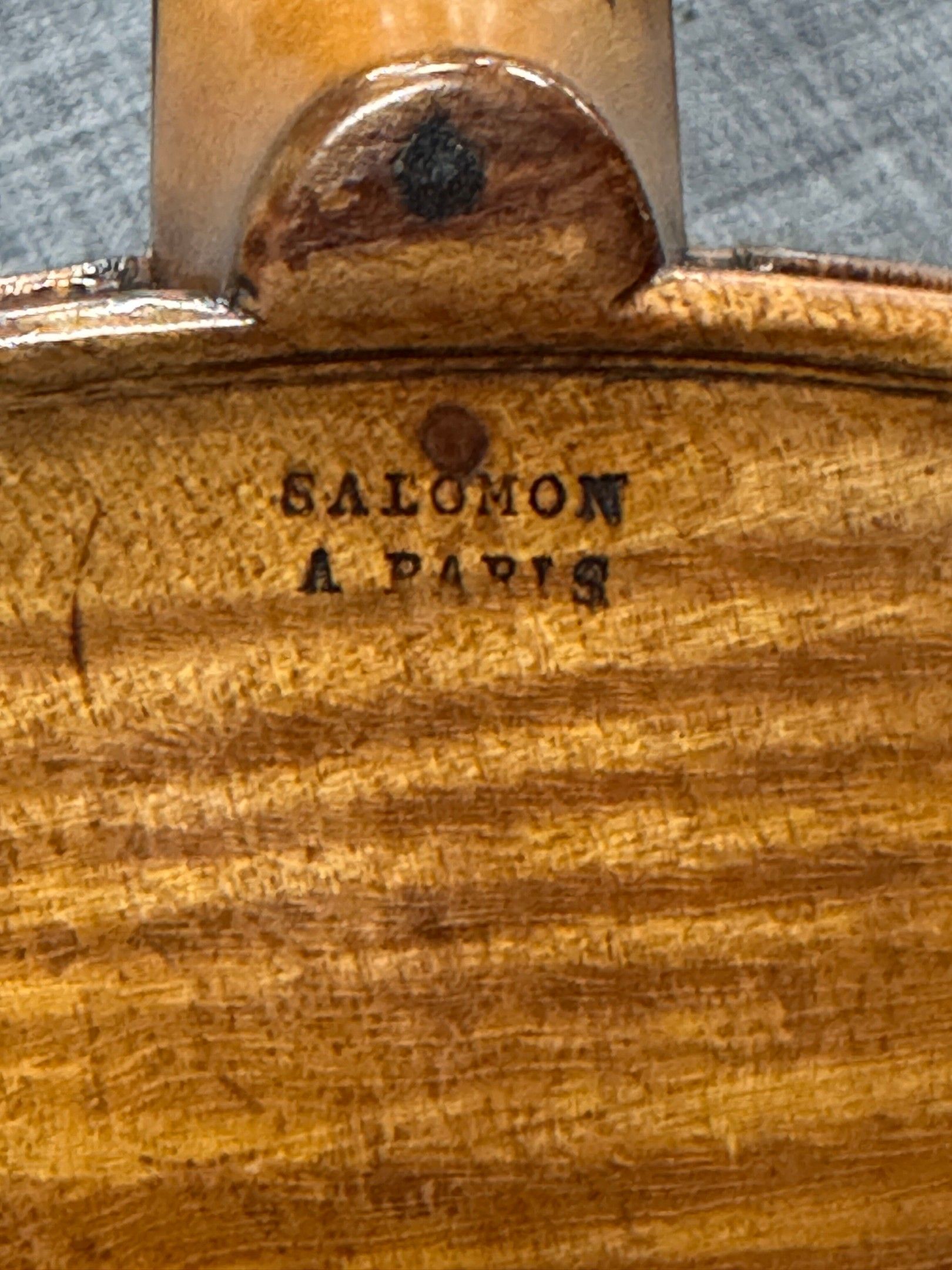 Bel alto de Jean Baptiste SALOMON fait à Paris vers 1750-1760, tête décorée ; portant marque au fer Salomon à Paris sous le talon. Cassure restaurée sur la table, petite trace de vers sur l'éclisse avant gauche. 405mm [VREXP1]