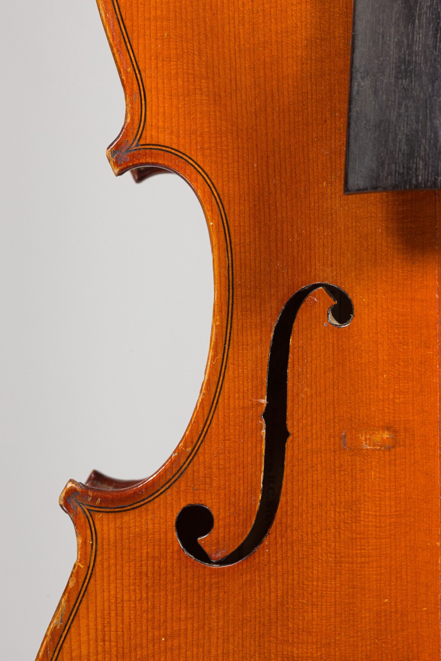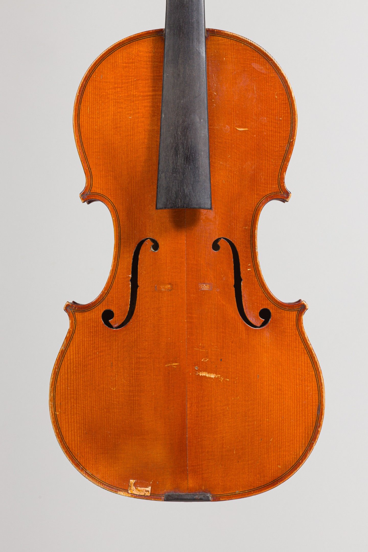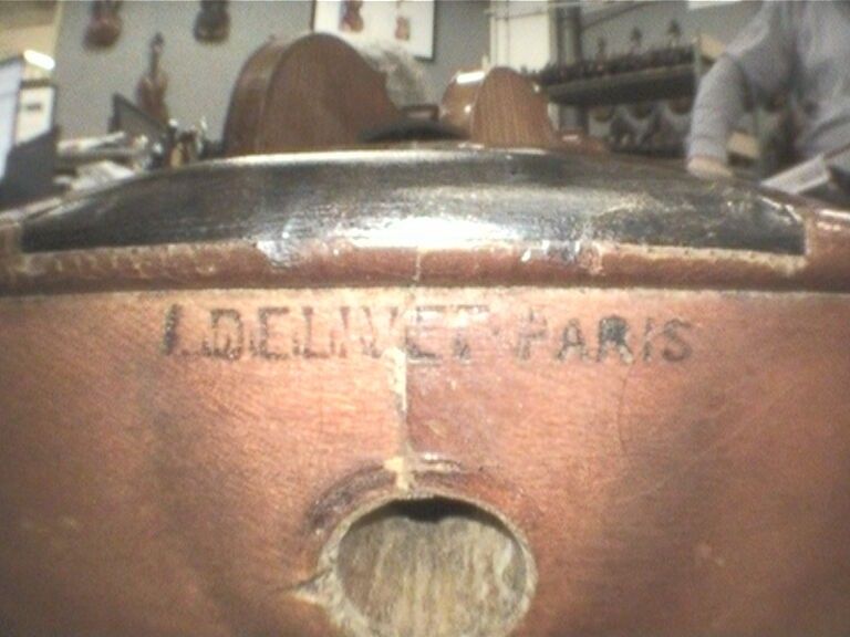 Violon d'Auguste DELIVET, fait à Paris en 1905, numéroté 137 ; portant étiquette, marque(s) au fer, signature(s) de l'auteur. Assez bon état : fissures aux cheville s Ré et La. 357mm. [VRVI2512_076-VREXP1]