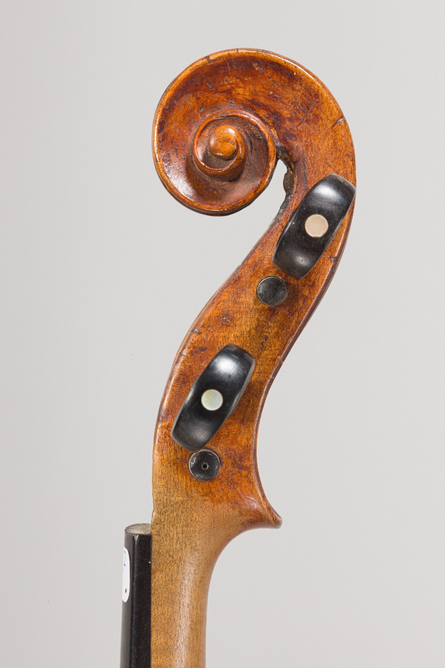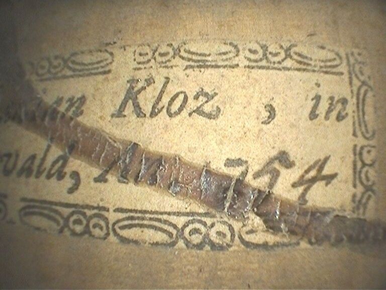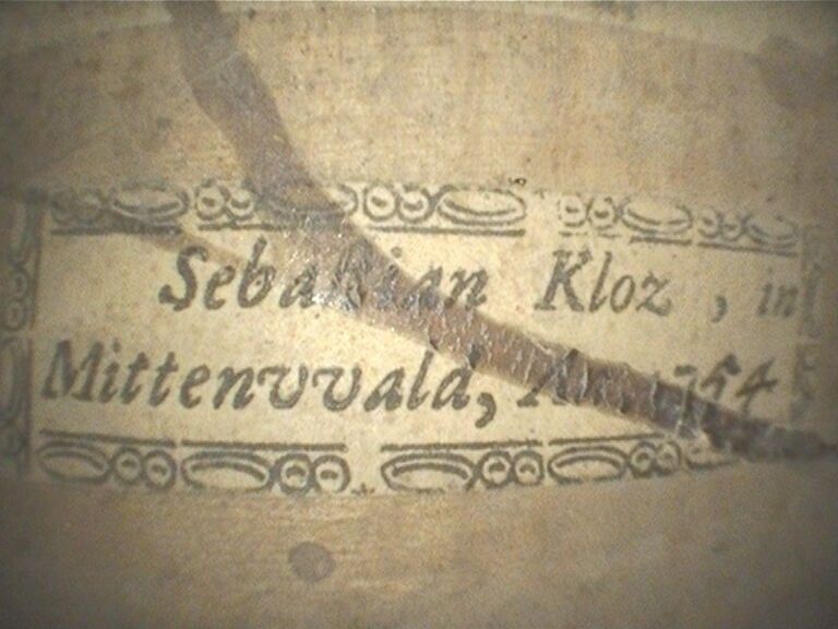 Intéressant violon de Sébastian KLOZ, fait à Mittenwald en 1754, manche d'origine ; portant étiquette de Sebastian Kloz. Usure sur l'F gauche, petite cassure sur la tête. 351mm [VREXP1]