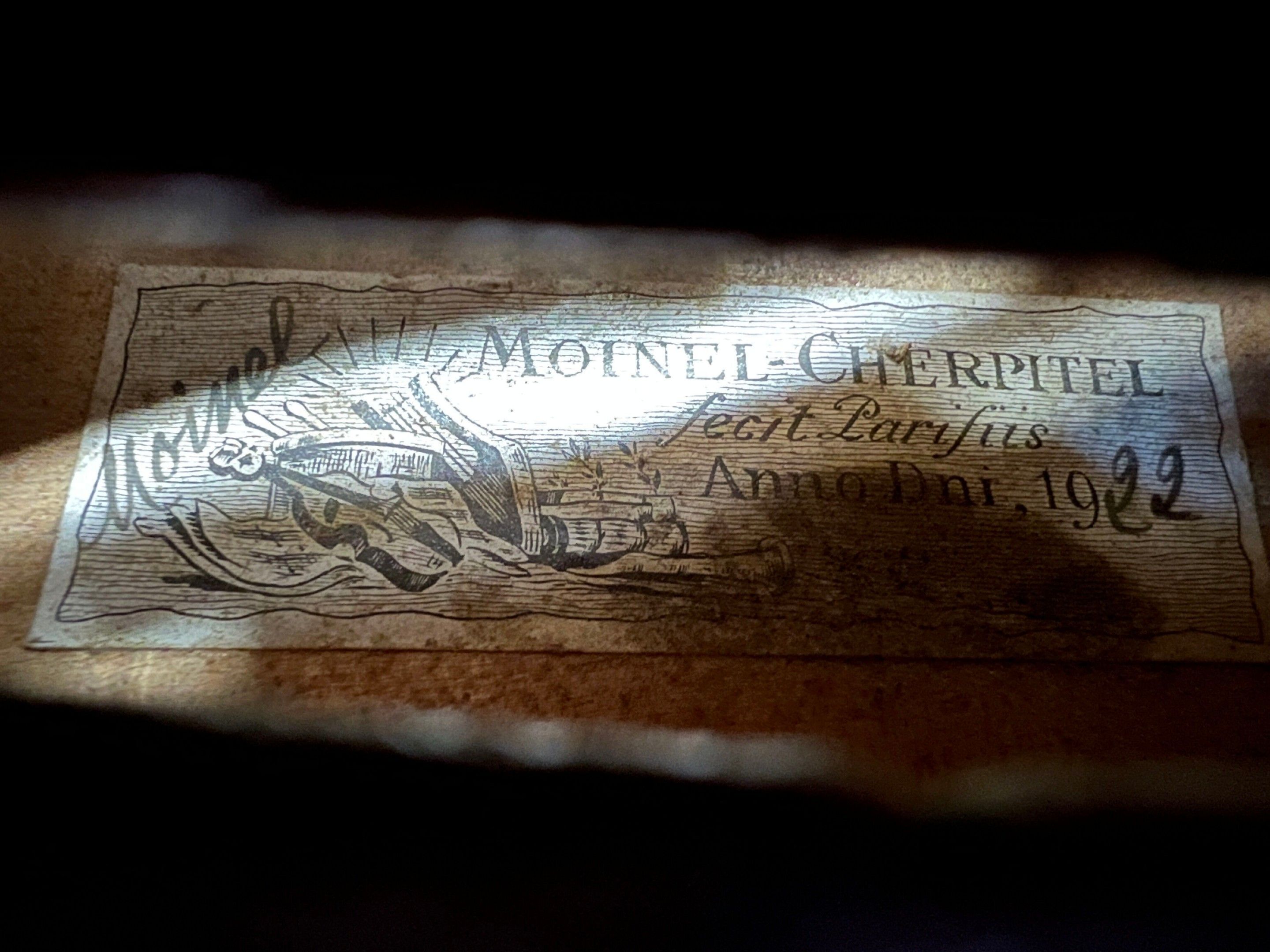 Violon de MOINEL-CHERPITEL, fait à Paris en 1922 ; portant étiquette de Moinel Cherpitel fecit Parisiis anno dni 1922, marques au fer de Moinel à Paris sur le fond et sur la table, signature sur le fond. Cassure d'âme sur la table restaurée. 357mm. This instrument is more than 100 years old. [VREXP1]