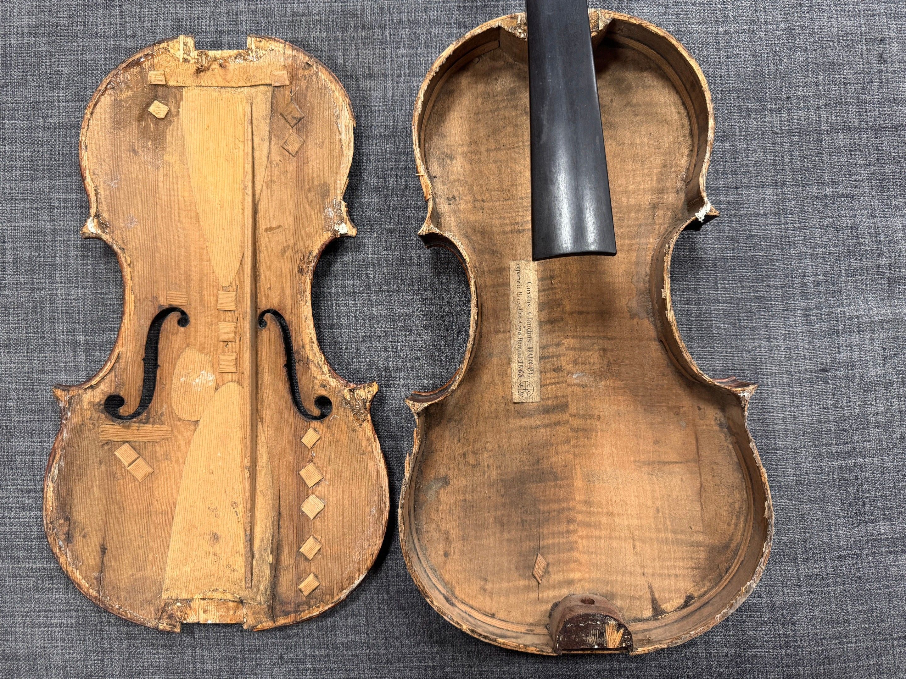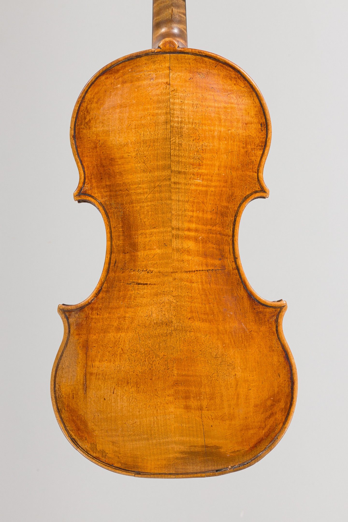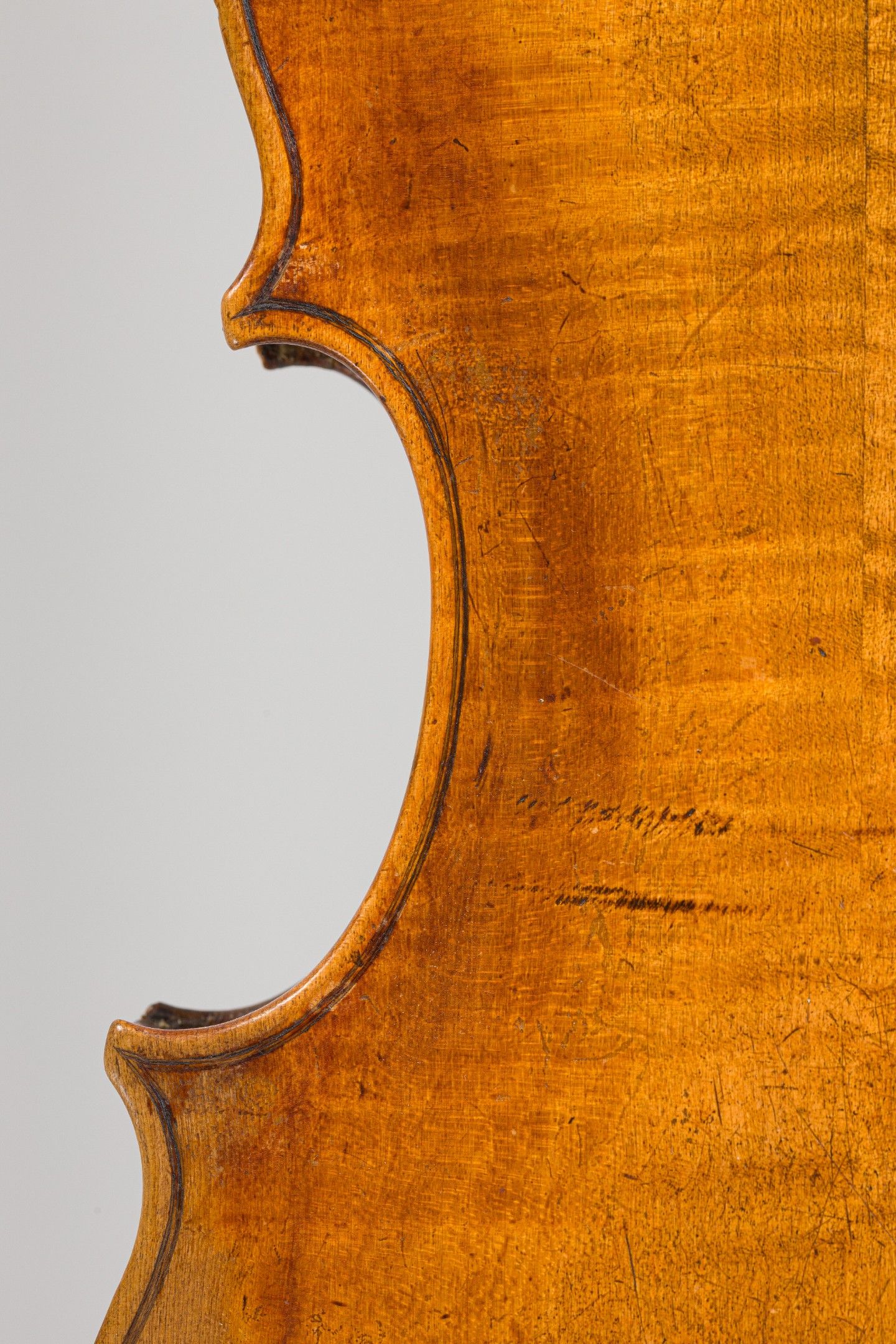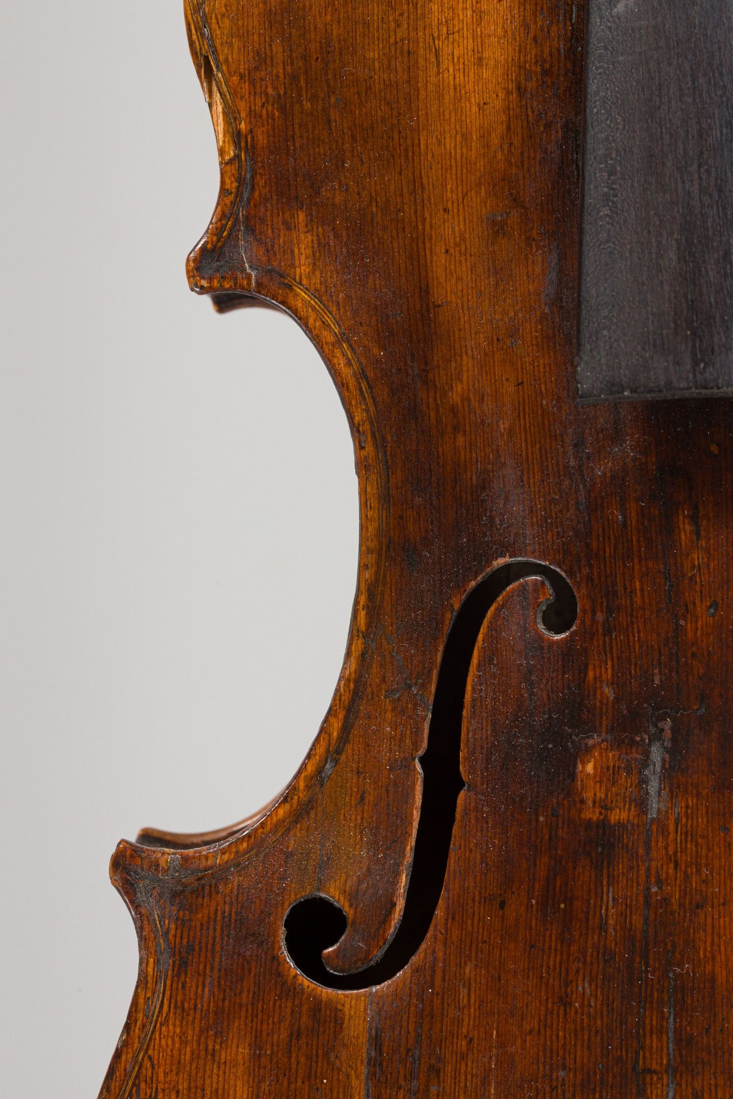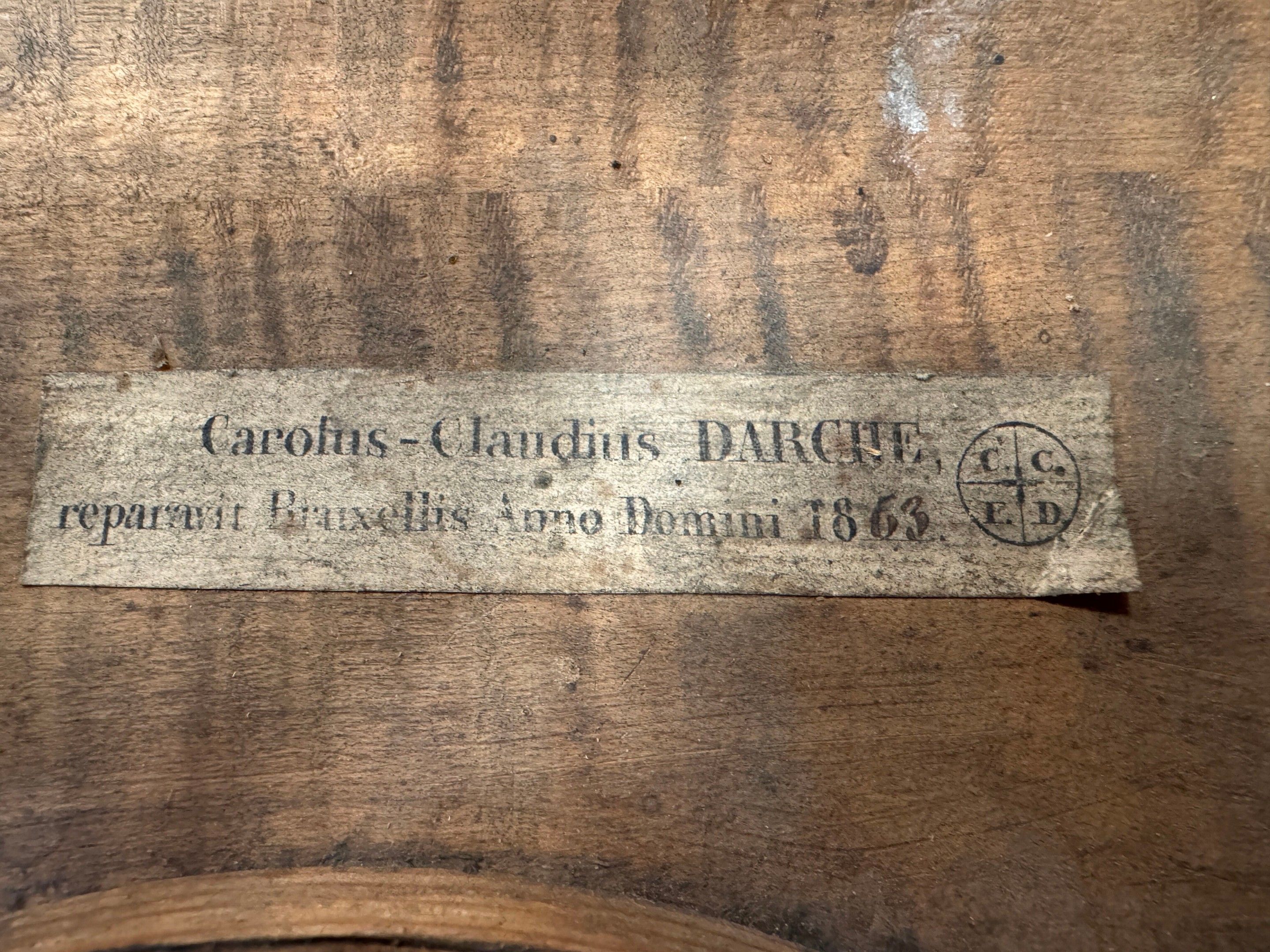 Violon probablement de l'école de Turin fait vers 1700, tête remplacée ; portant étiquette Carolus-Claudius Darche reparavit Bruxellis anno domini 1863. Cassures sur la table, éclisses décollées. 357mm [VREXP3]