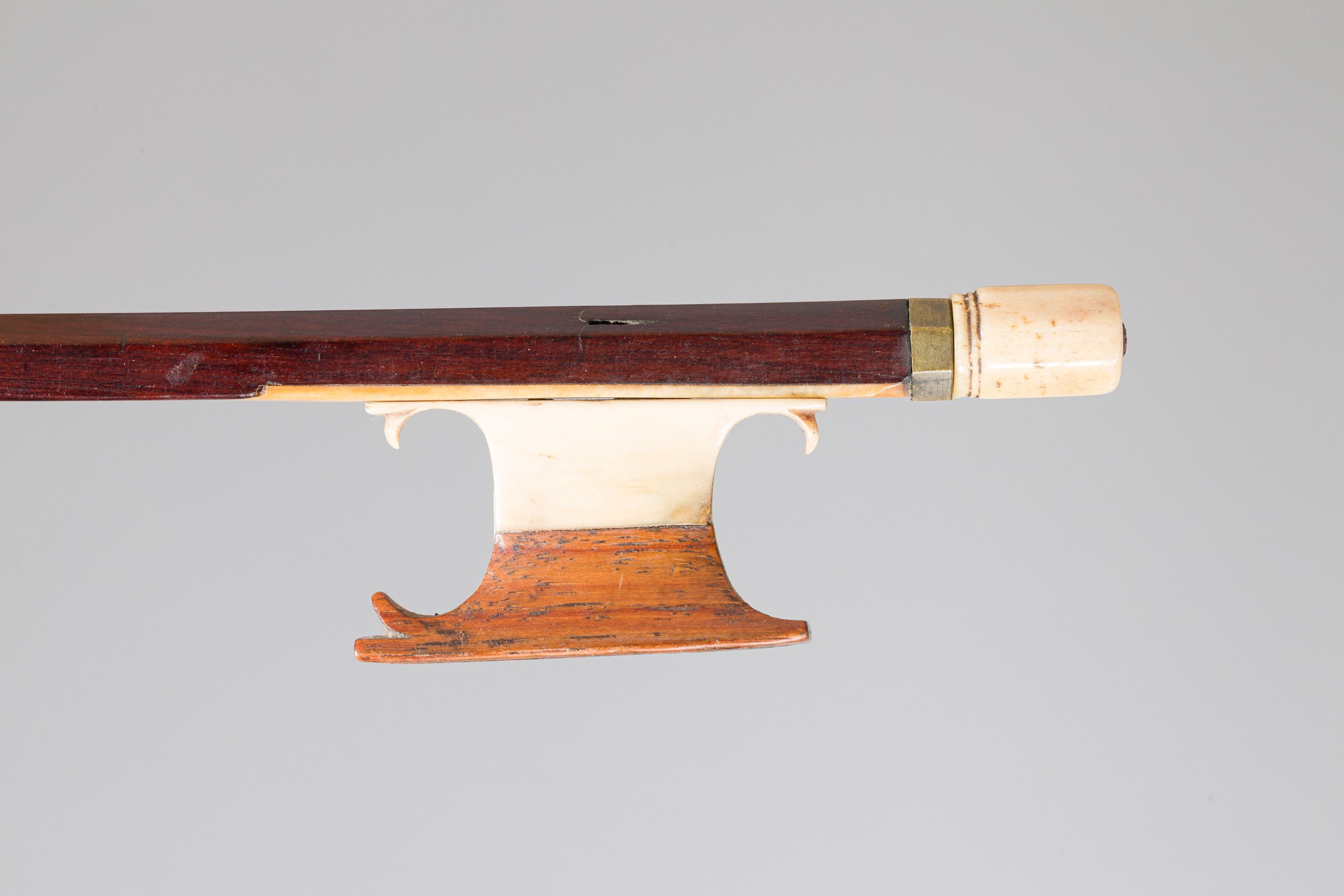 Archet de violon de Nicolas Léonard et François Xavier TOURTE, fait vers 1775-1780, en bois d'amourette, bouton postérieur en os, hausse ivoire. 49g3, sans mèche ni garniture. Bas de tête manquant, fente et éclat arrière baguette consolidés par une bague, fente bouton. Bon état. (EAAQ-BQK-4652). CIC DU 23 SEPTEMBRE 2025