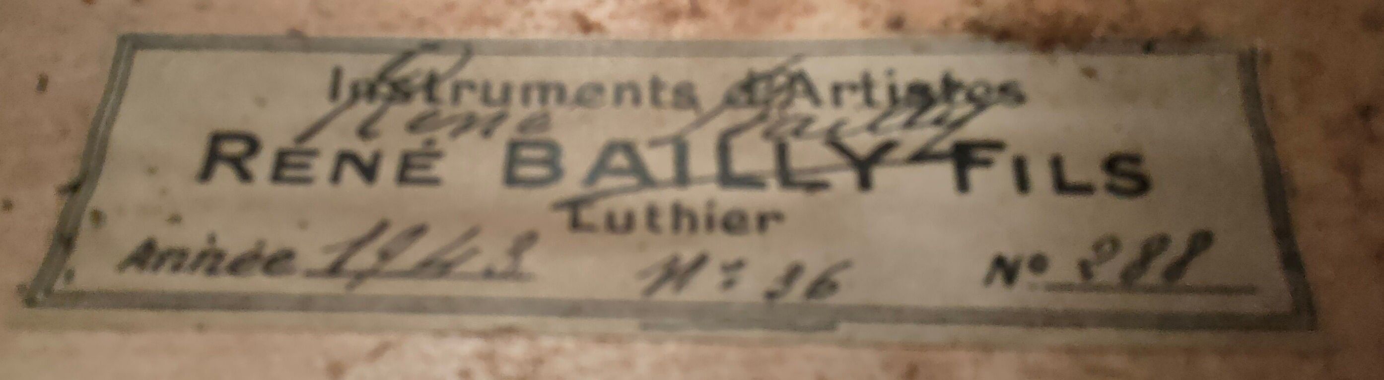 Violon de René BAILLY, fait à Mirecourt en 1943, numéroté 288 ; portant étiquette, signature(s) de l'auteur. Assez bon état. 356mm. [VRVI2512_009-VREXP1]