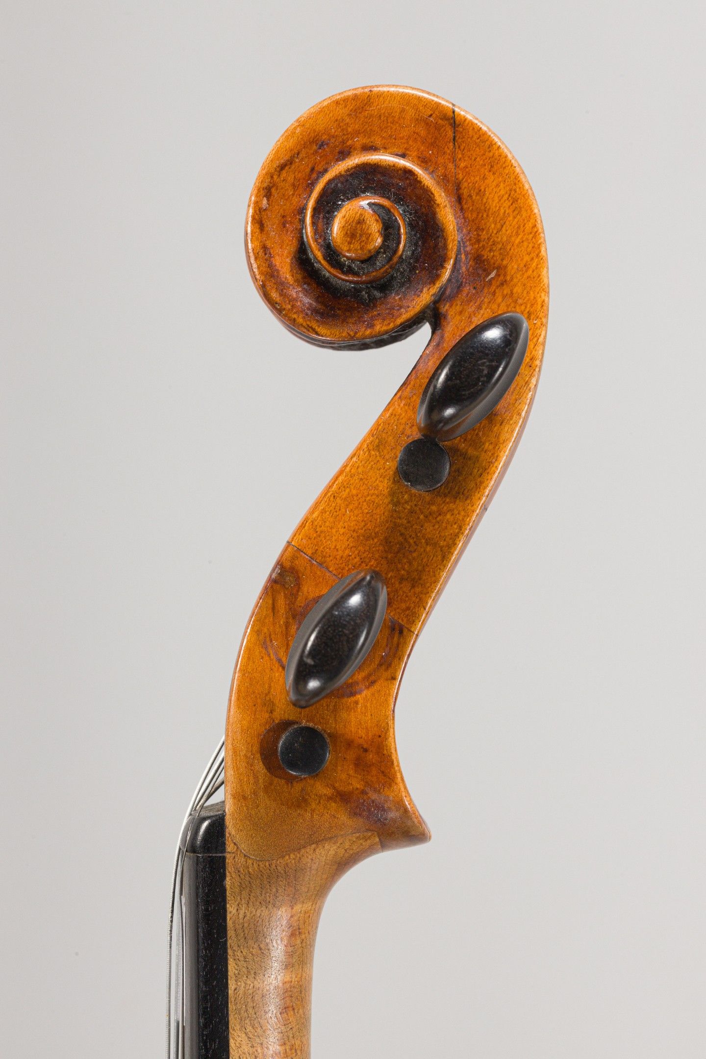 Intéressant violon fin XVIIIème ; portant étiquette Grancino. Cassures restaurées sur table et sur le fond, tête restaurée. 355mm [VREXP3]