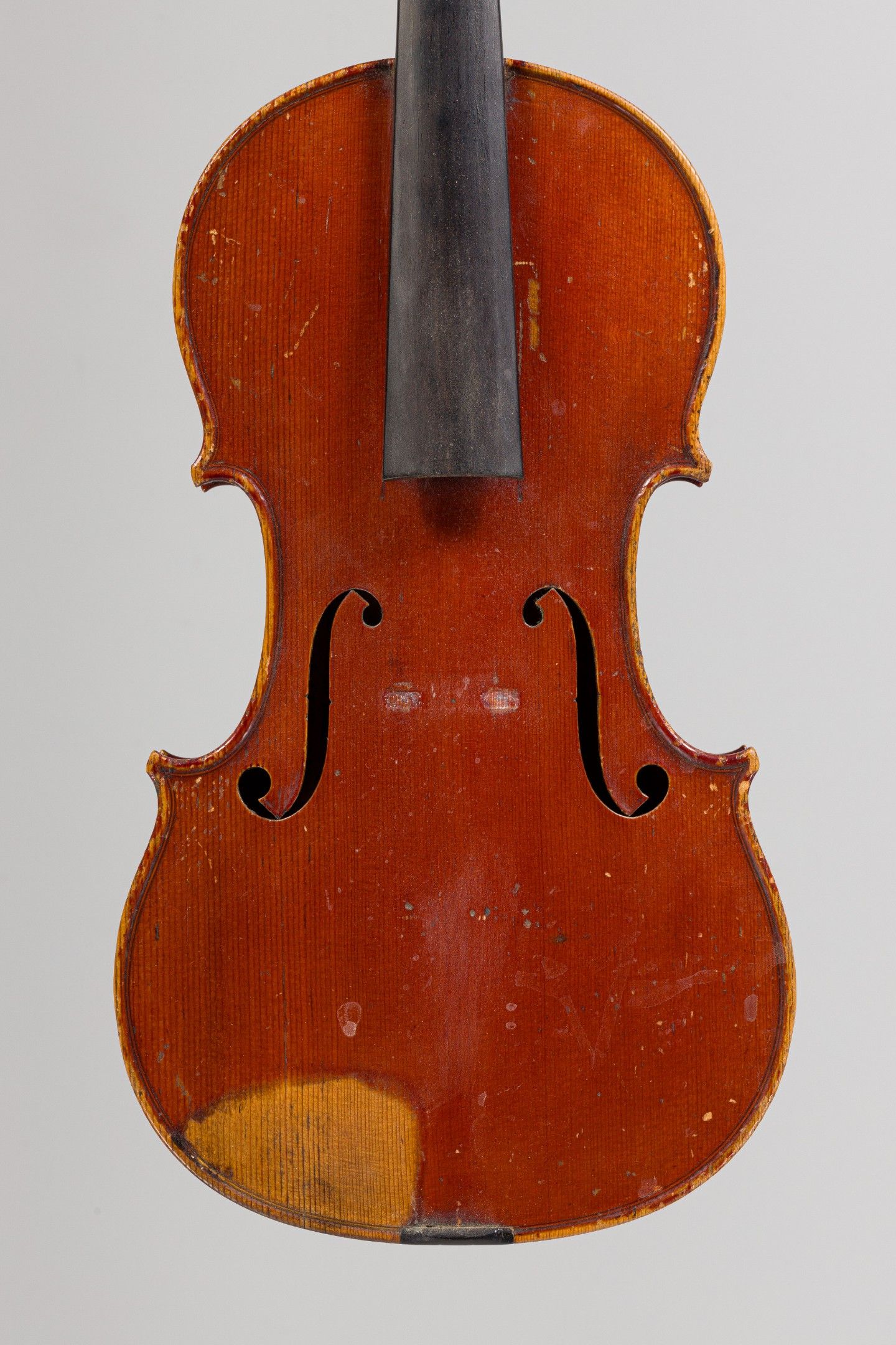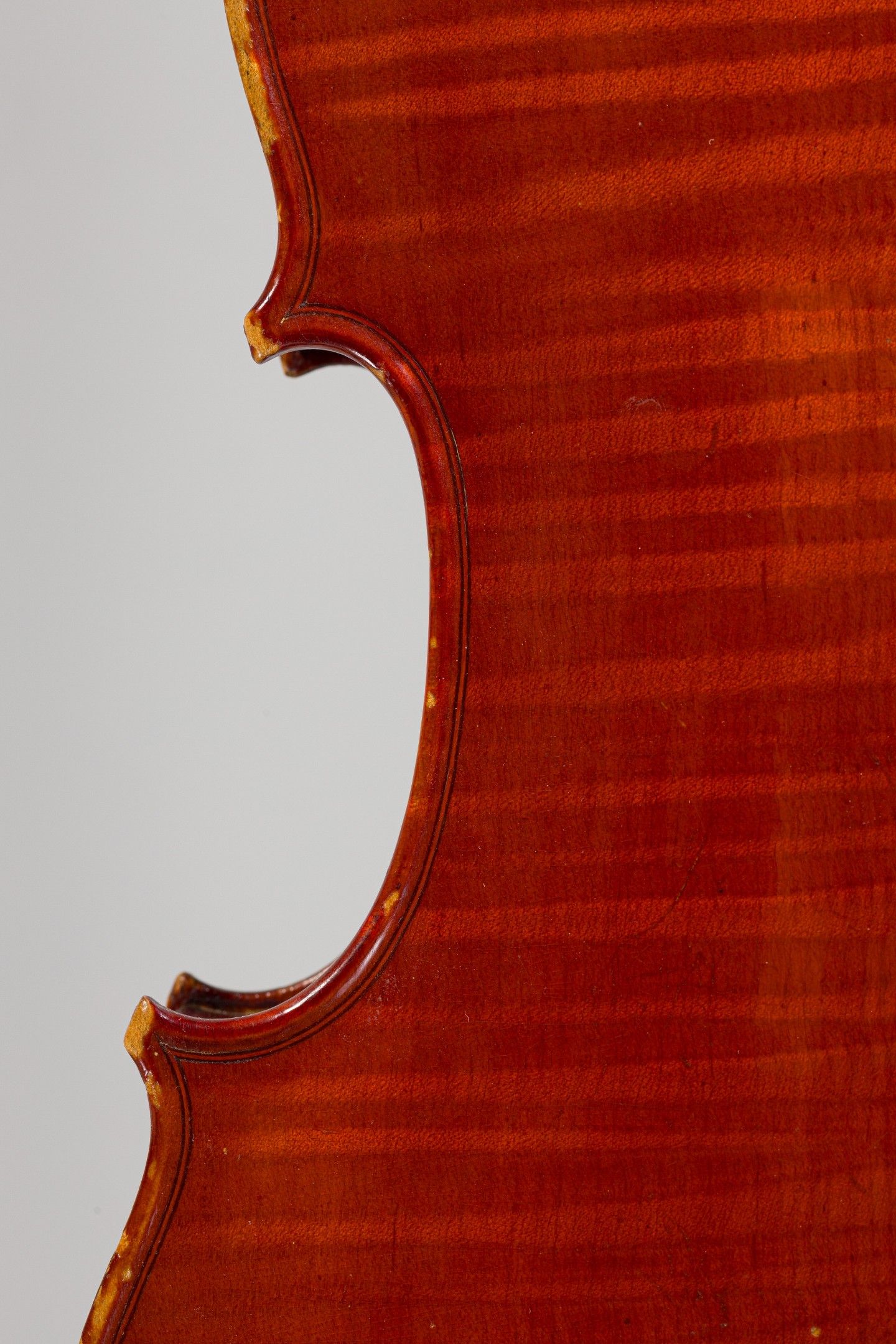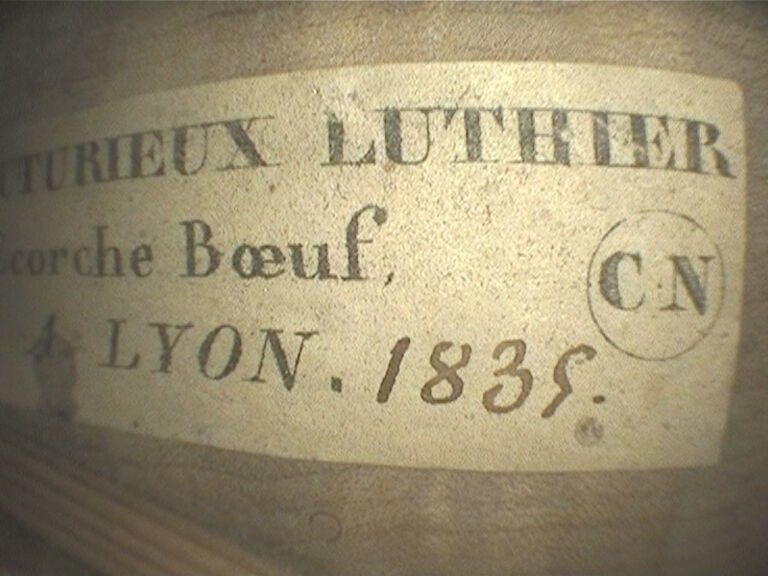 Violon de Nicolas COUTURIEUX, fait à Lyon en 1835 ; portant étiquette Luthier rue écorche Boeuf à Lyon 1835, et marque au fer de N. Couturieux à Lyon 1835. État : petites cassures restaurées sur la table, petites fractures sur l'éclisse arrière décollée. 358mm. This instrument is more than 100 years old. [VREXP1]