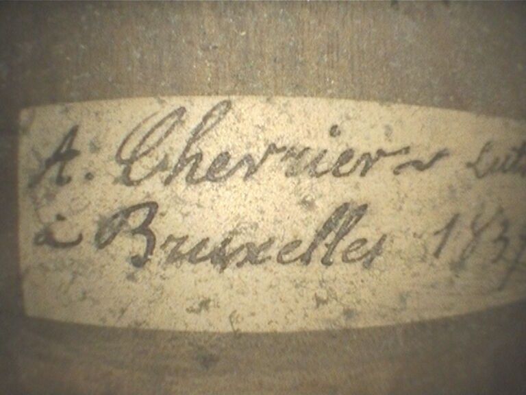 Intéressant violon de Claude CHEVRIER, fait à Mirecourt vers 1860 ; portant marque au fer de C. Chevrier sur le fond et étiquette de A. Chevrier luthier à Bruxelles 1839. Assez bon état. 361mm. [VREXP1]