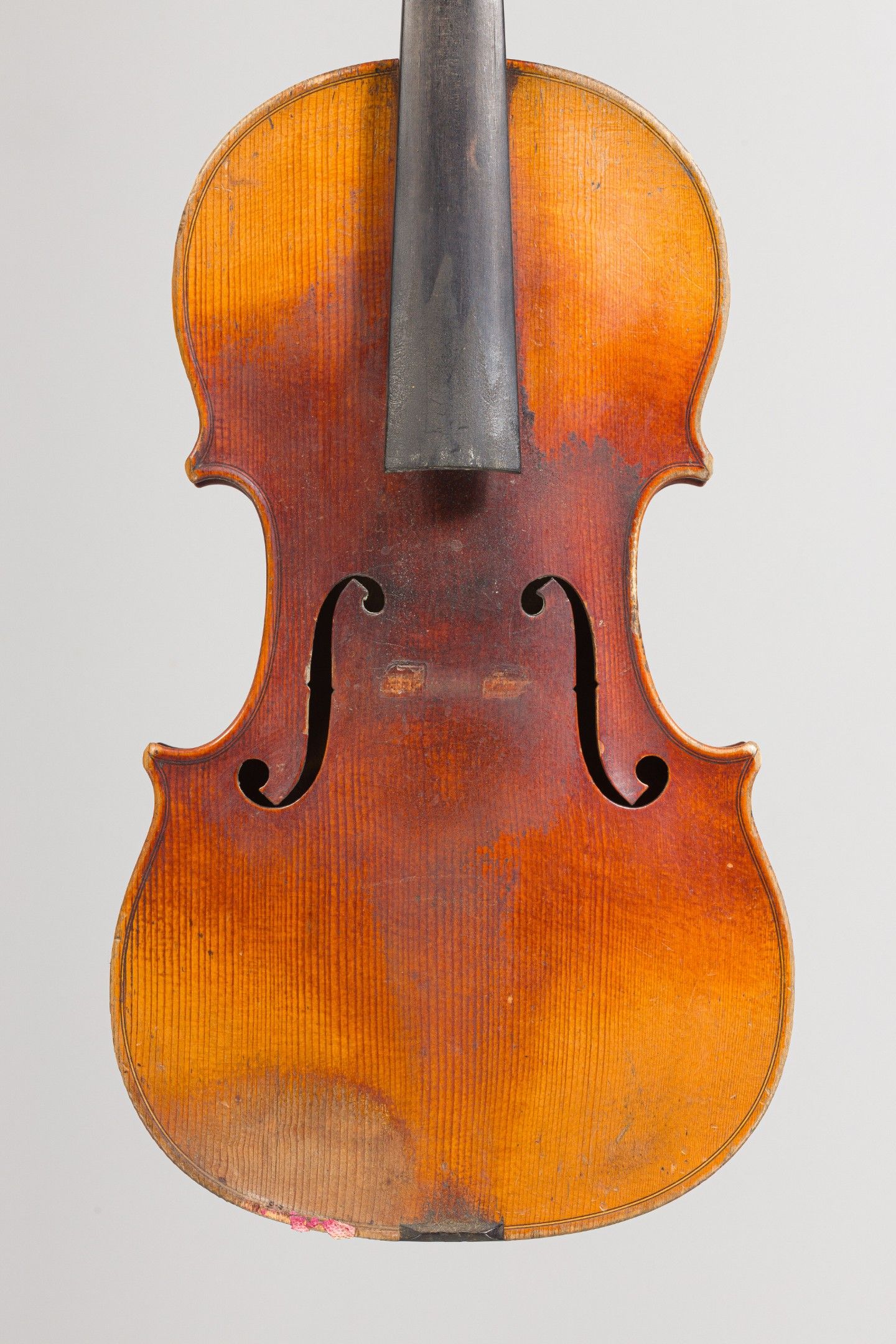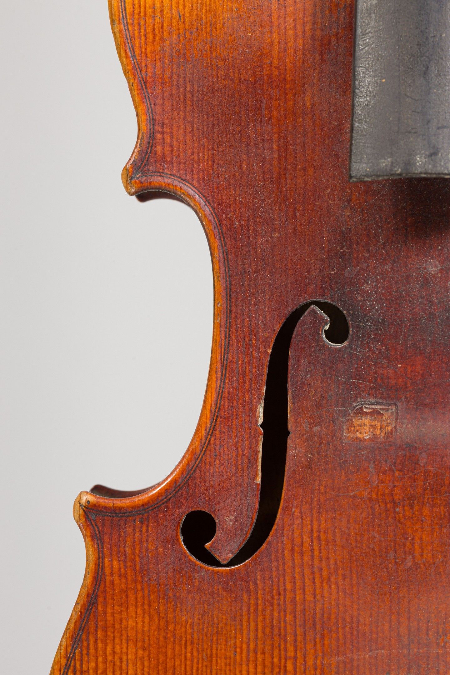 Interesting violin by Claude CHEVRIER, made in Mirecourt around 1860; branded with the C. Chevrier mark on the back and bearing a label from A. Chevrier, luthier in Brussels, 1839. In Fair condition. 361mm. [VREXP1]