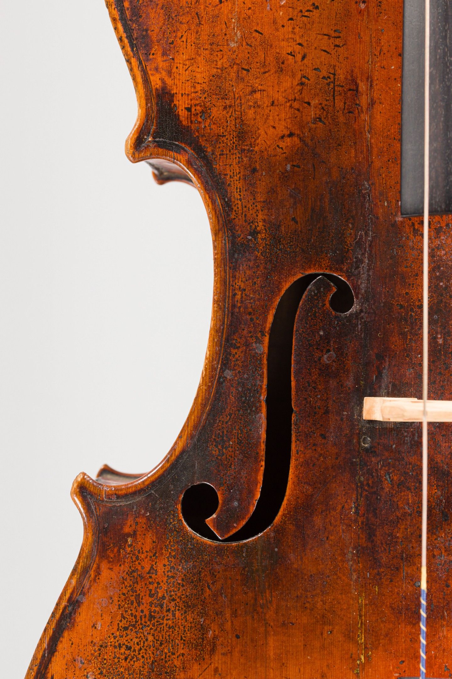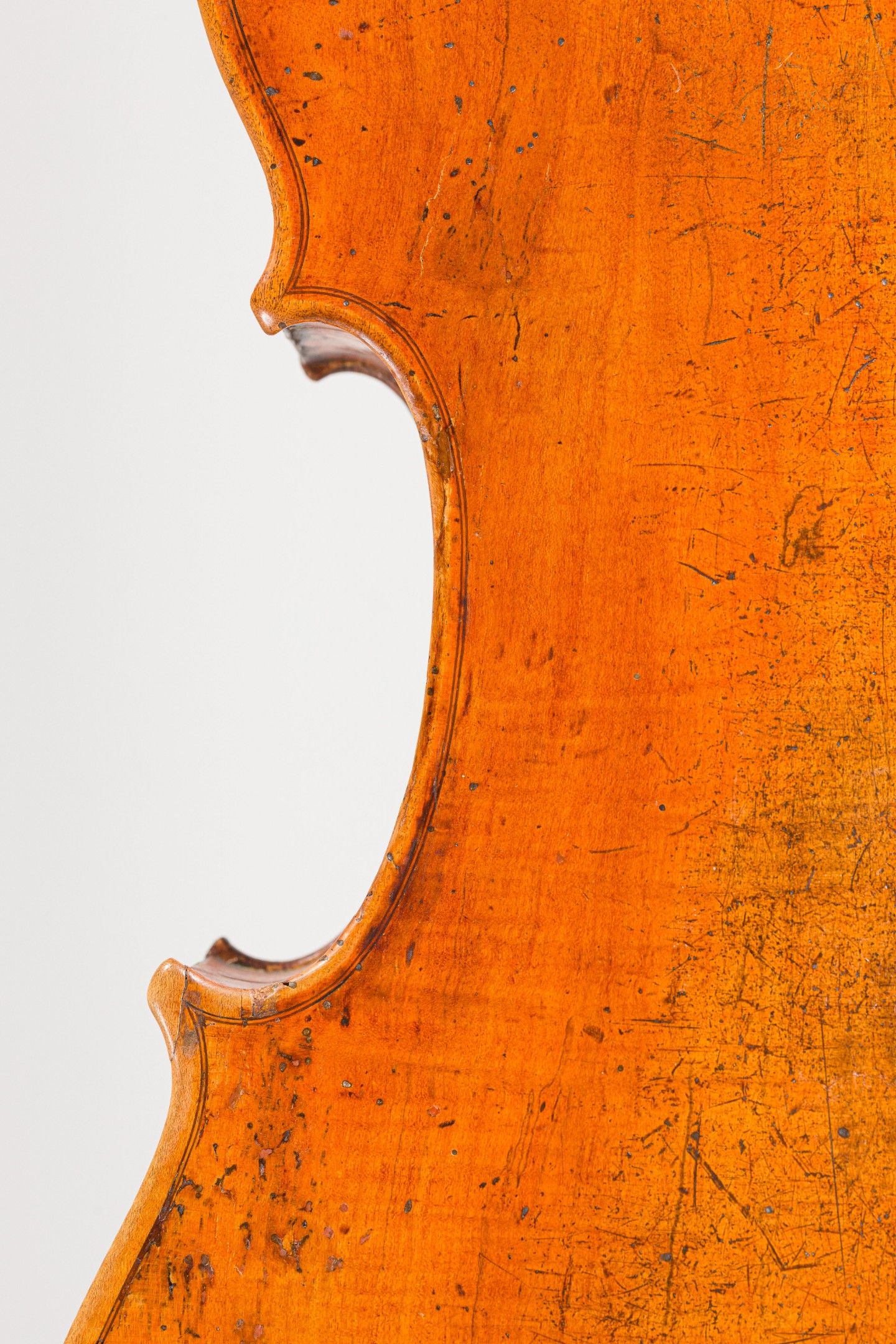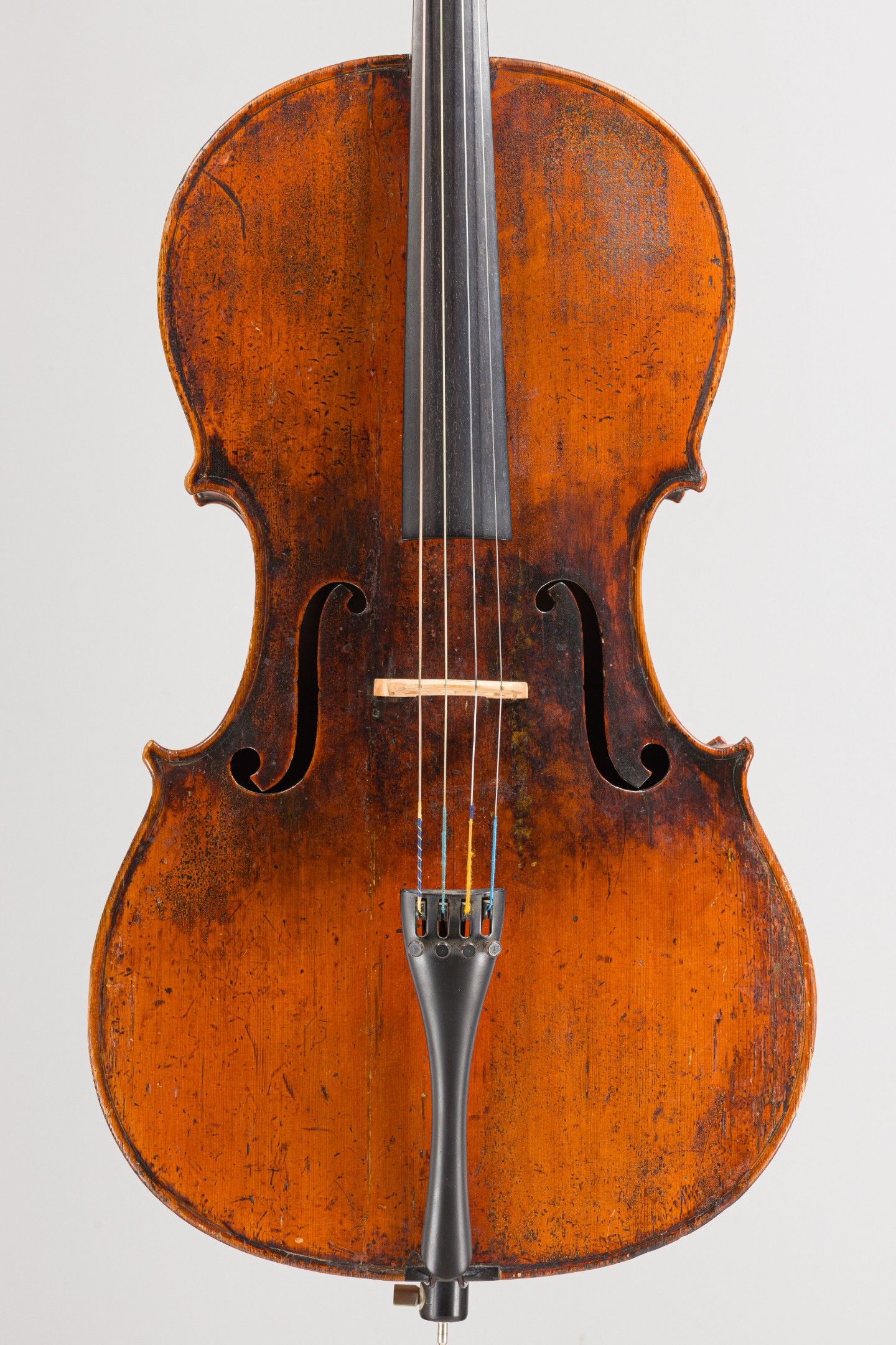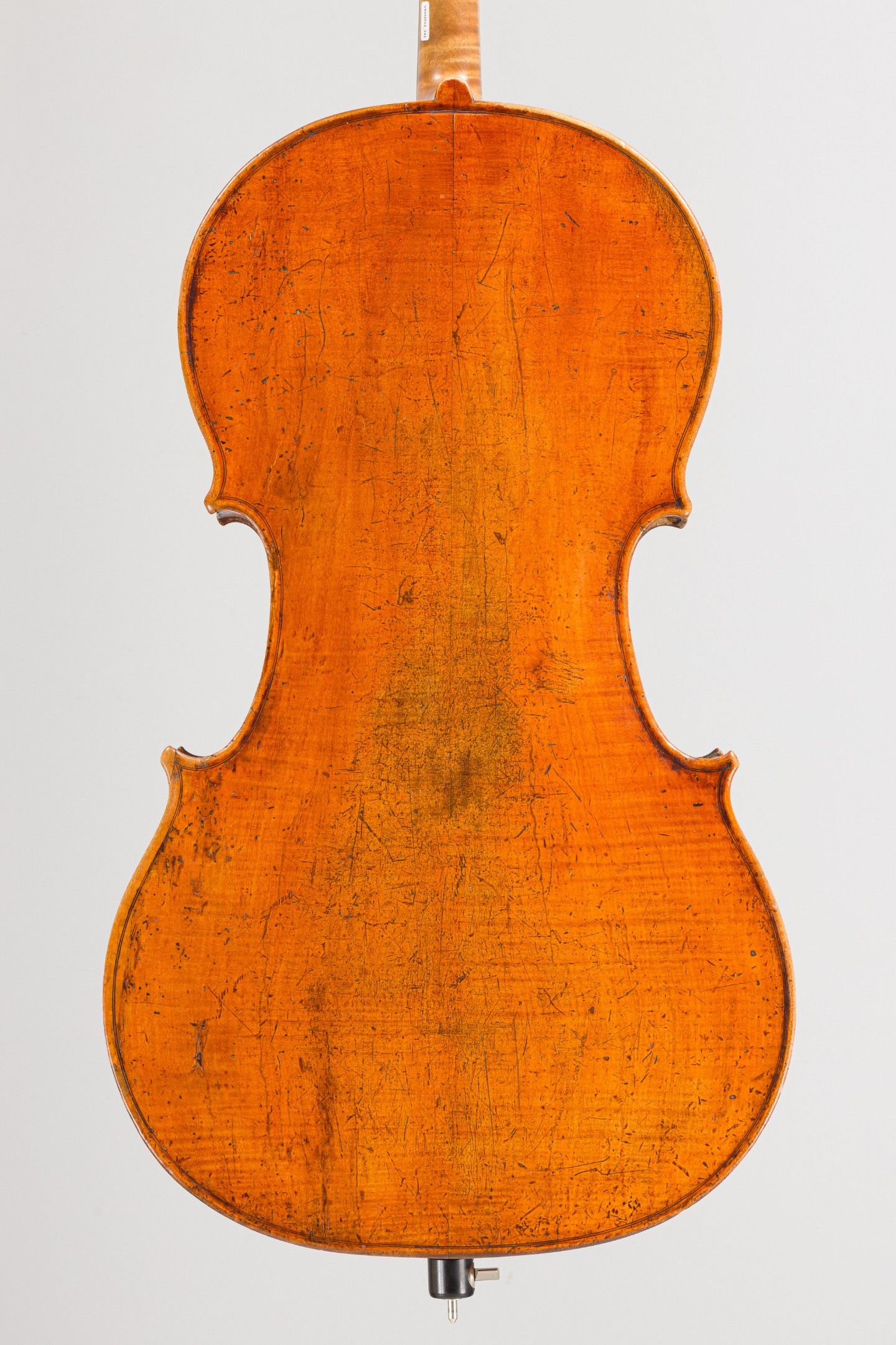 Violoncelle Français, fait à Mirecourt vers 1830-1840 ; portant étiquette de réparation. Différentes restaurations, dont cassure d'âme sur la table. 729mm. [VRVI2512_141-VREXP3]