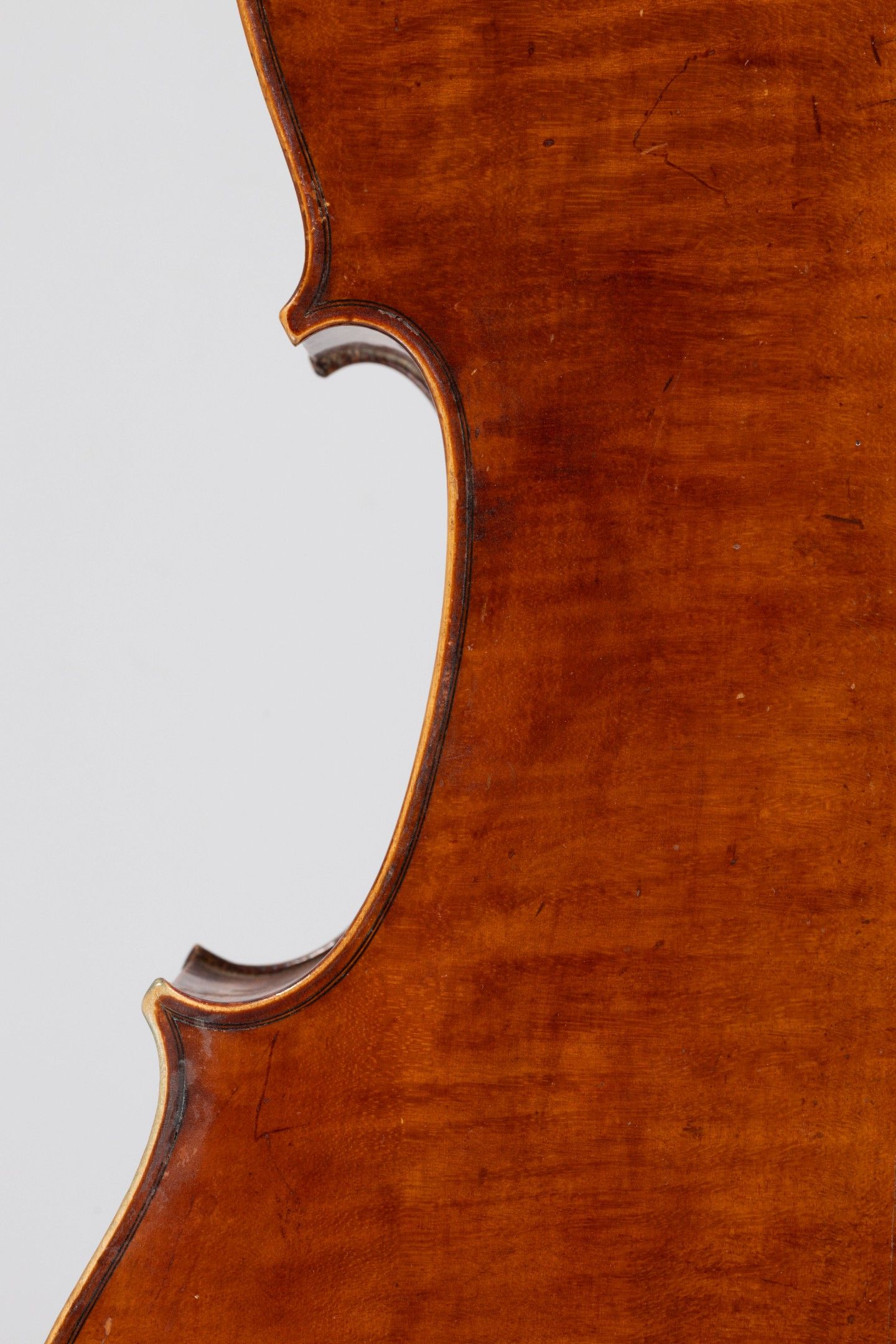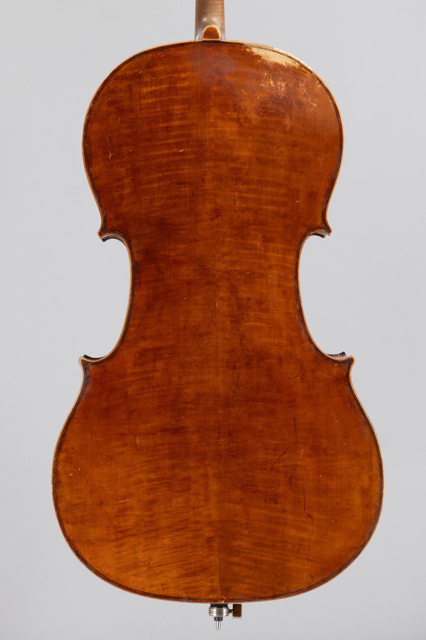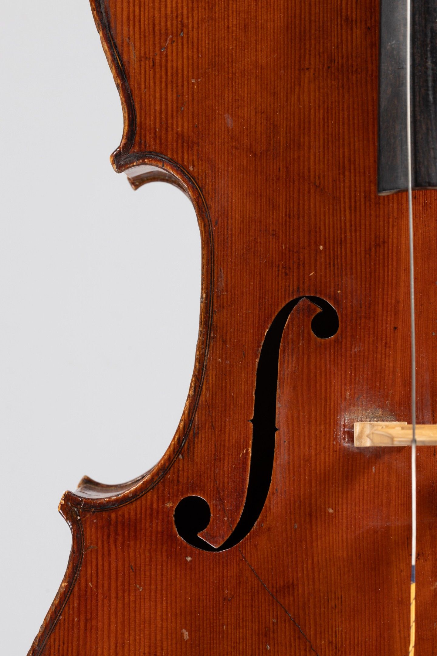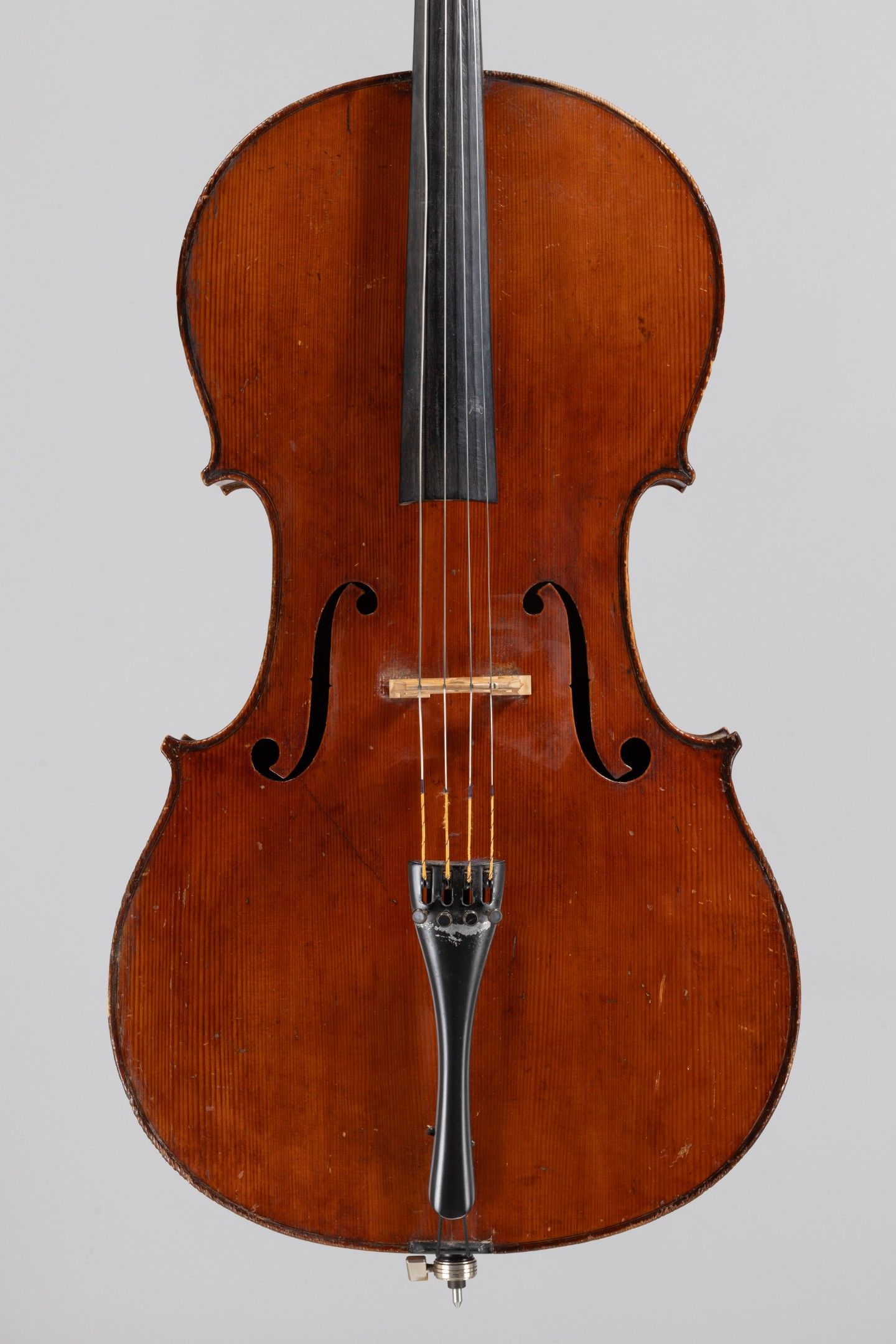 Violoncelle de l'école de DERAZEY, fait à Mirecourt vers 1880 ; ne portant ni étiquette, ni marque, ni signature. État : cassures aux éclisses. 762mm. [VRVI2512_065-VREXP3]