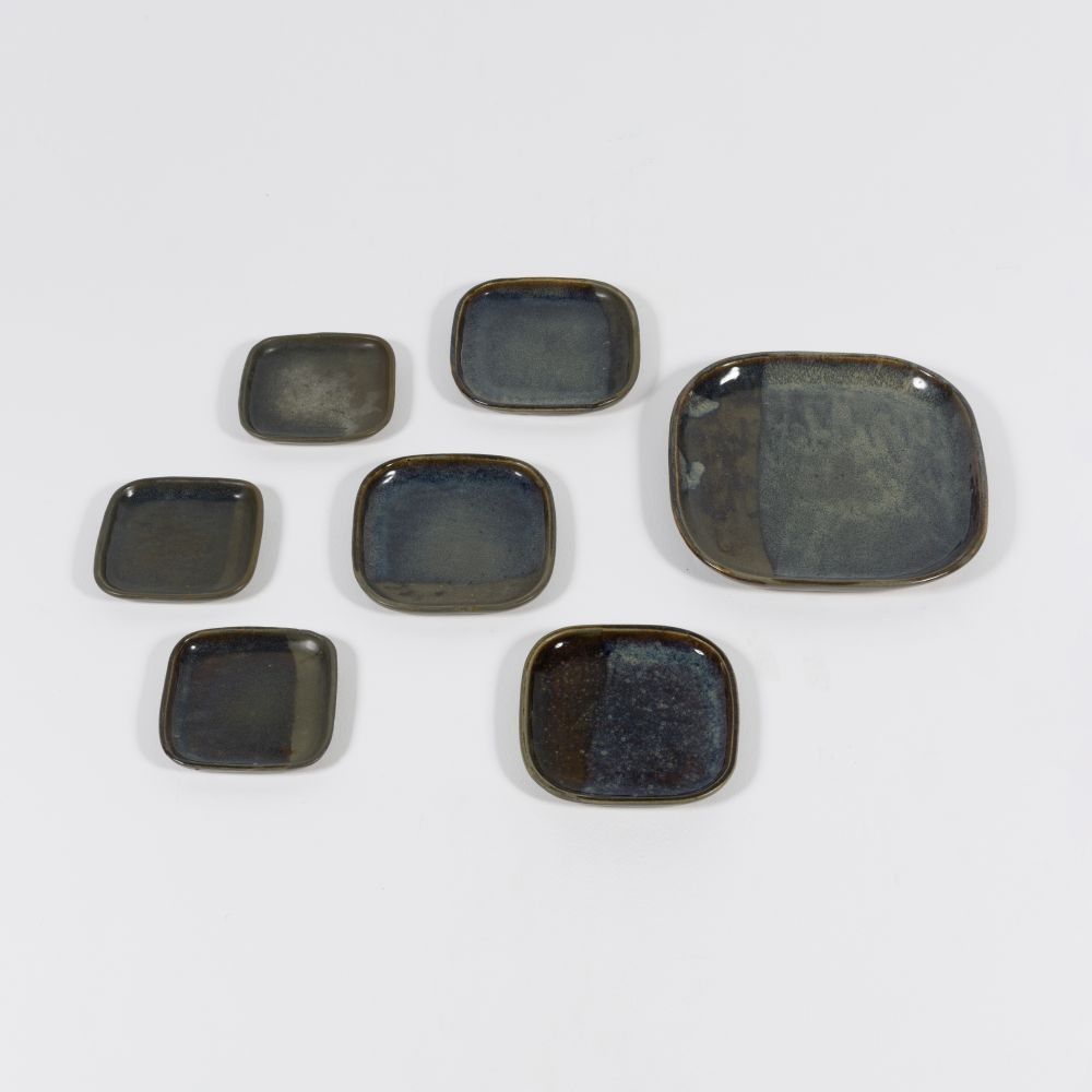 A set of six plates and one serving dish in partially glazed stoneware by Pierre Culot circa 1988 and circa 1985 with the artist's seals.