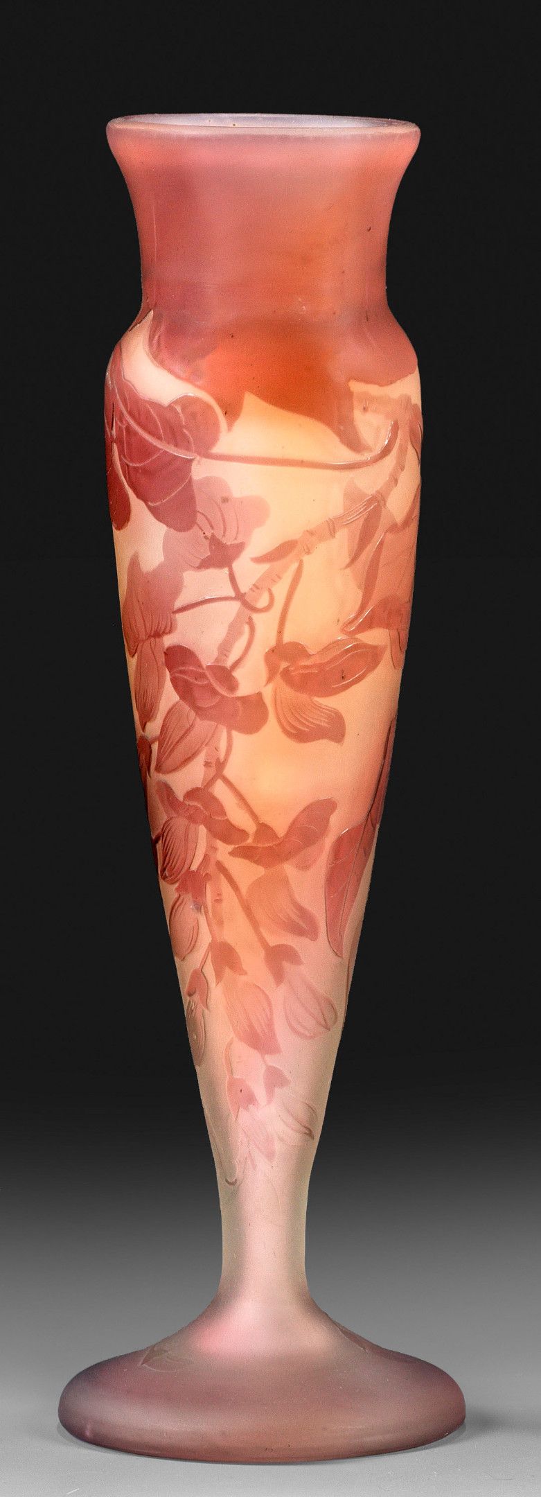 Ziervase mit Blauregen-Dekor von Gallé Kelchform mit ausgezogenem Lippenrand. Verre, farblos, abricotfarben et Magentatöne. Dans plusieurs ateliers, le décor est plus dense et plus poli, avec des rangs bleus de Blauregen (bzw. Glyzinien oder Wisteria) sur un fond mat. Drei Streublumen am Fuß. Signe. Gallé. H. 24 cm.
