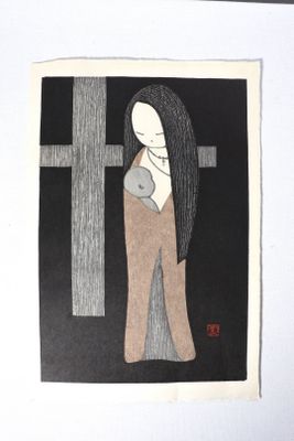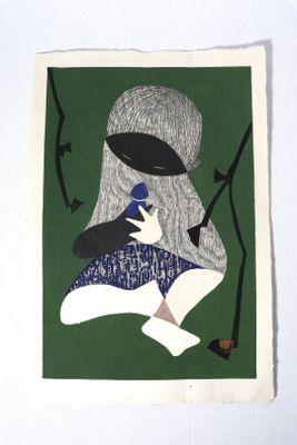 Estampe originale par Kaoru Kono ou Kawano "Mère et enfant" …