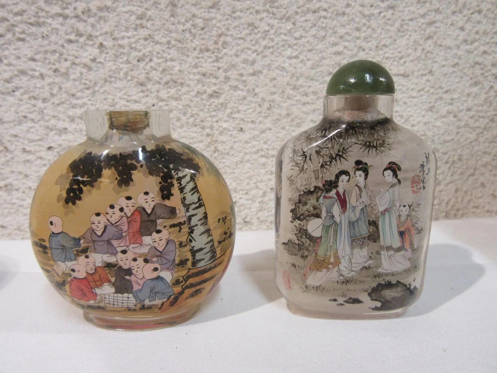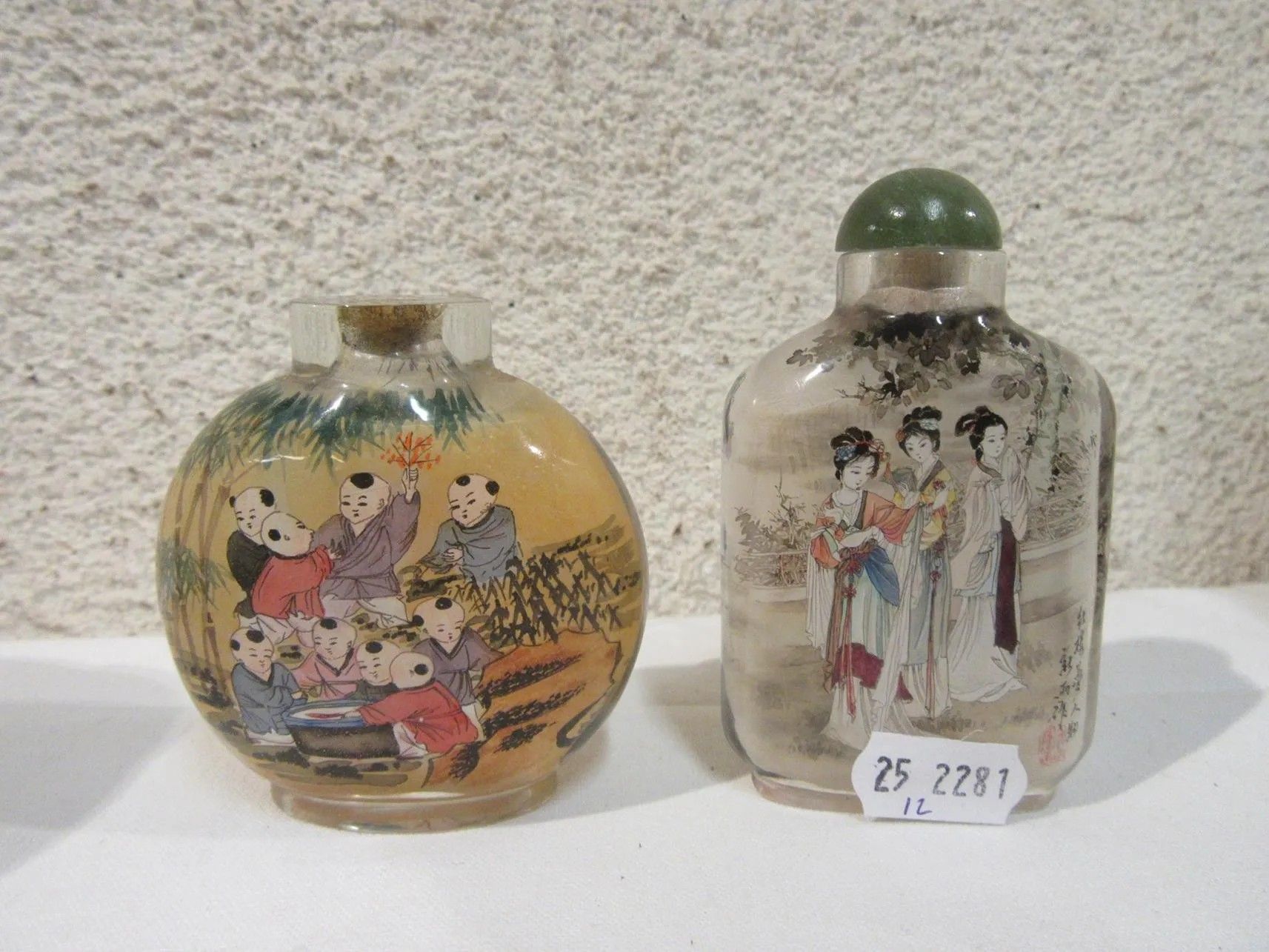 344-39 DEUX FLACONS A TABAC EN VERRE PEINT A DECOR DE PERSONNAGES - Hauteur 7/8.5 cm (un bouchon manquant 30 - 40 EURO