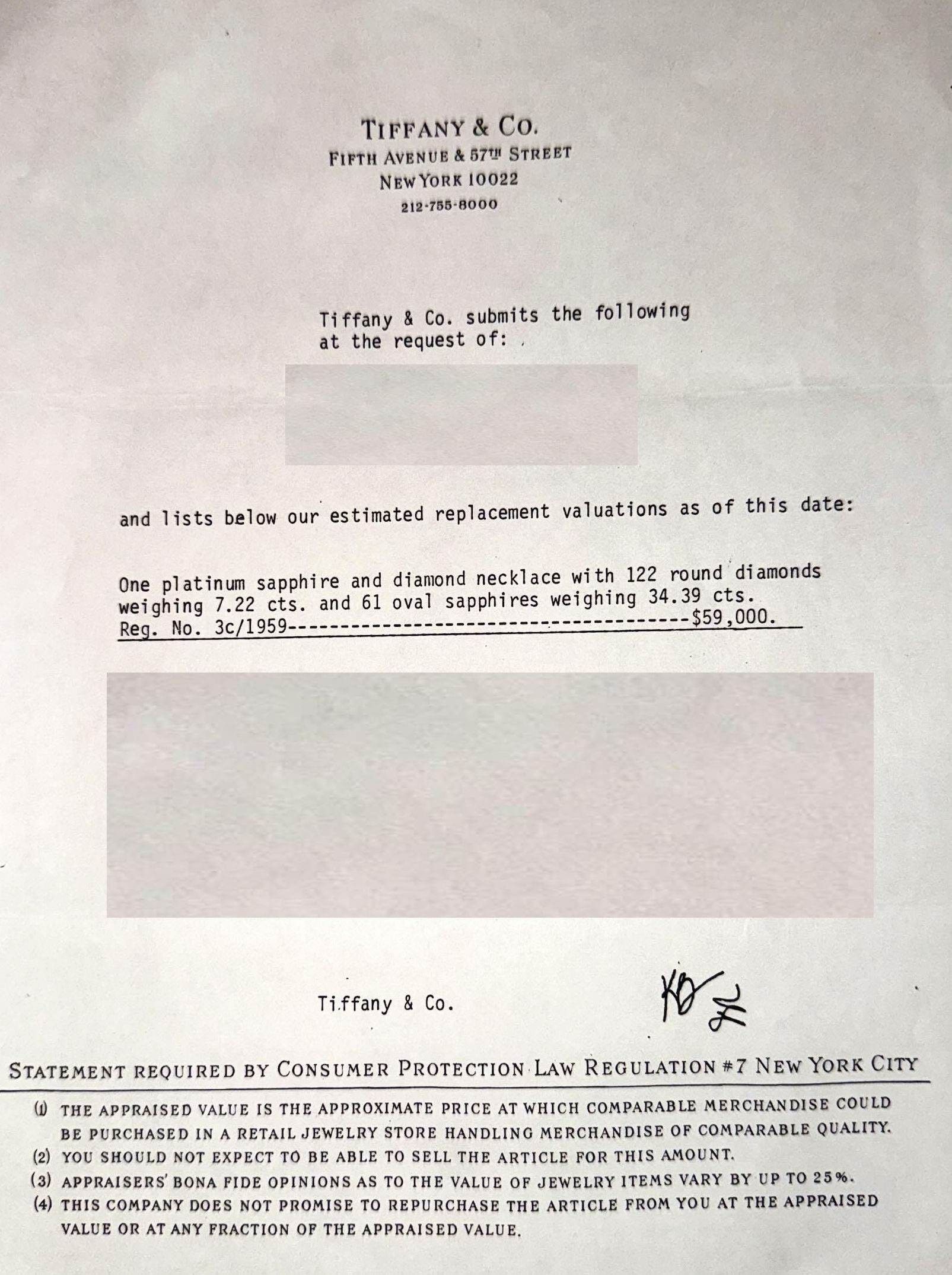 Avec une évaluation d'assurance de Tiffany & Co, New York, indiquant une valeur de remplacement de 59 000 USD à l'époque.