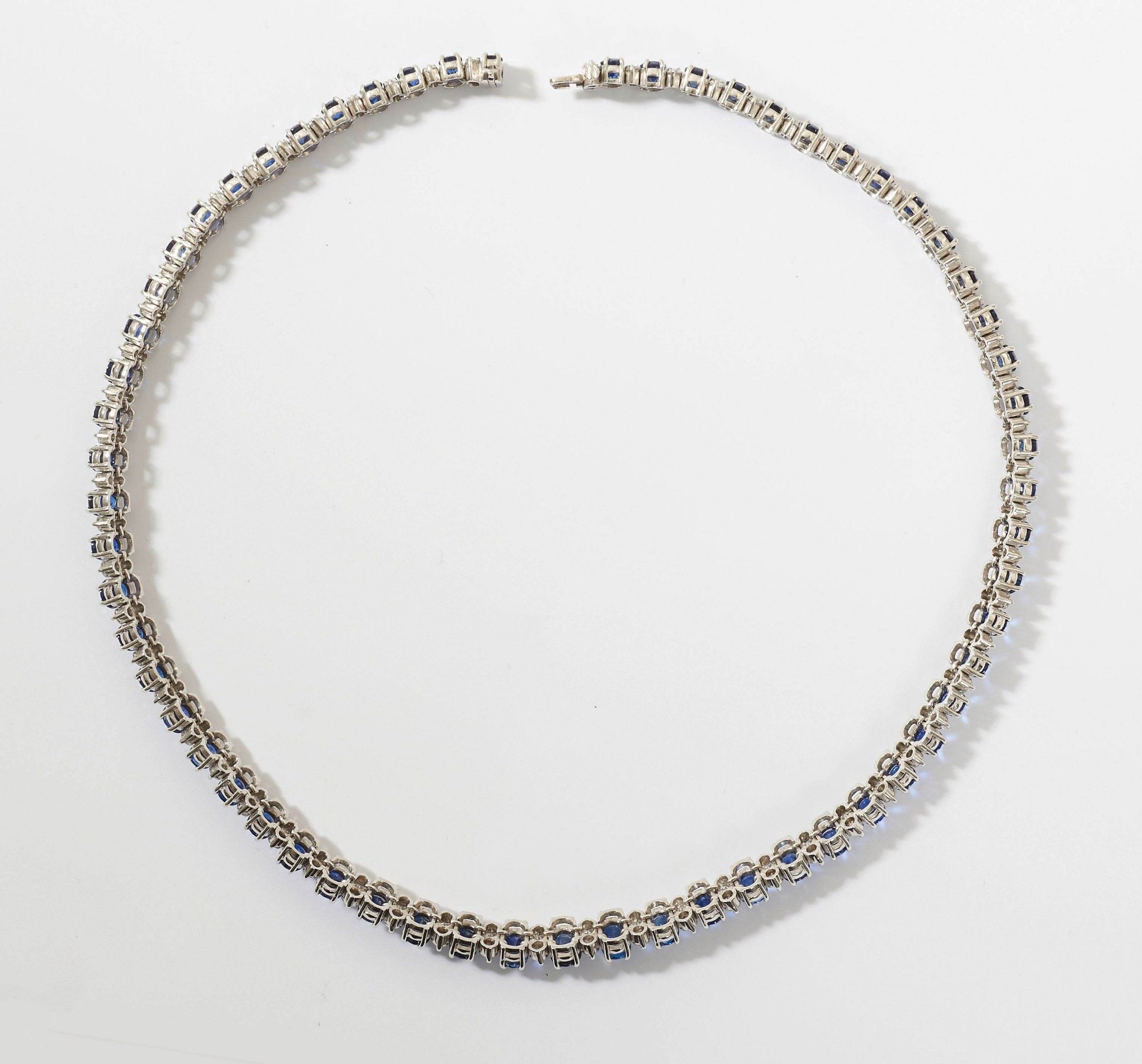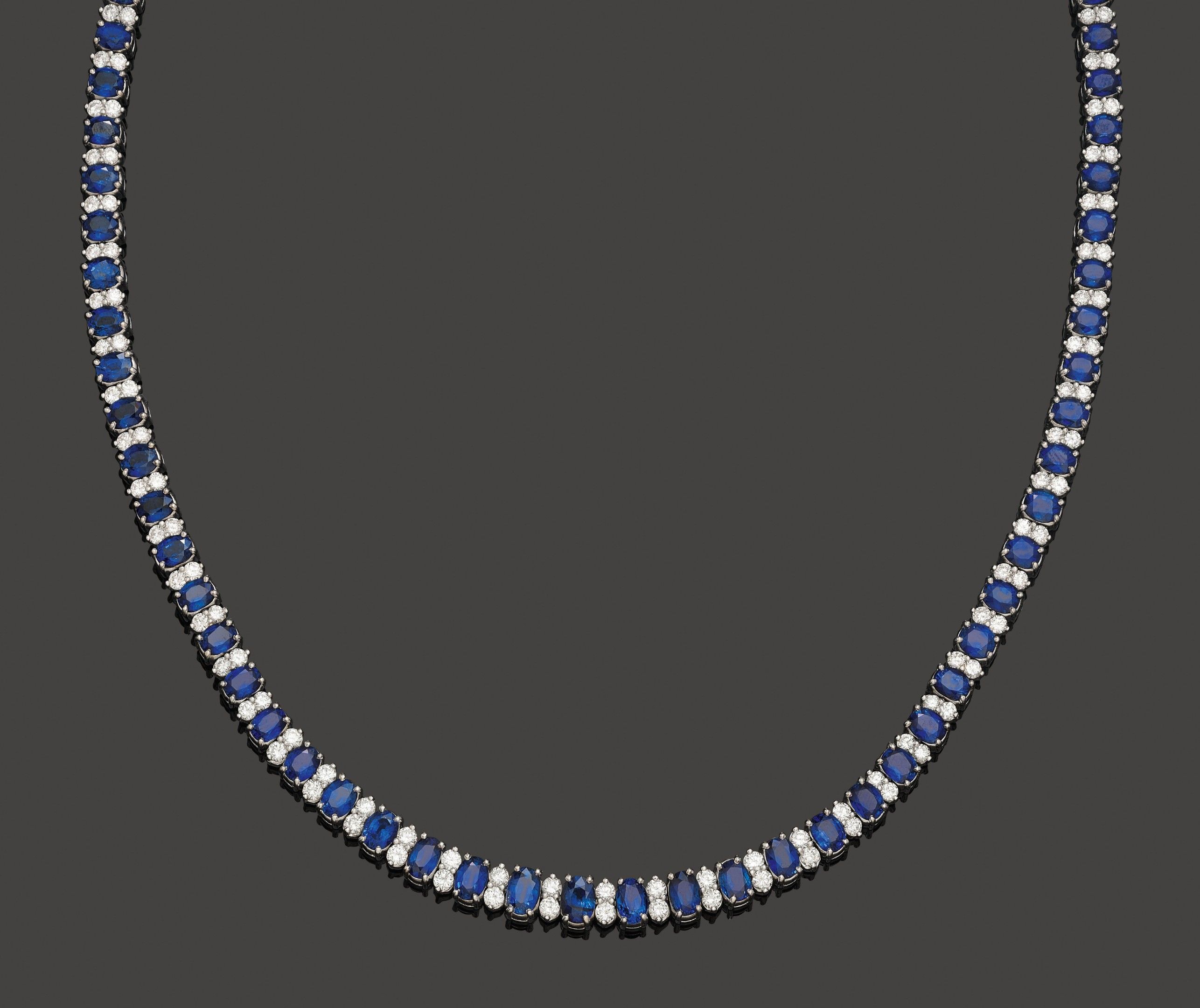 Collier intemporel serti de saphirs totalisant environ 34,3 ct et de diamants pesant environ 7,2 ct. Estampillé no. 386. L ca. 40 cm.
