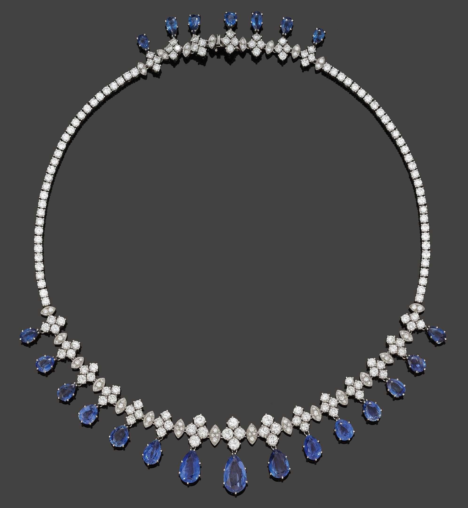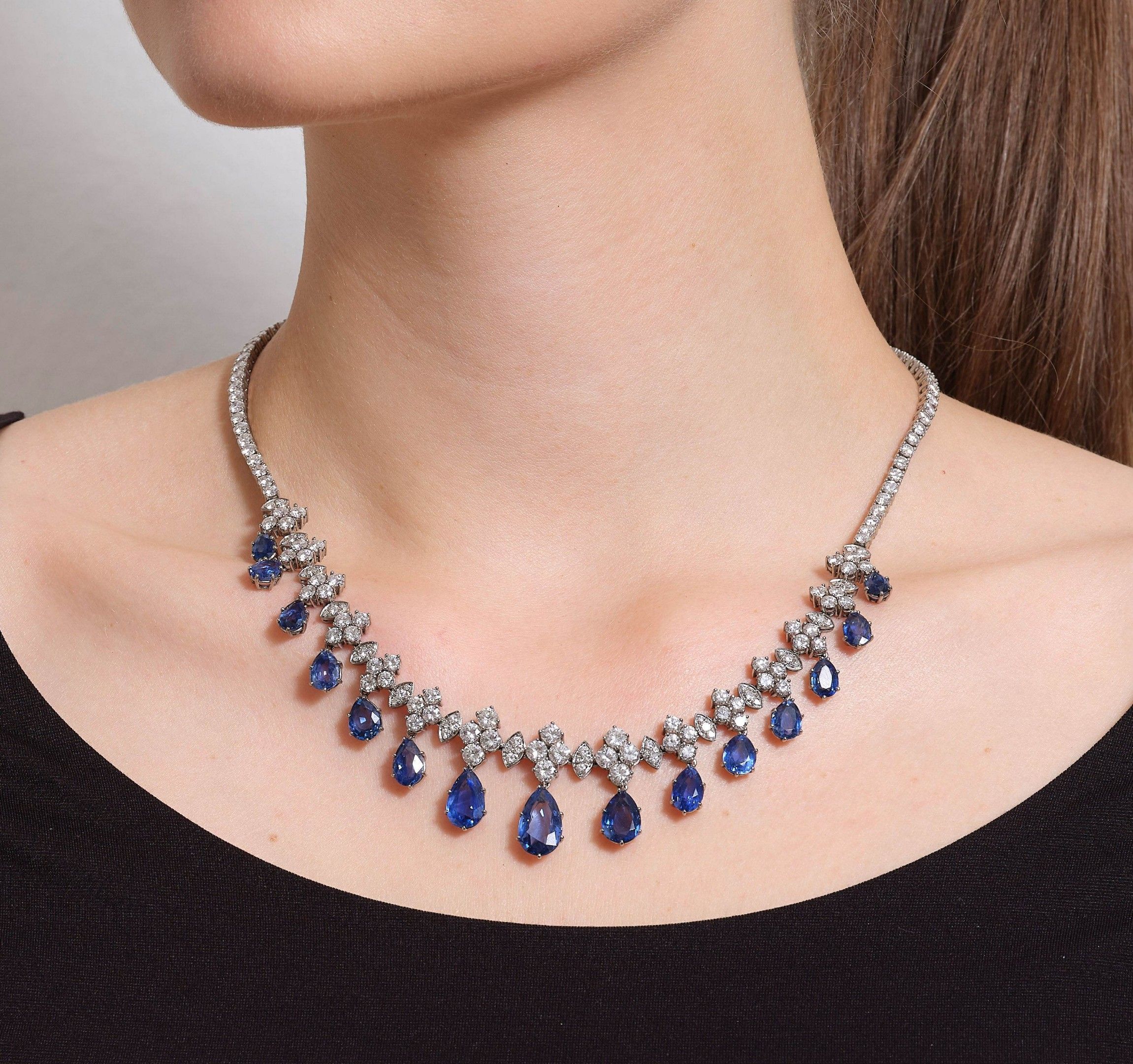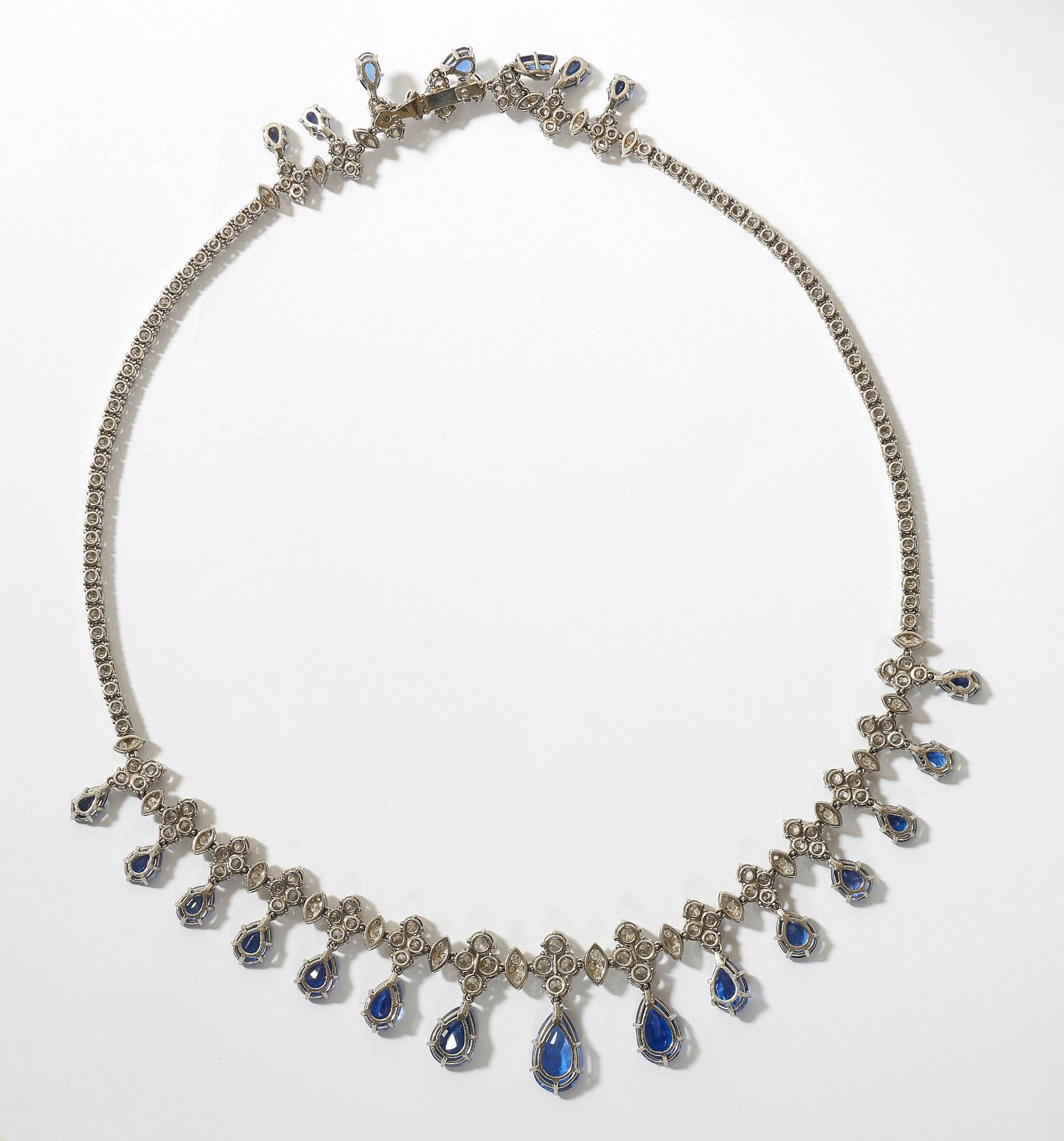 Serti de diamants taille brillant, le devant décoré de 15 éléments sertis de diamants, chacun suspendant un saphir en forme de poire, le revers rehaussé de 7 saphirs en forme de poire. Poids total des saphirs environ 17,0 ct, Ceylan, sans indication de traitement à haute température, un traitement à basse température ne peut être exclu. Poids total des diamants taille brillant ca. 15.0 ct. L ca. 45 cm.