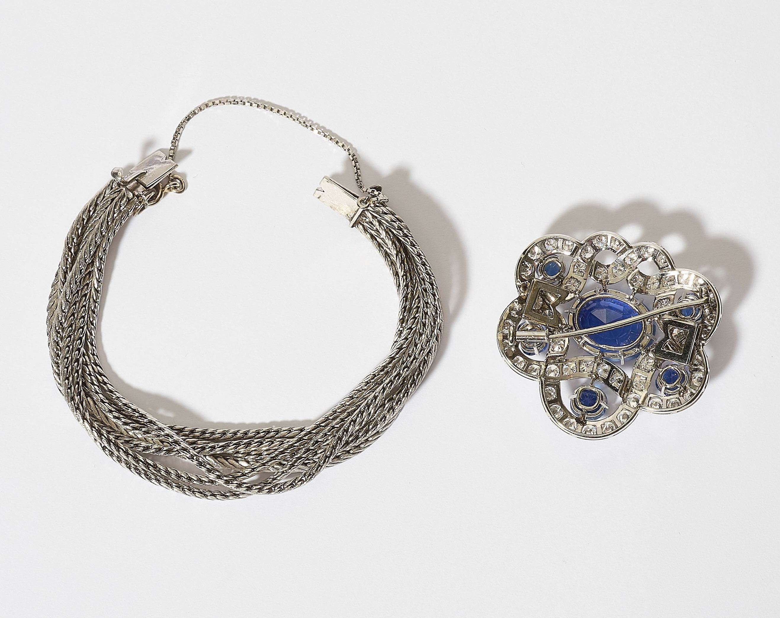Ensuite un bracelet, or blanc 750, permettant à la broche d'être portée comme un bracelet, ca. 35g.