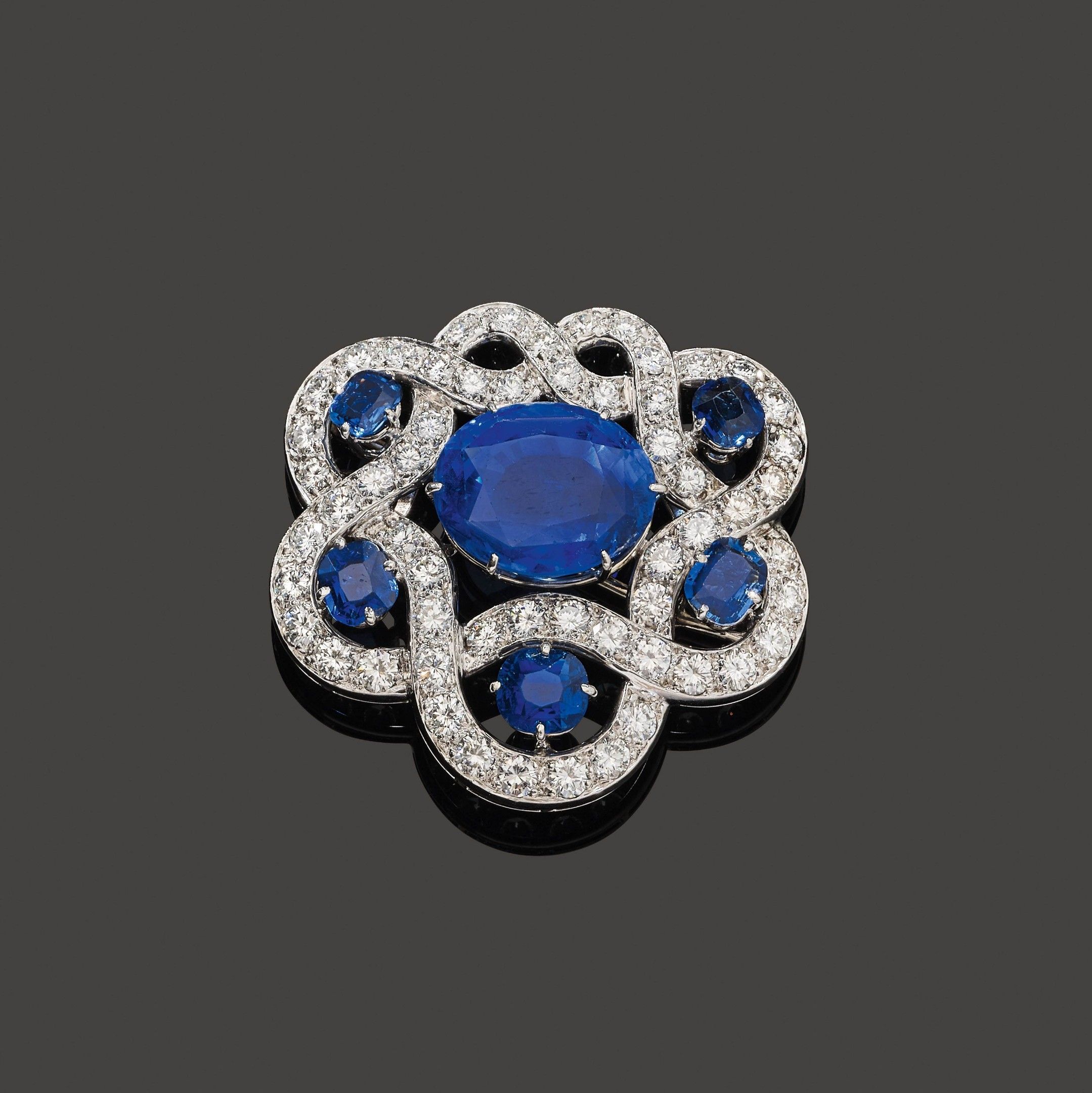 Centré par un saphir ovale d'environ 15,0 ct, Ceylan, non chauffé, entouré de 5 saphirs totalisant environ 2,3 ct, décoré de diamants totalisant environ 2,5 ct. Environ 4,0 × 3,5 cm. 4,0 × 3,5 cm.