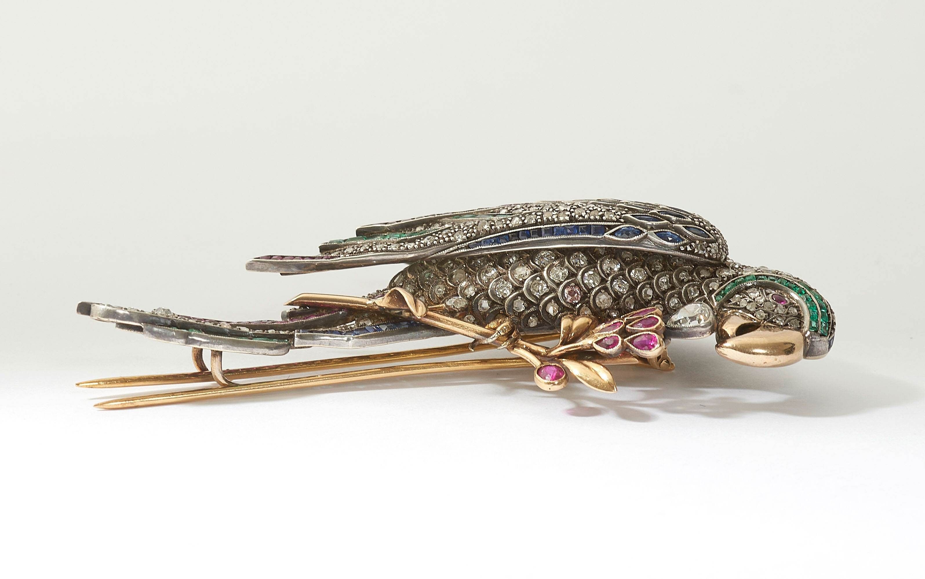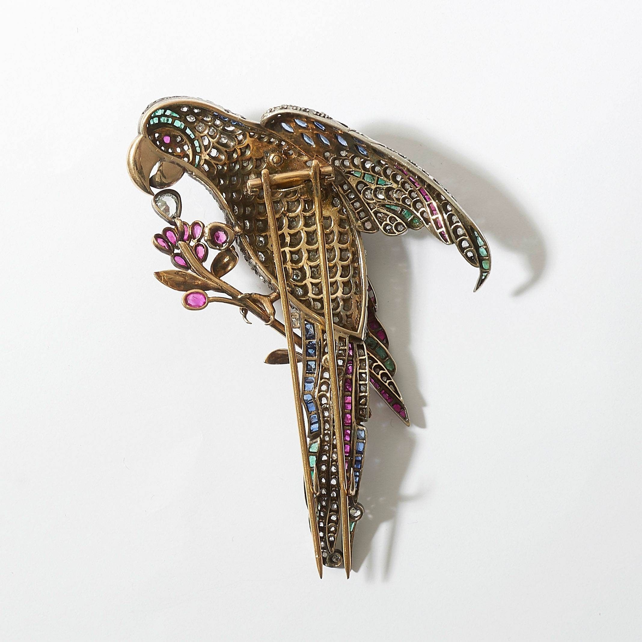 Broche clip représentant un perroquet sculpté perché sur une branche florale, les plumes étant serties de diamants circulaires et simples, de petits diamants taillés en rose, de navettes de saphir et de carrés de rubis, de saphir et d'émeraude. La branche florale est sertie d'un diamant de taille ancienne en forme de poire et de rubis de différentes formes. Poids total des diamants circulaires et taille unique environ 1,0 ct, poids total des pierres de couleur environ 2,6 ct. Quelques carrés manquants. L ca. 8.7 cm.