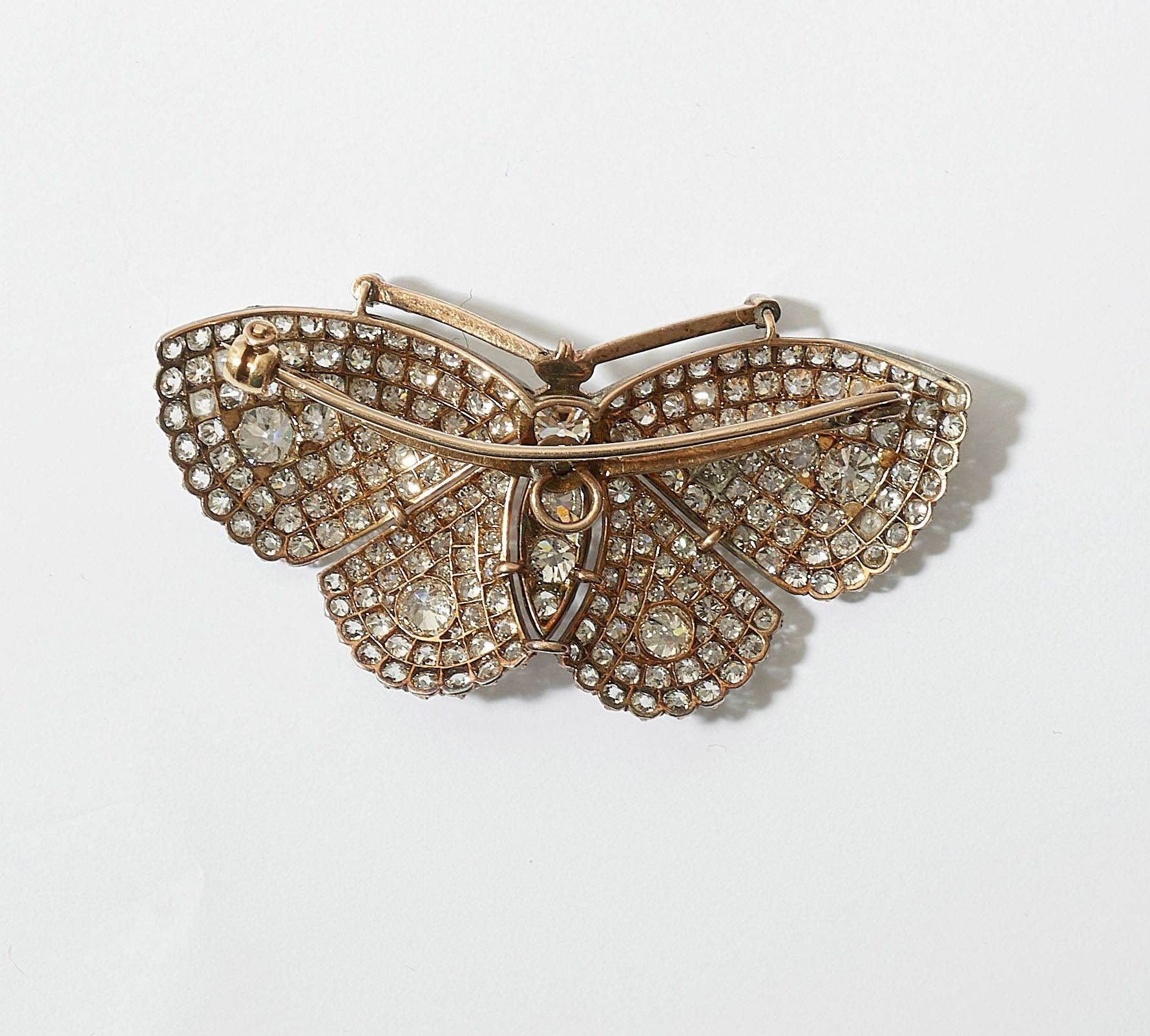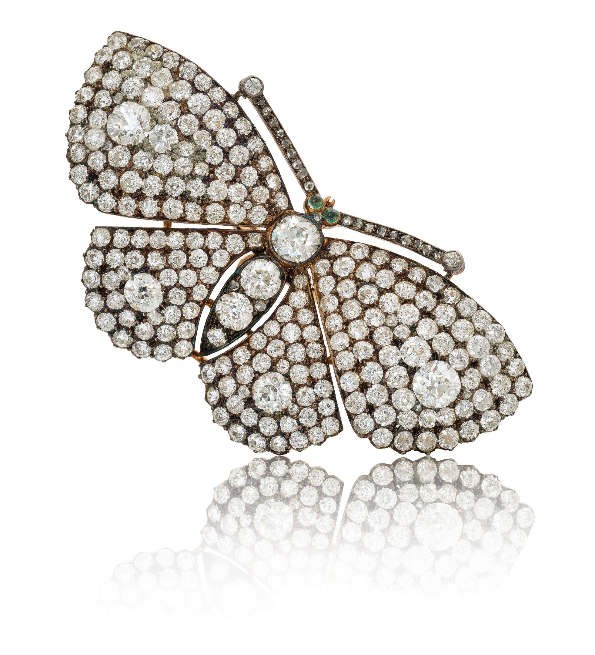 Broche papillon sertie de diamants circulaires et simples totalisant environ 6,1 ct, de très belle couleur pour l'époque et bien assortis. Les yeux sont sertis de deux petits cabochons d'émeraude. Environ 3 × 6 cm. 3 × 6 cm.