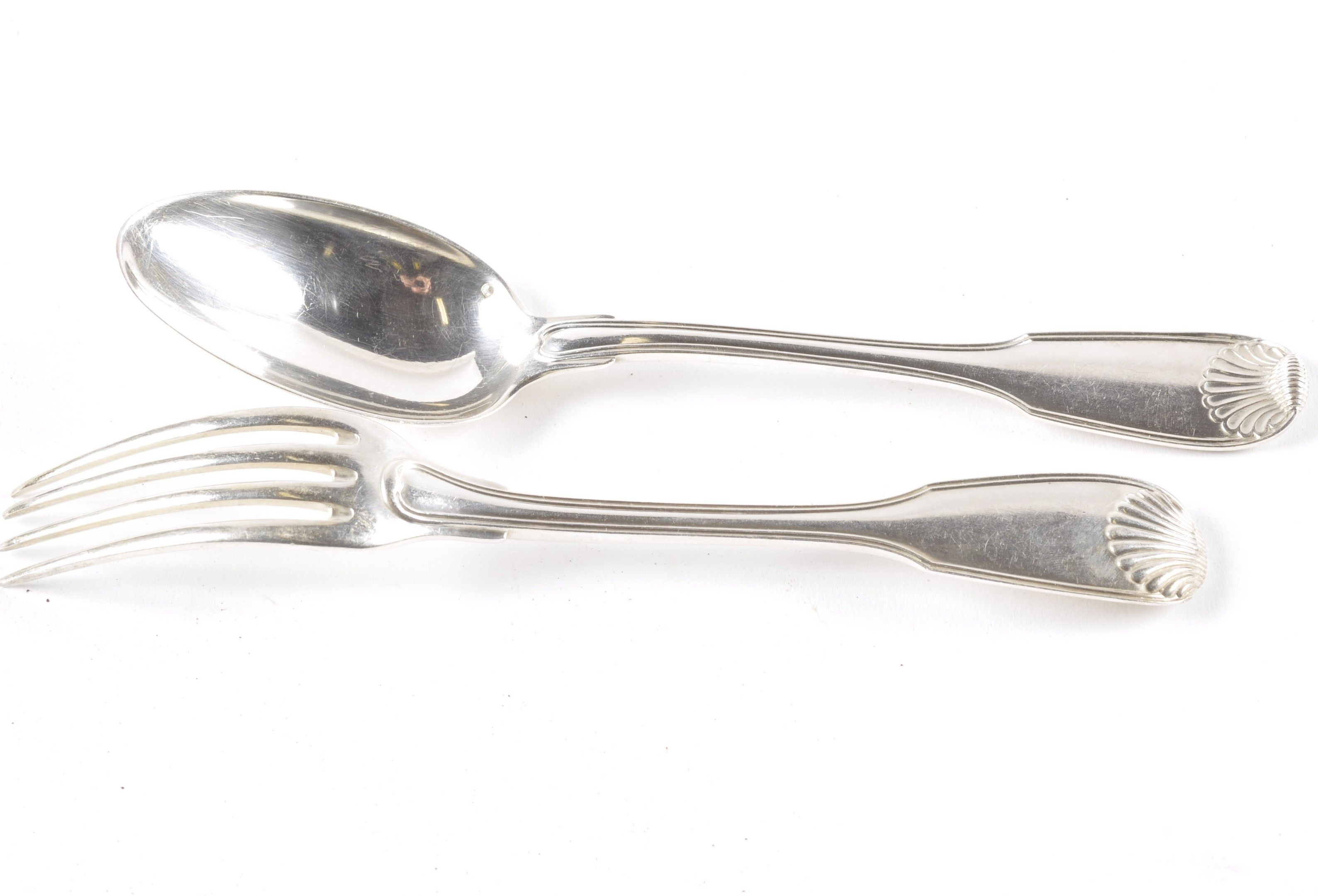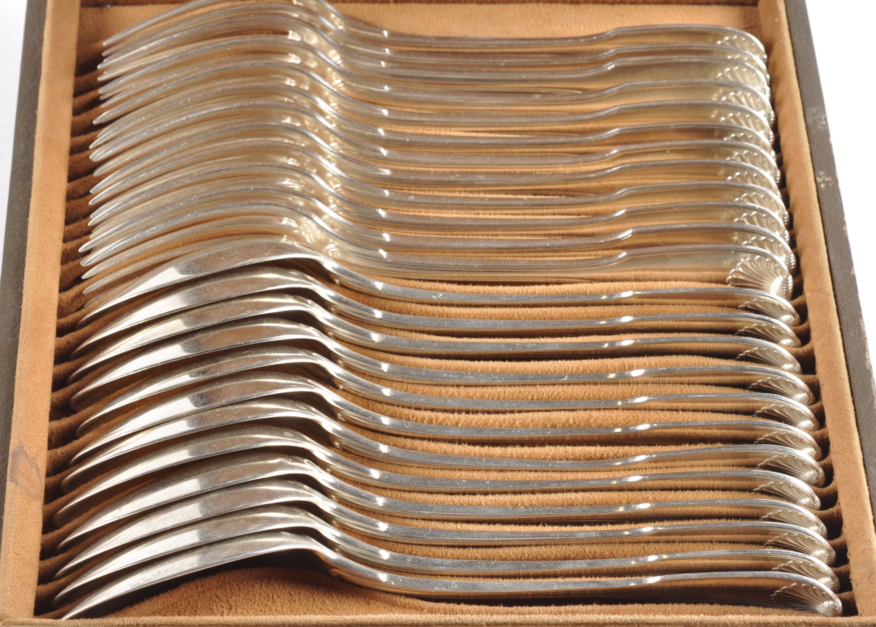 12 Grands couverts en argent (Poinçon Minerve) modèle coquille. Poids : 2170 gr.