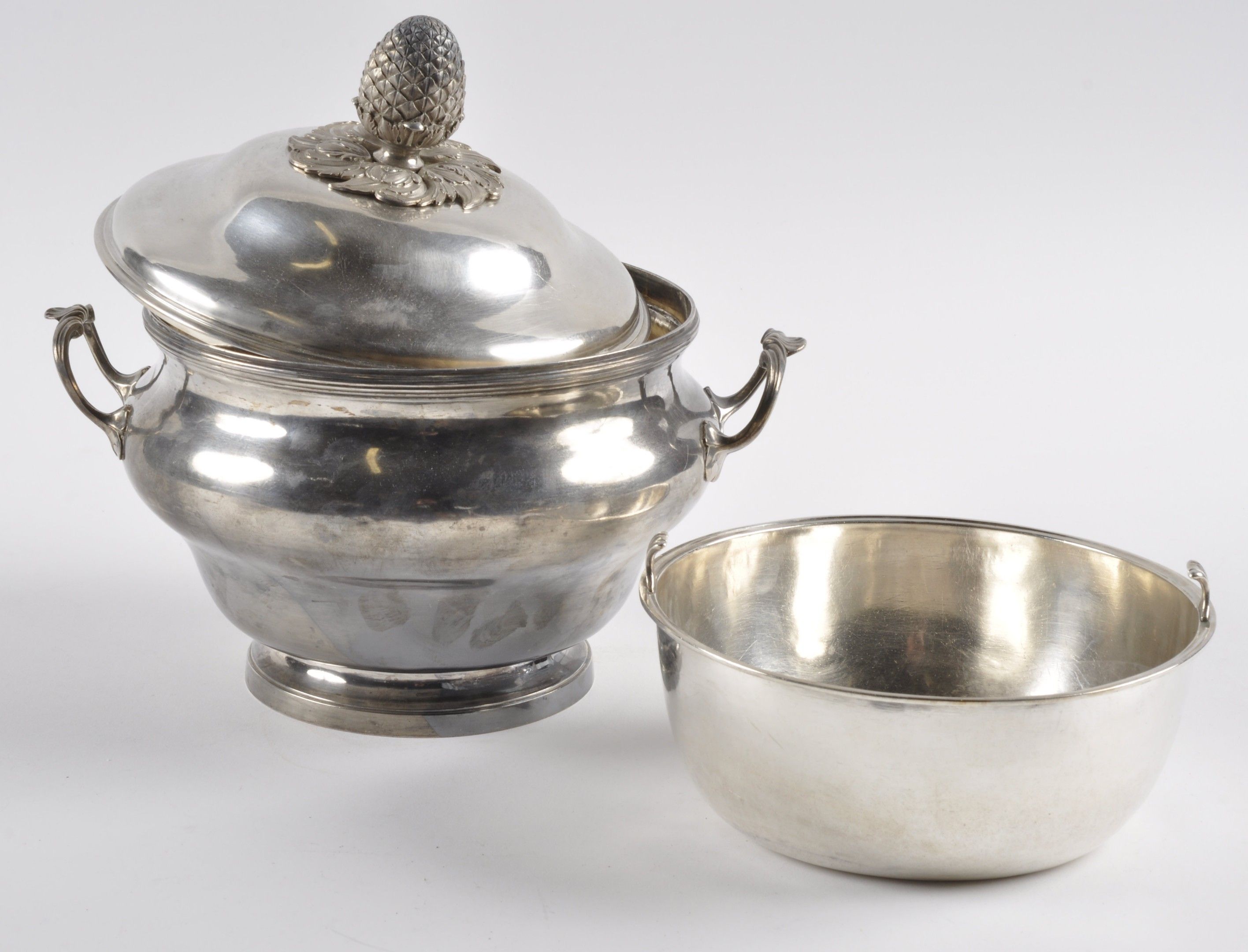 Une soupière en argent à deux anses.