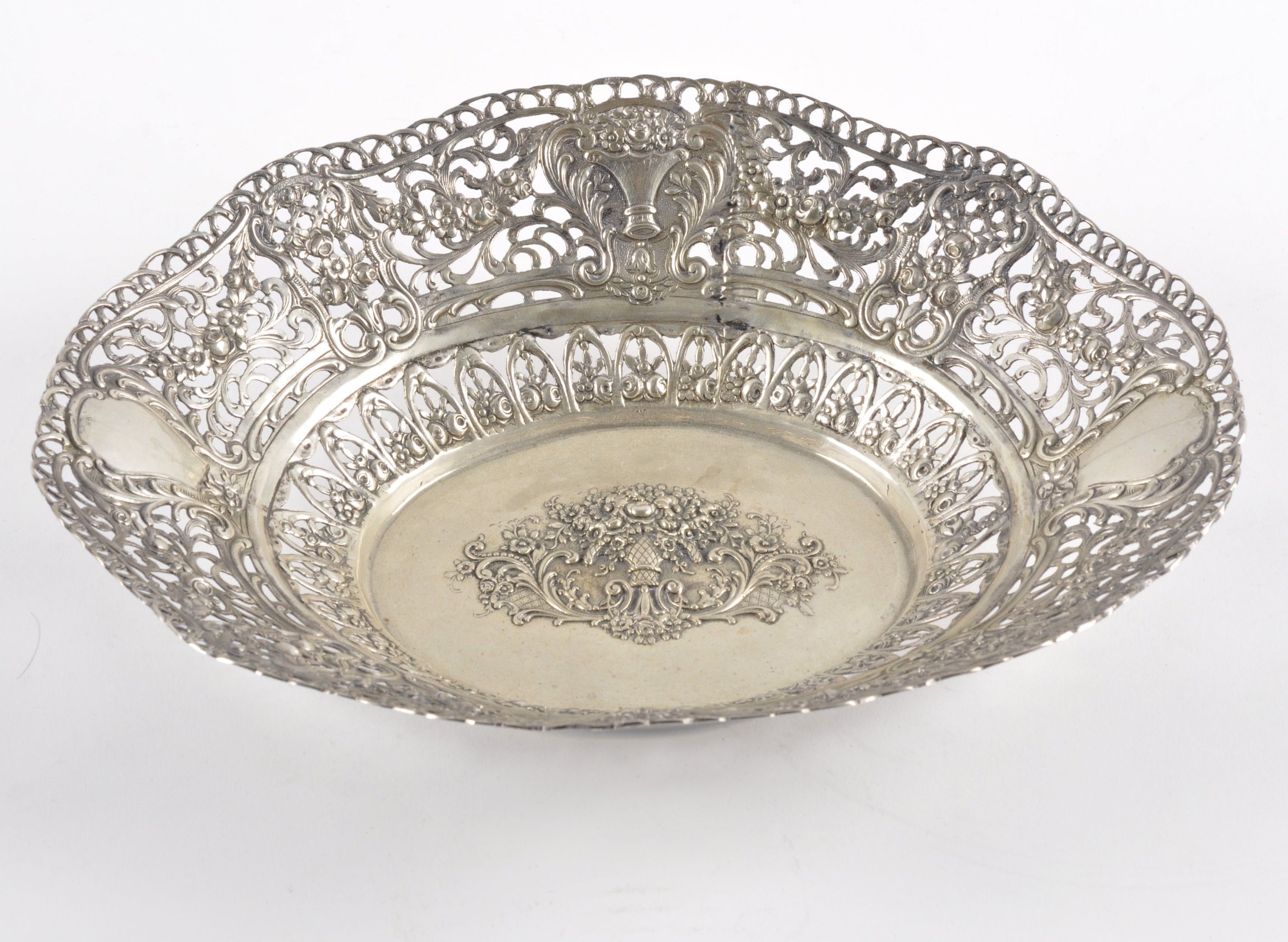 Une corbeille ovale en argent (800 millièmes) à décor ajouré…