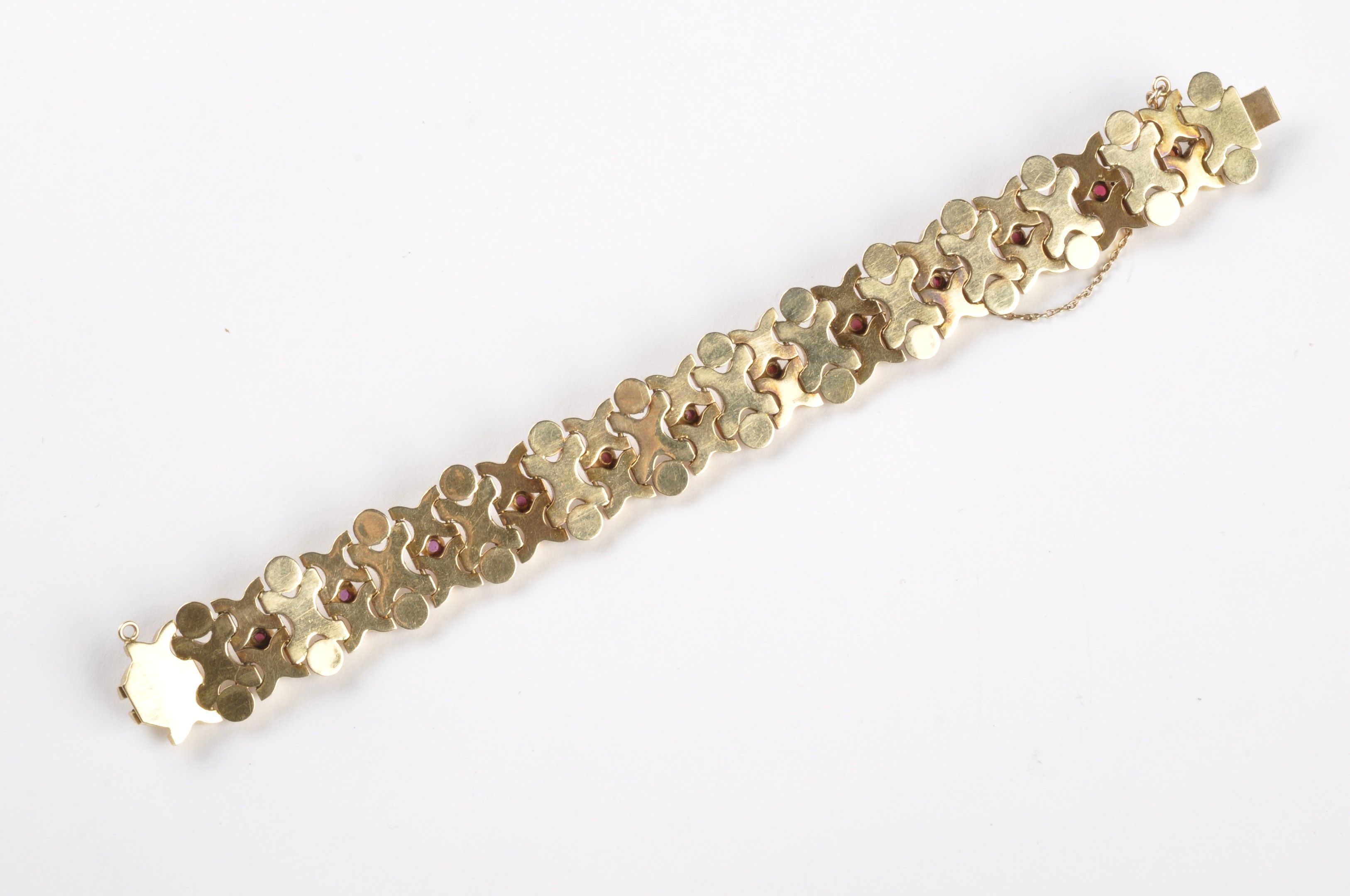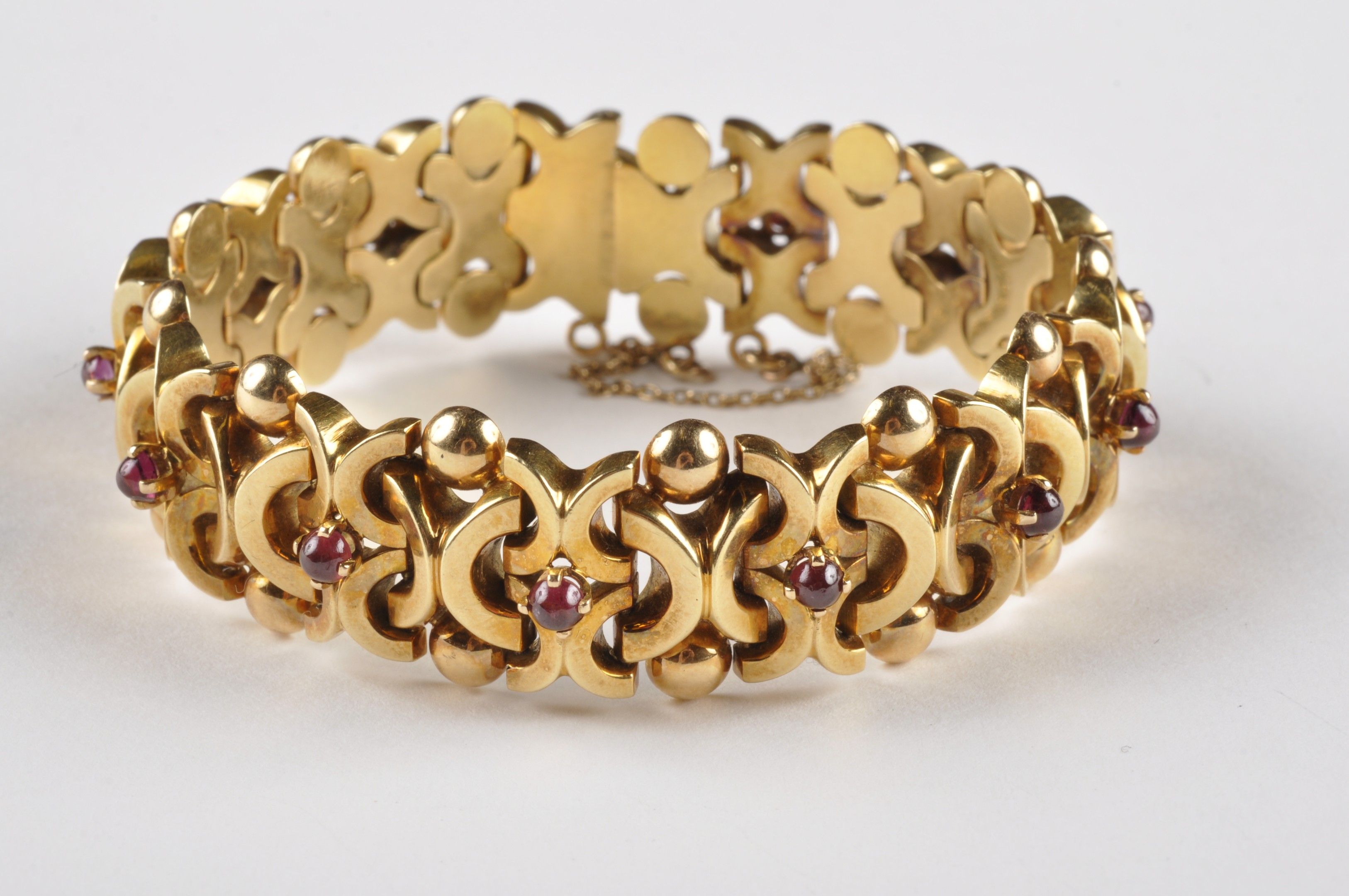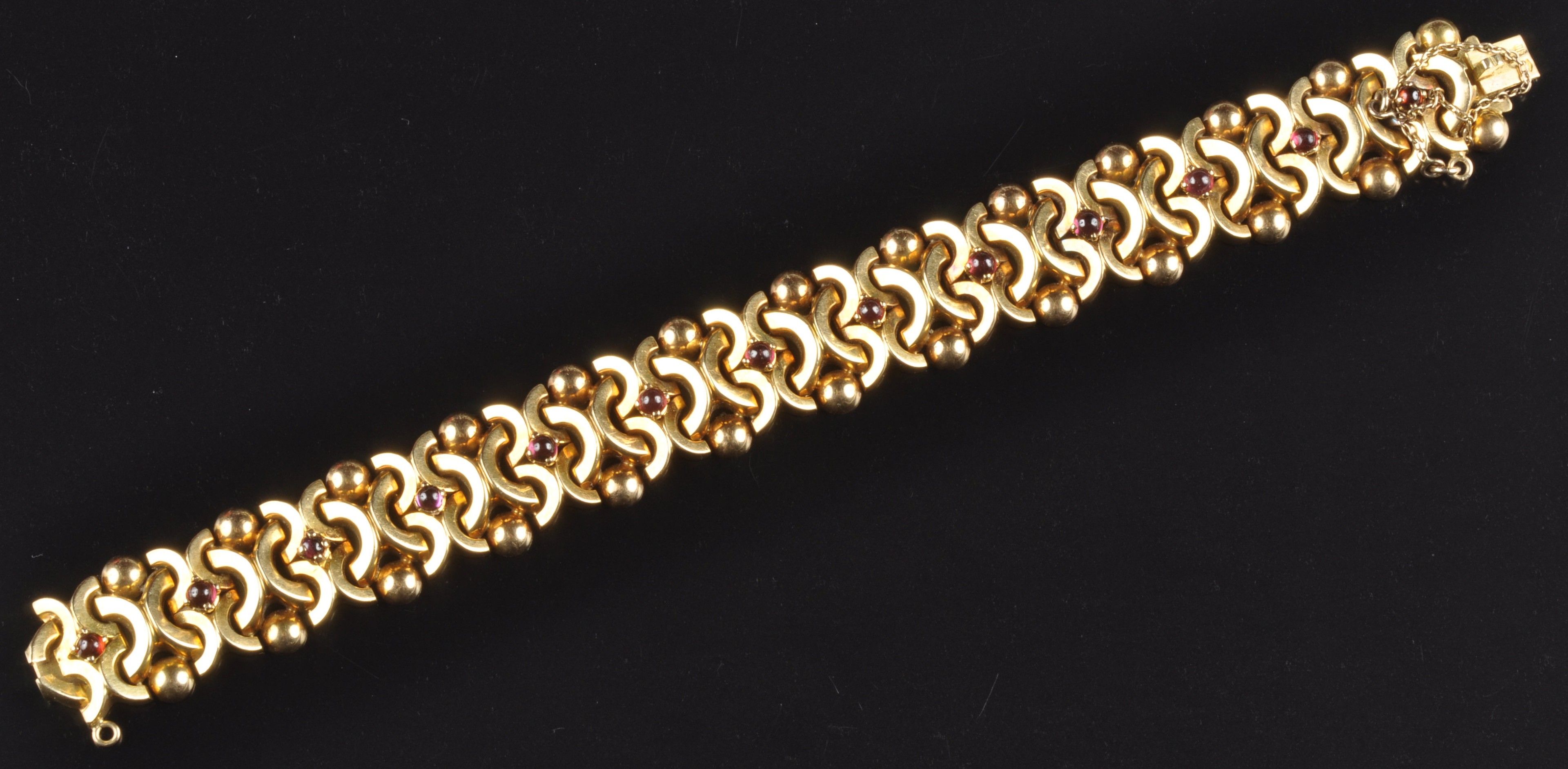 Bracelet à motifs entrelacés et de demi boules en or jaune (750 millièmes) rehaussé de cabochons de pierres fines (grenats, améthystes). Travail vers 1950. Une pierre d’imitation avec cassure. Resuivre sertissage. Egrisures. Déformations. Oxydations. Larg :19 mm. PB: 43.8g