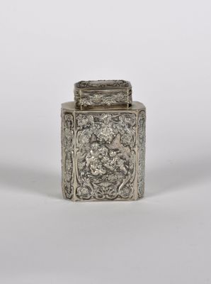 Boîte à thé en argent (800 millièmes) à décor repoussé de pe…