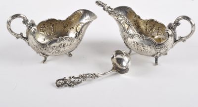 Deux saucières et deux cuillères en argent (800 millièmes) à…