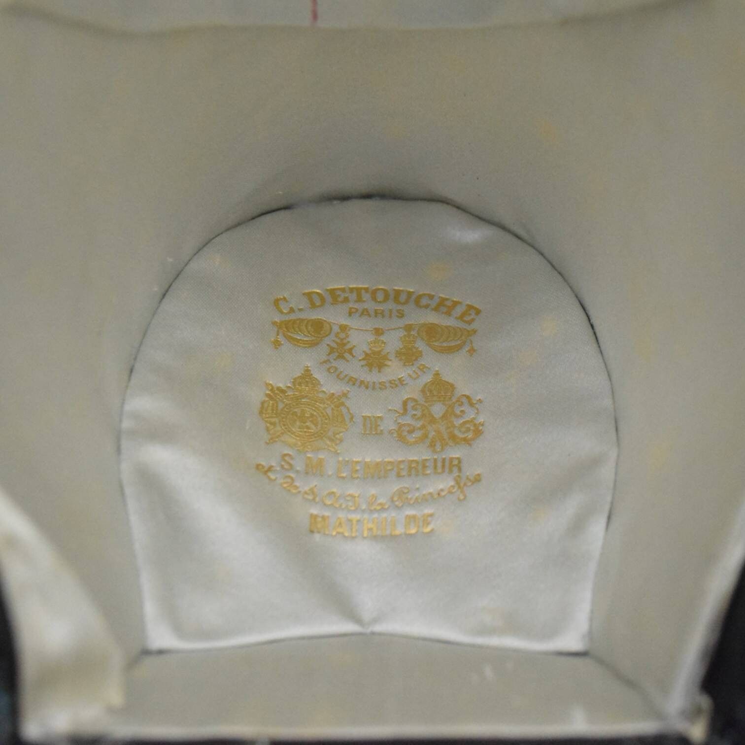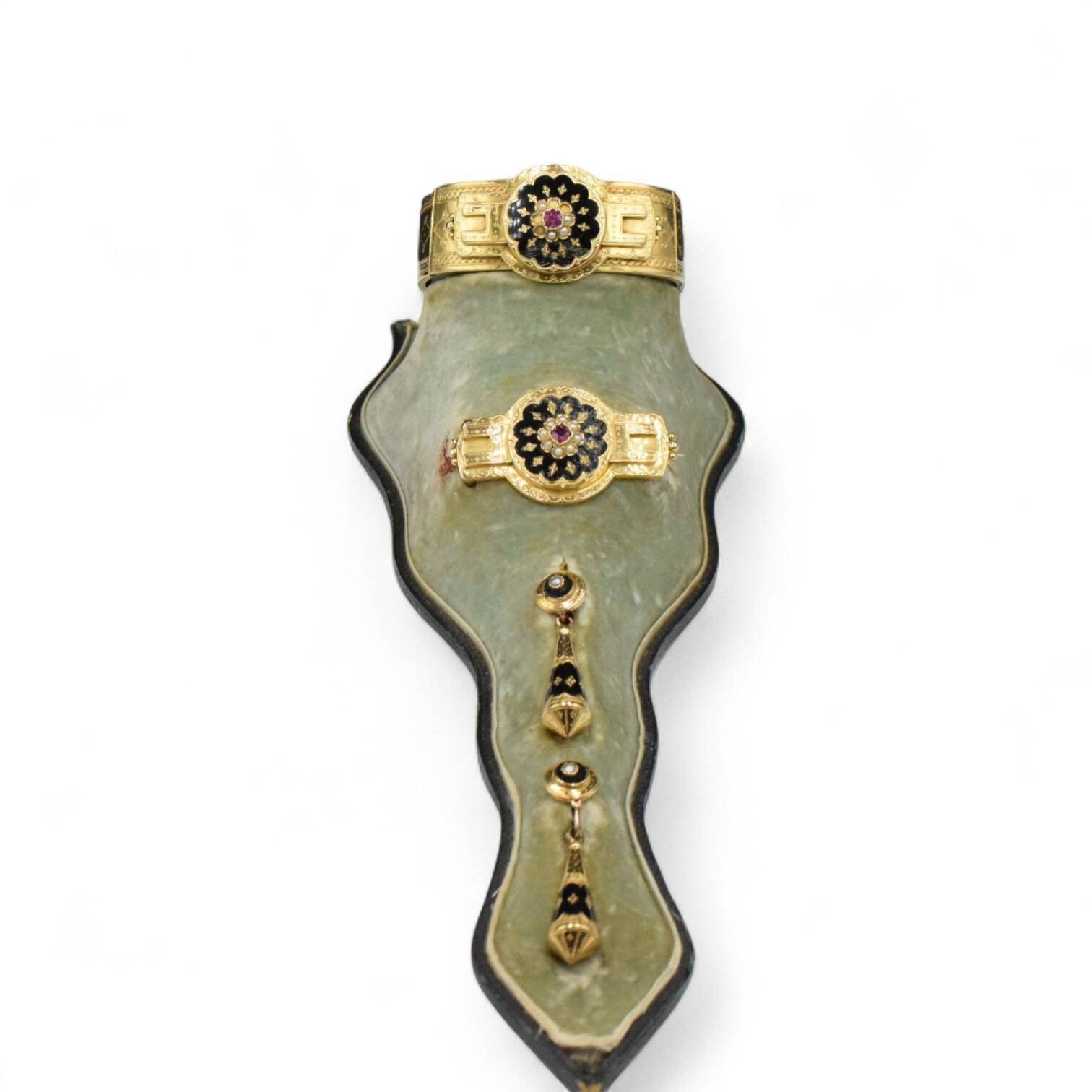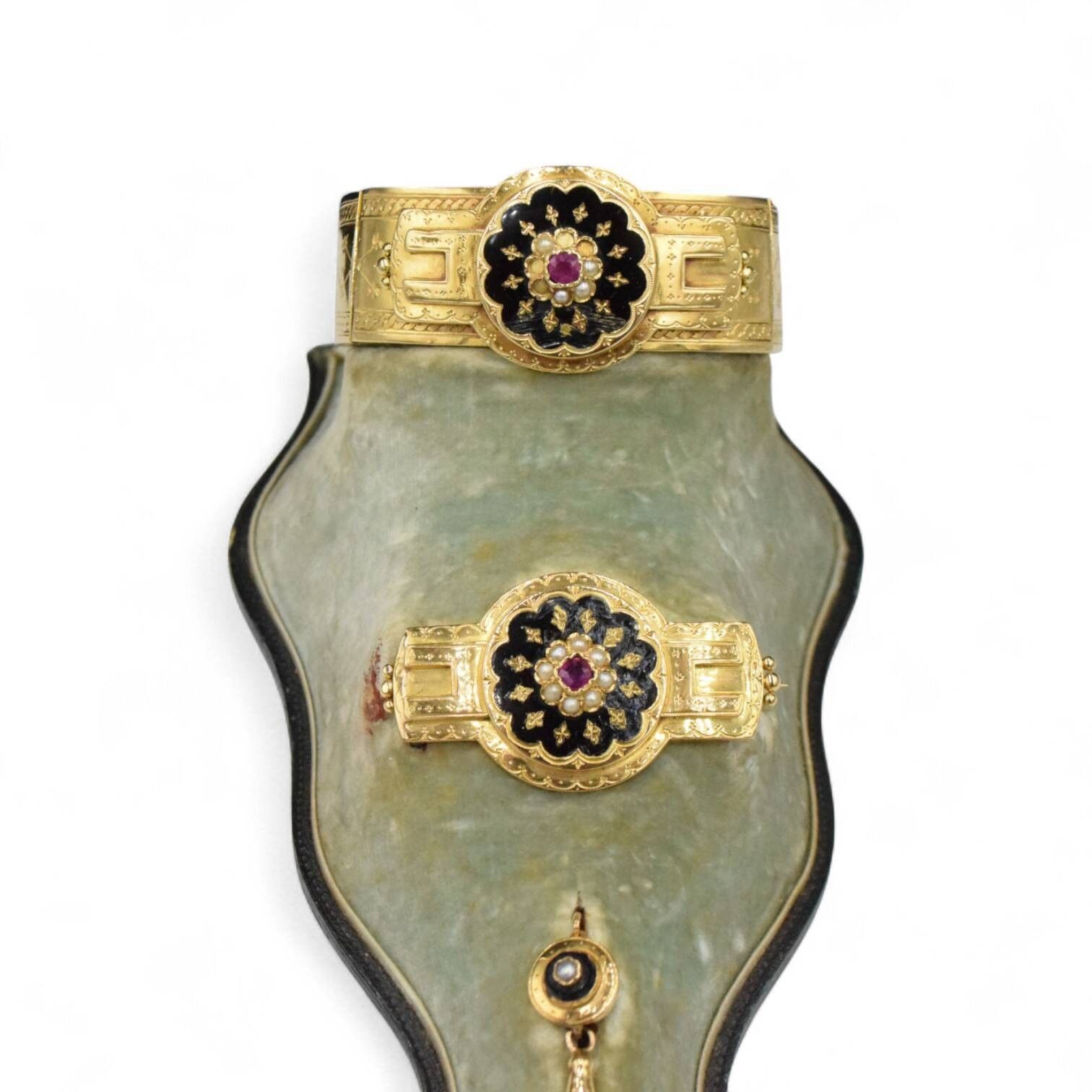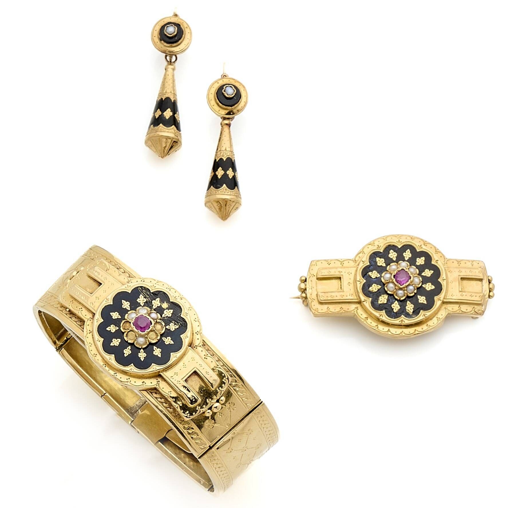 Parure en or 18K (750) à décor émaillé, demi-perles et rubis comprenant : un bracelet articulé ouvrant, une broche et une paire de pendants d'oreilles en or 18K assortis. Conservée dans son écrin, Maison C. Detouche. Dimensions bracelet : 17 x 2 cm environ. Longueur broche : 4,4 cm environ. Hauteur pendants : 4,4 cm environ. Poids brut : 42 g (accidents, manques, déformations)