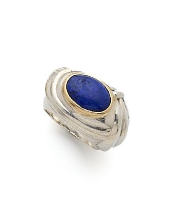 Bague drapée en argent, sertie d'un lapis-lazuli cabochon.
