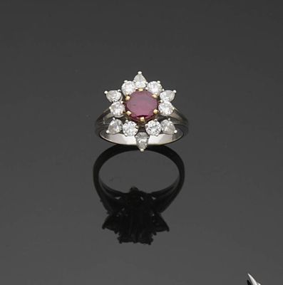 Bague en fils d'or gris 18K (750), ornée d'un rubis rond ent…