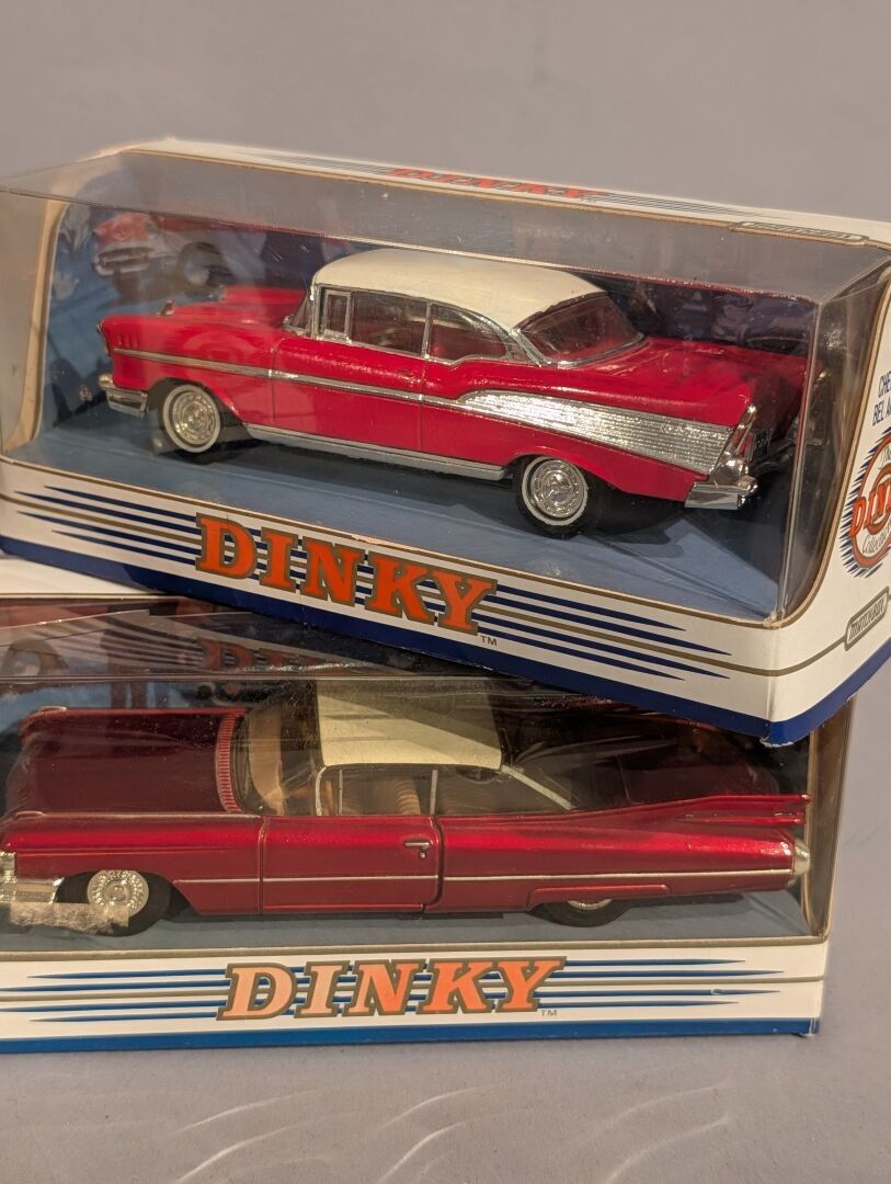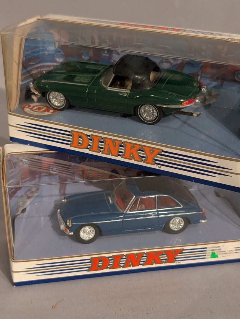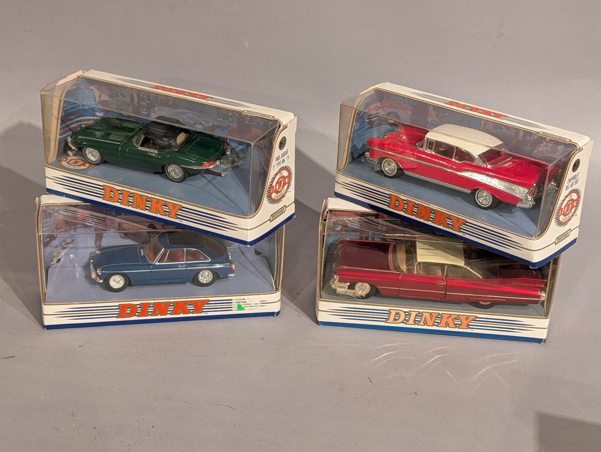 The DINKY collection - MATCHBOX - 1968 Jaguar "E" Type MK - 1959 Cadillac coupe de ville - MGB GT 1965 - Chevrolet Bel Air 1957 Dans leur coffret