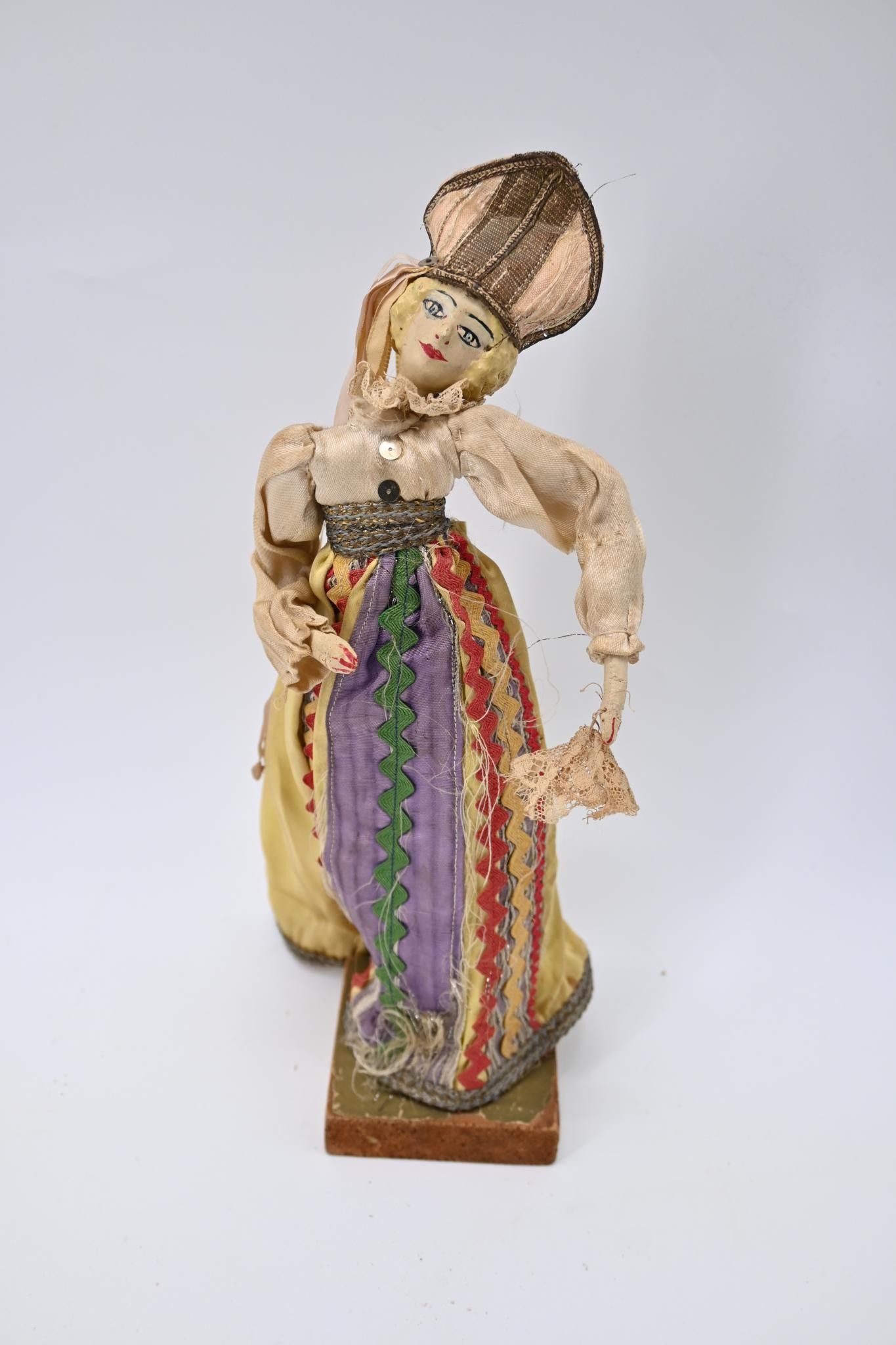 Poupée corps et tête en composition. Cou accidenté. Vient avec son socle en bois. Longueur : 31 cm En l'état