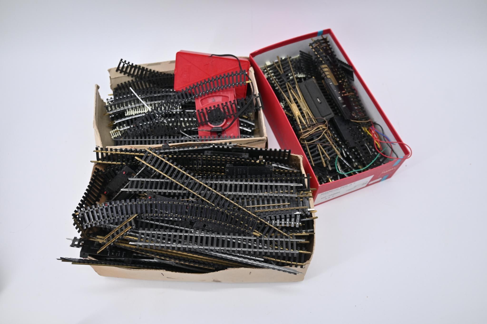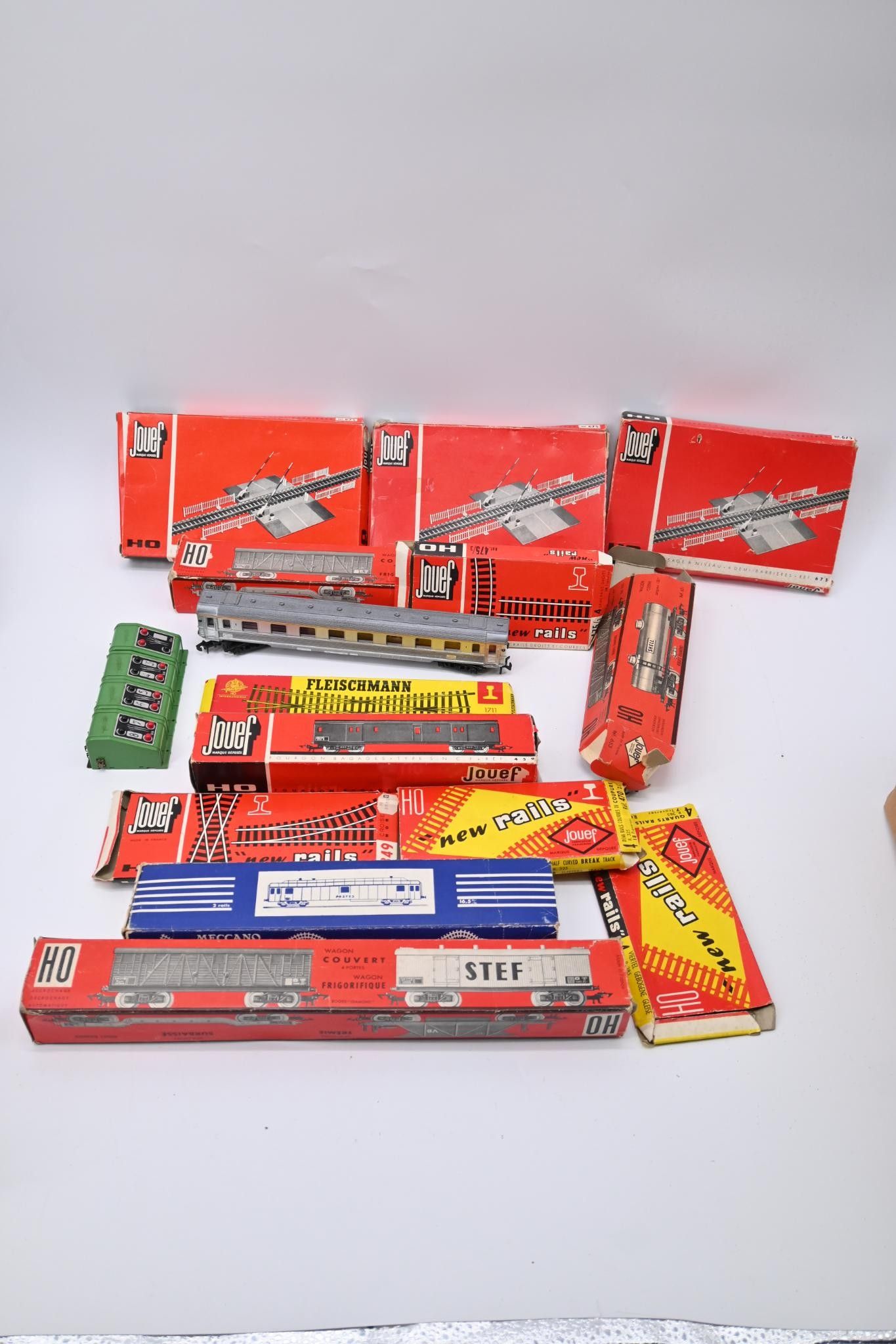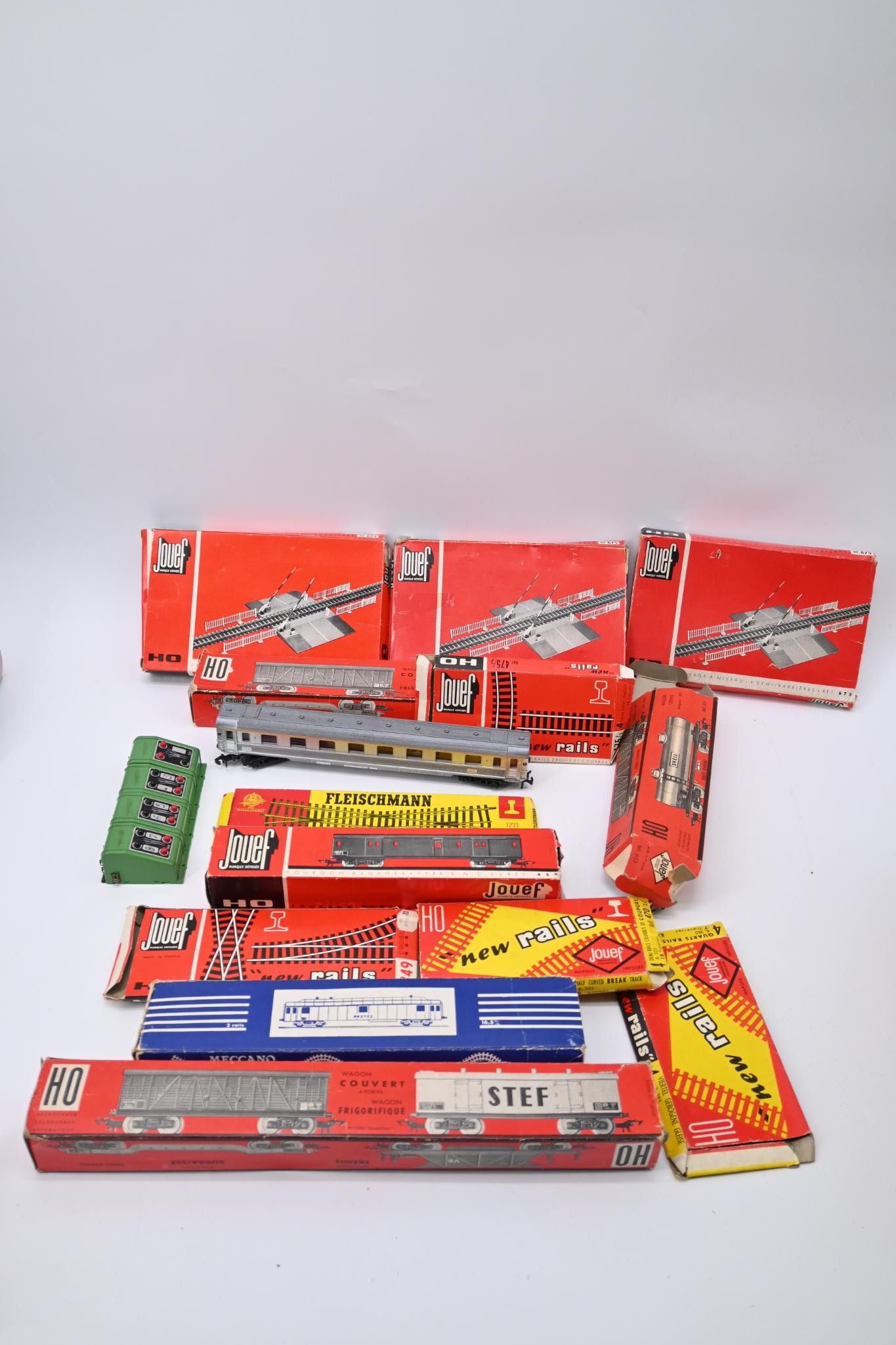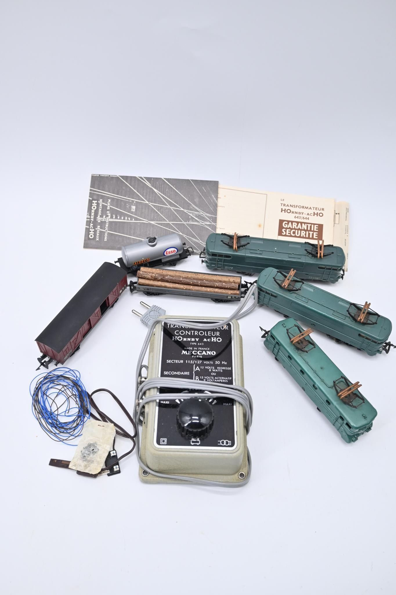 Lot de jouets anciens : voitures russes, JOUEF, HORNBY-ACHO, rails et transformateur.
