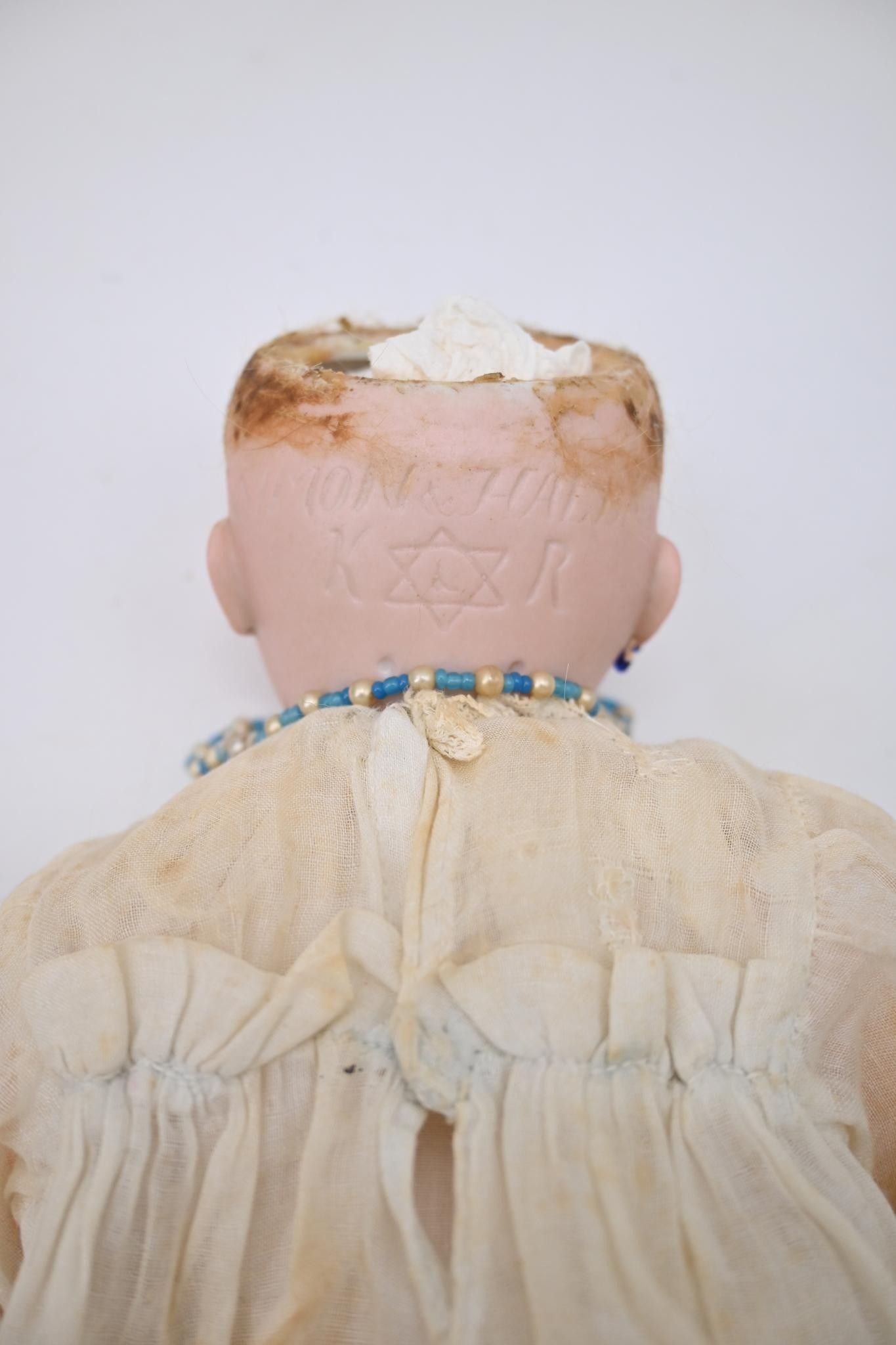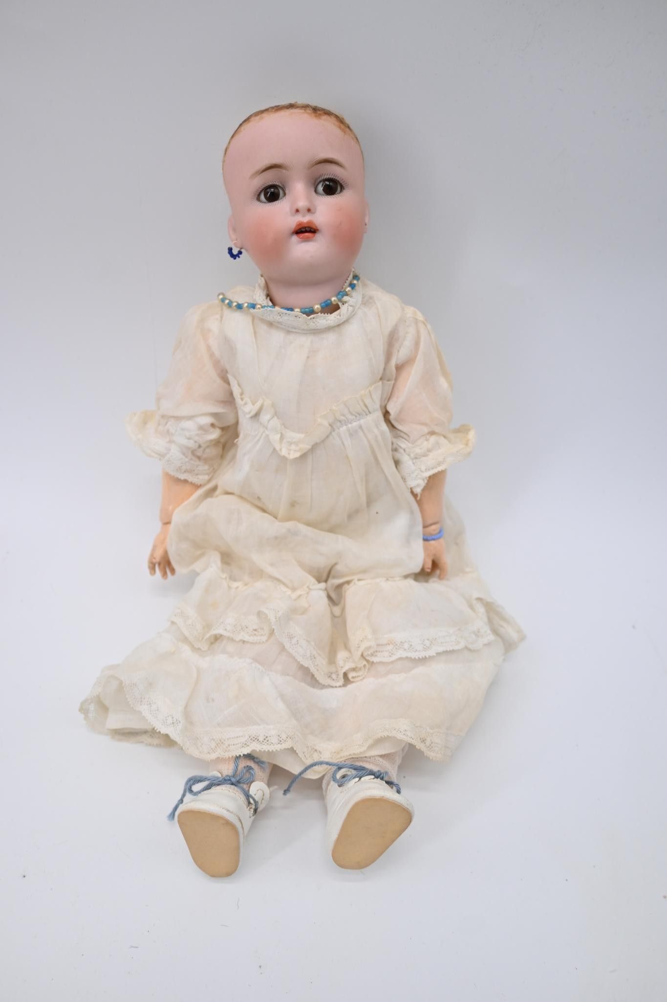 Simon & Halbic- Poupée tête en porcelaine avec corps et bras articulés en composition. Yeux fixe marrons, bouche entrouverte.