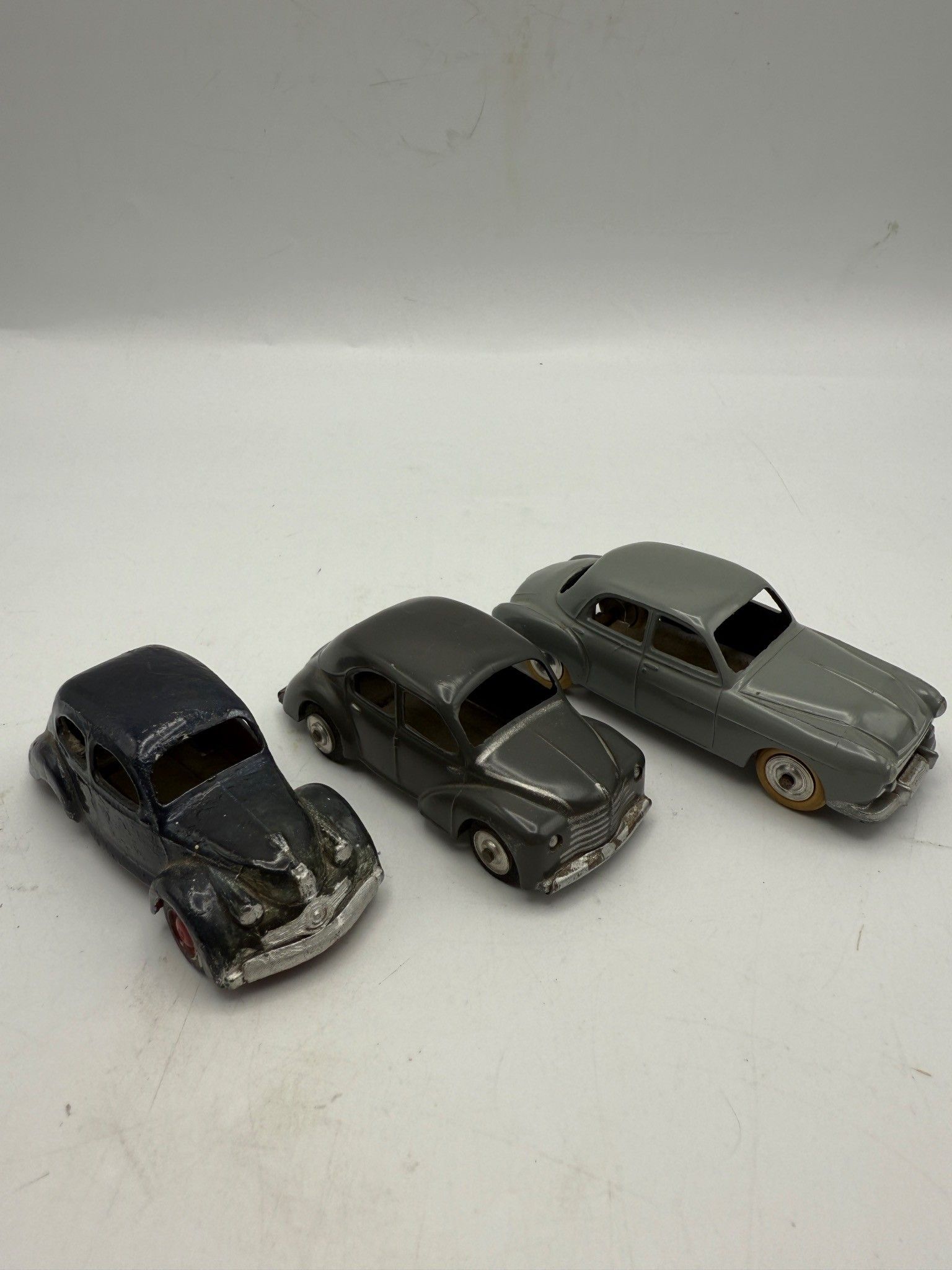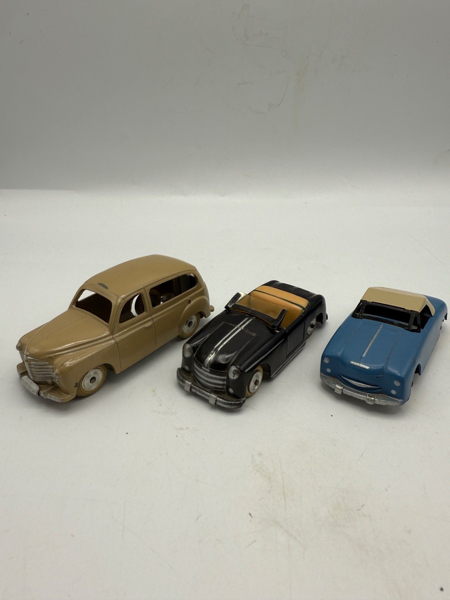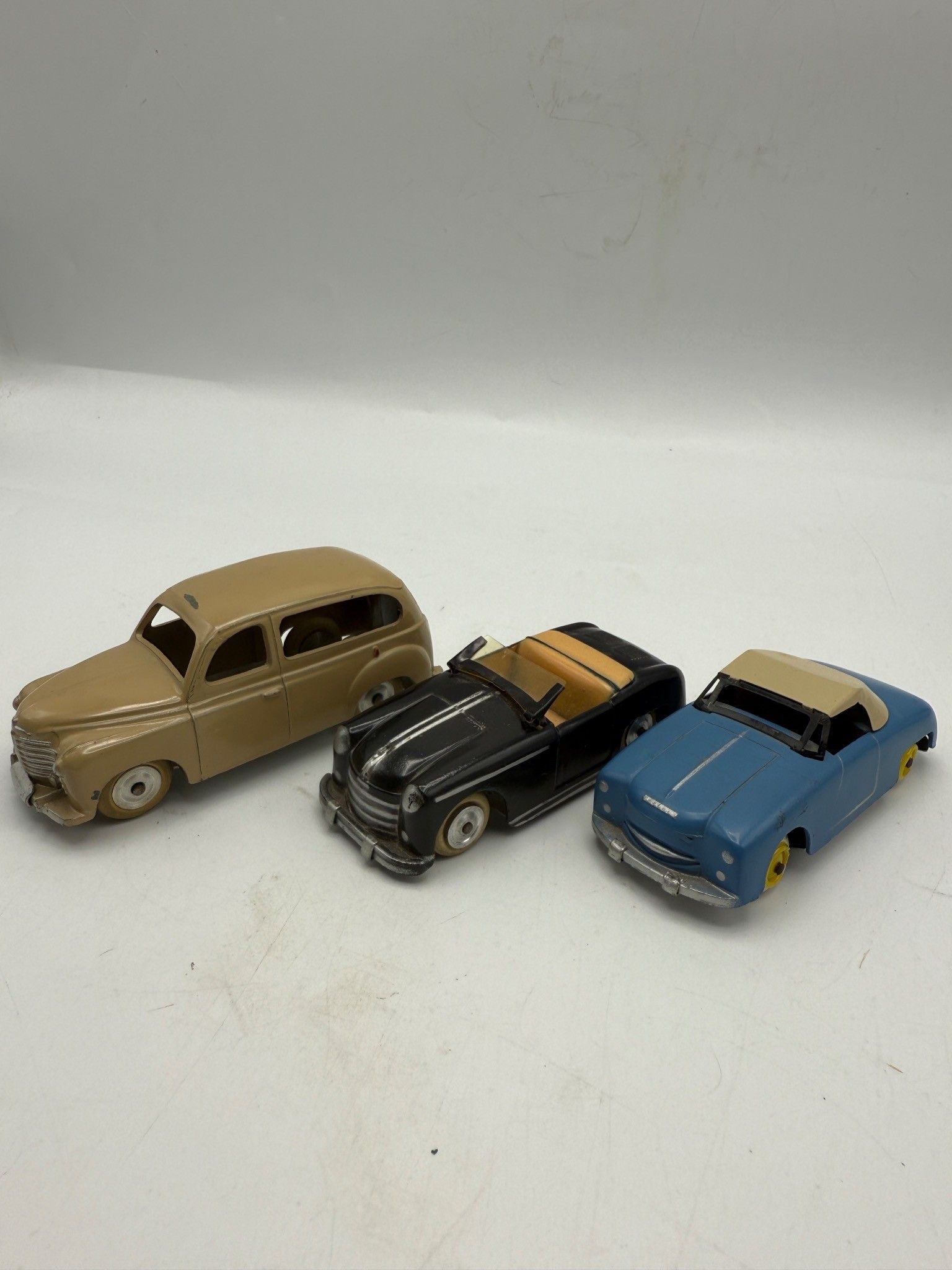 C.I.J Renault Savane beige, La Frégate Renault grise, C.I.J R de Rovin noire, C.I.J Dyna Junior bleu, 4 cv grise et Panhard bleu.