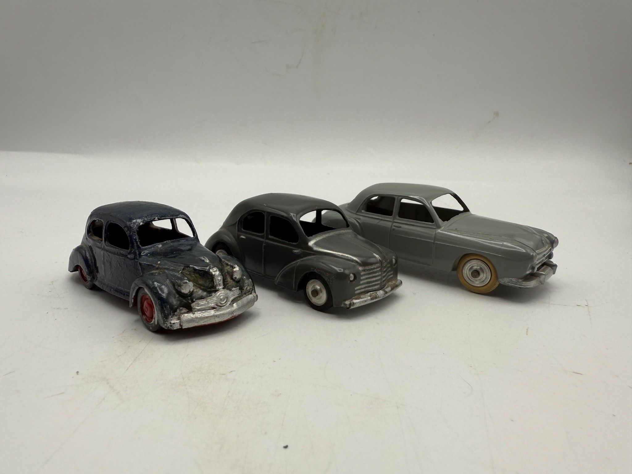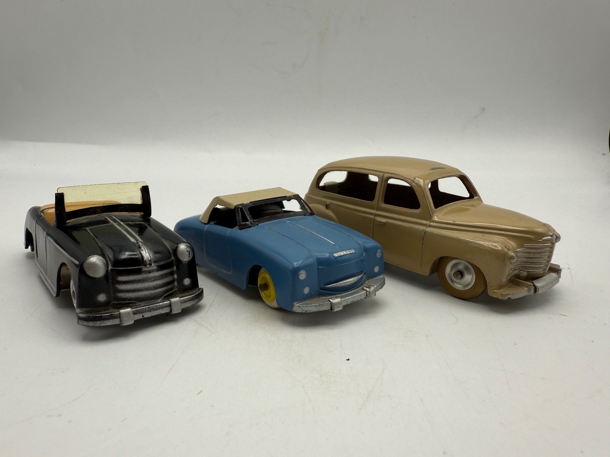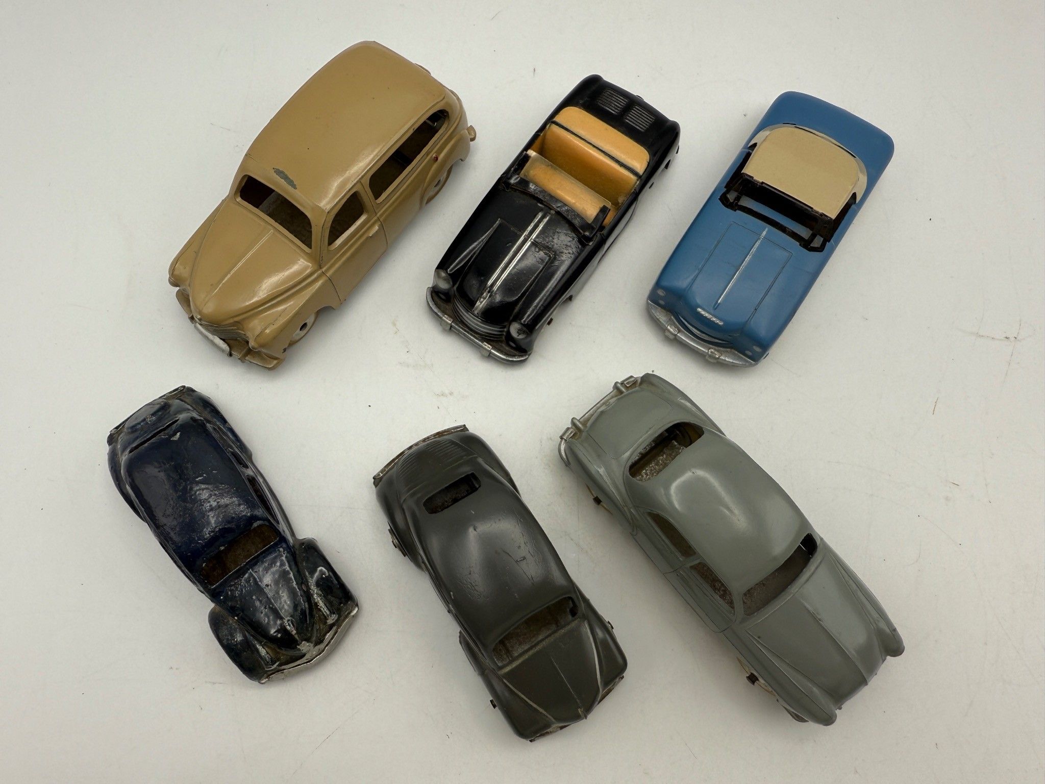C.I.J Renault Savane beige, La Frégate Renault grise, C.I.J R de Rovin noire, C.I.J Dyna Junior bleu, 4 cv grise et Panhard bleu.