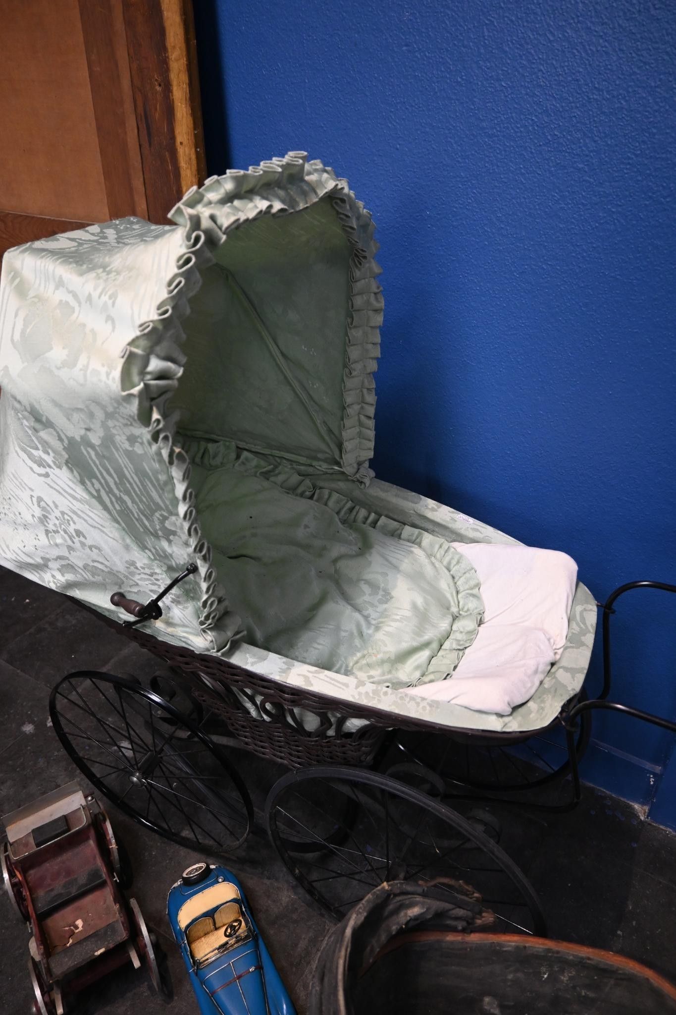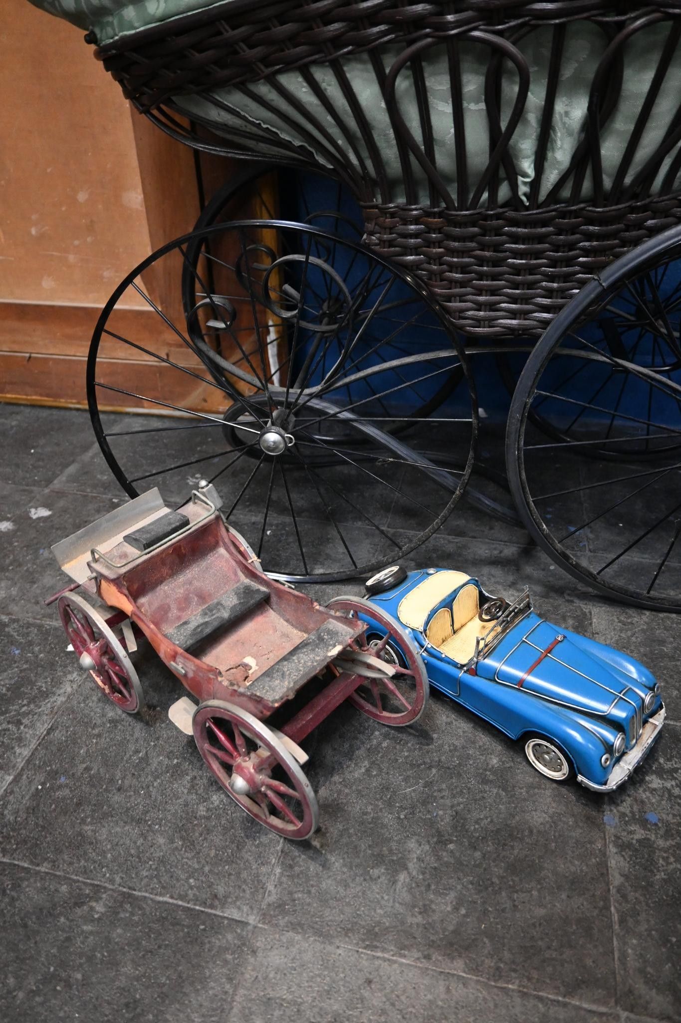 Lot de quatre voitures comprenant un landeau structure en fer forgé, panier en osier, garniture en soie verte (poignée rapportée) 110 x 90 x 45 cm environ, un petit landeau structure en fer forgé, panier en osier 48 x 47 x 28 cm, une petite voiture/calèche par la Marquise de Sévigné à Paris en bois et métal et une voiture décapotable en tôle polychrome.