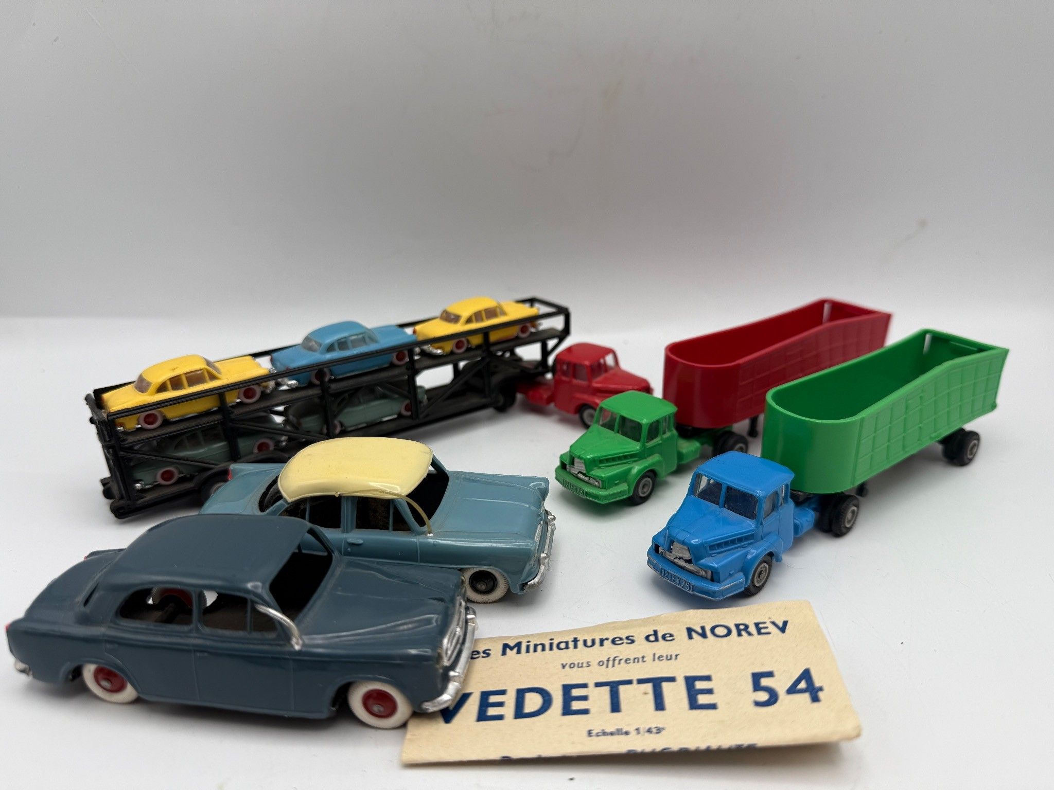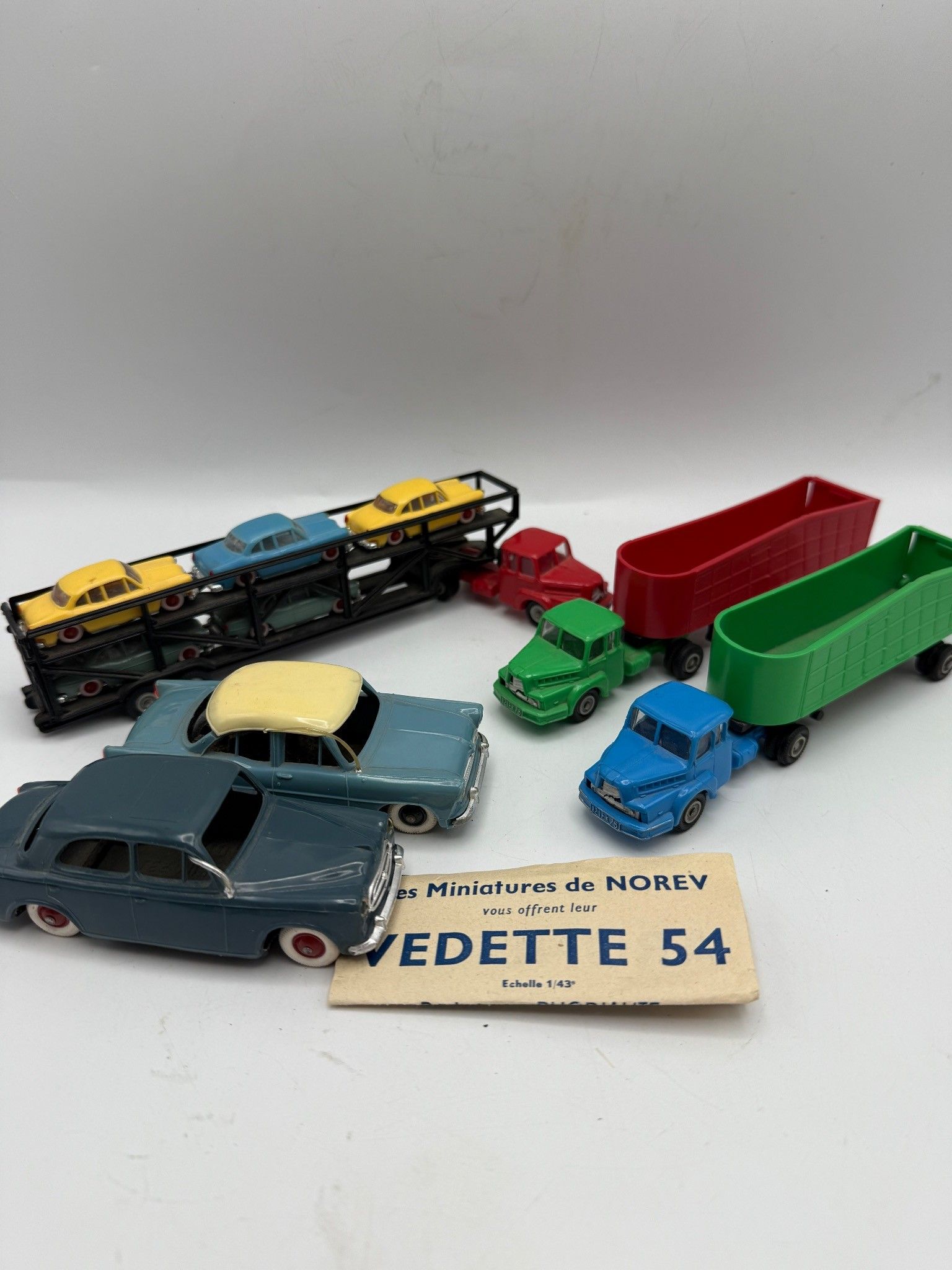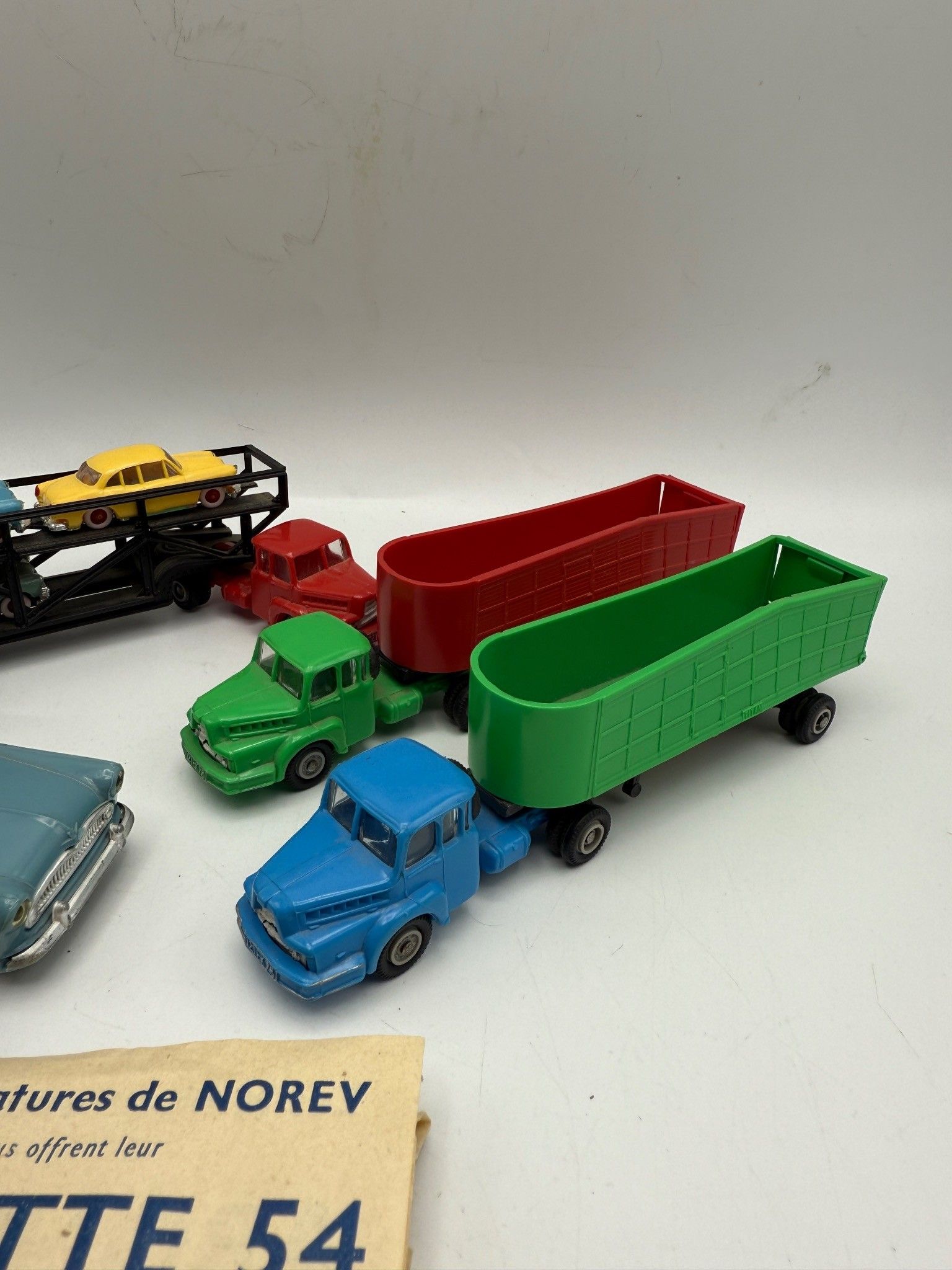 NOREV. Simca Versailles moteur à friction bleu et crème. Peugeot 403 bleu. Trois camions tracteurs UNIC, deux à remorques TITAN et une à remorque porte-voitures avec cinq Simca Versailles dessus. Très bon état.