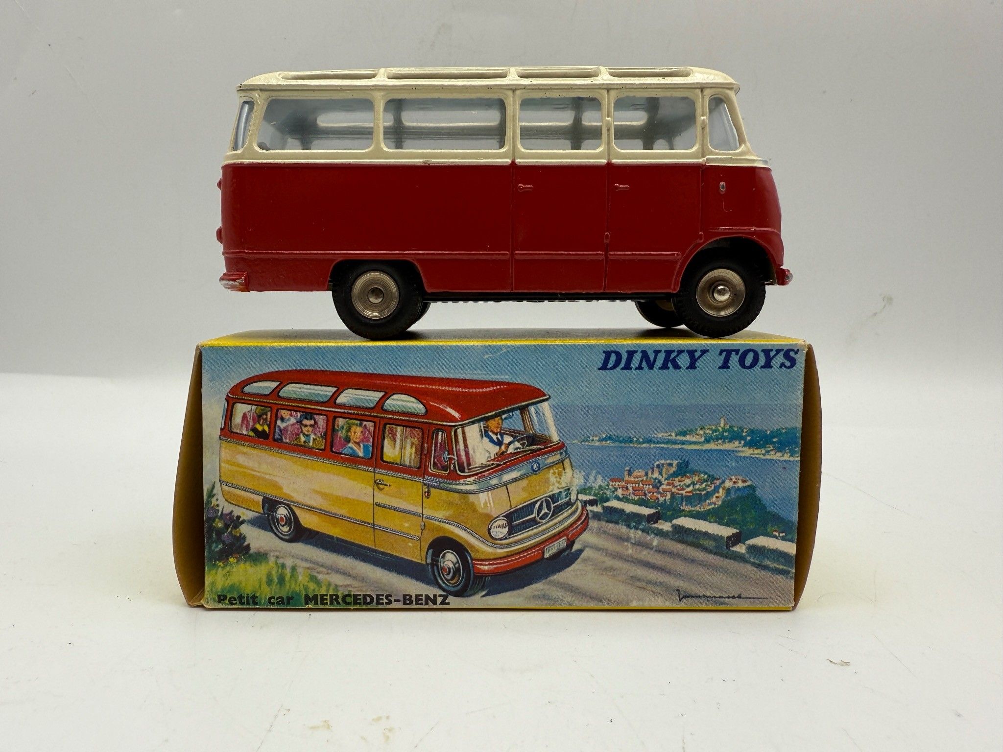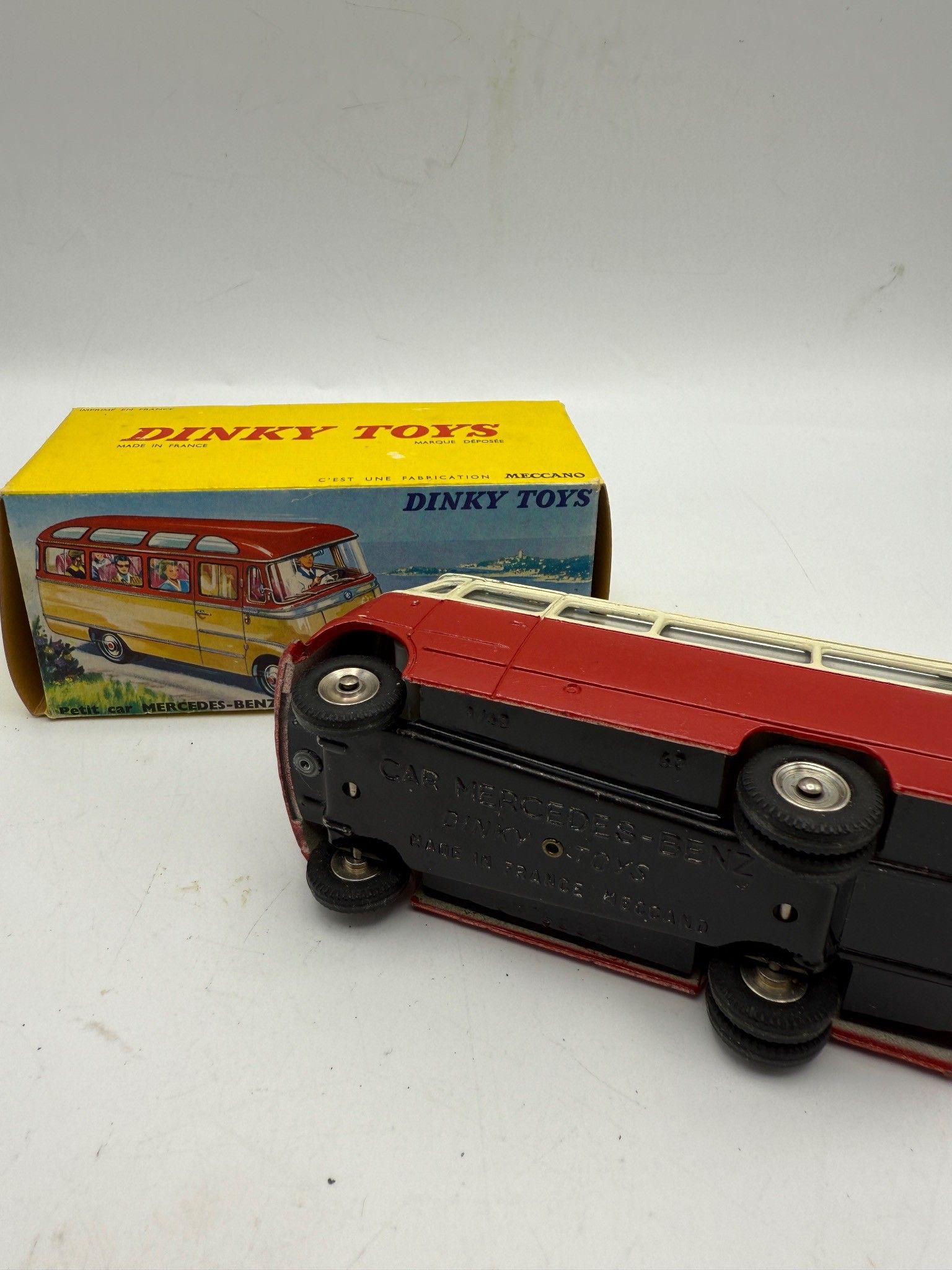 DINKY TOYS France, ref. 541, petit car Mercedes-Benz, rouge et blanc, avec vitres. Parfait état.
